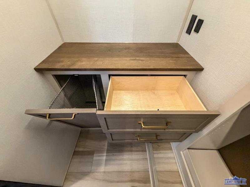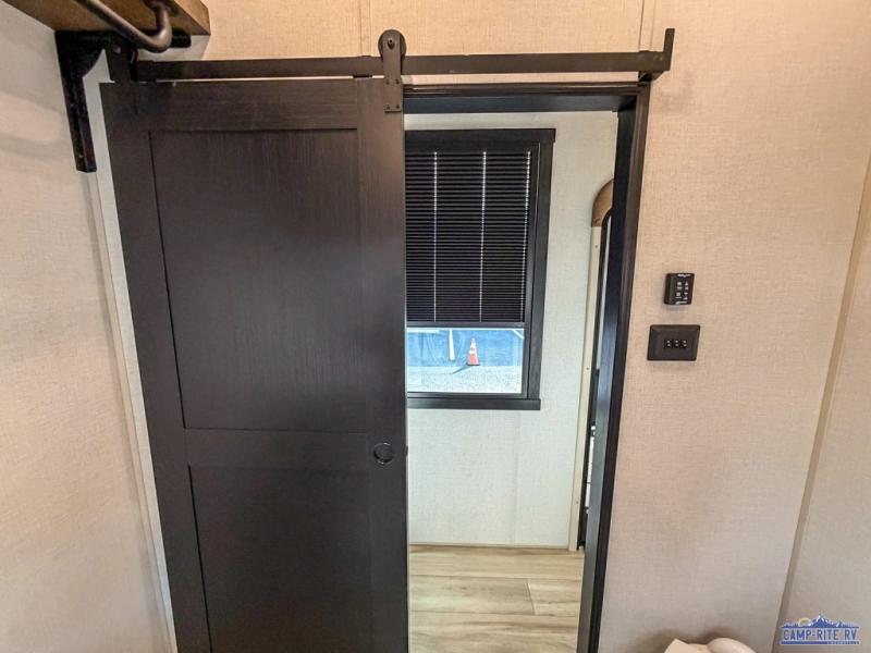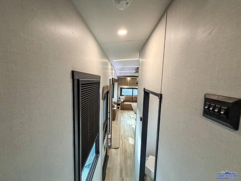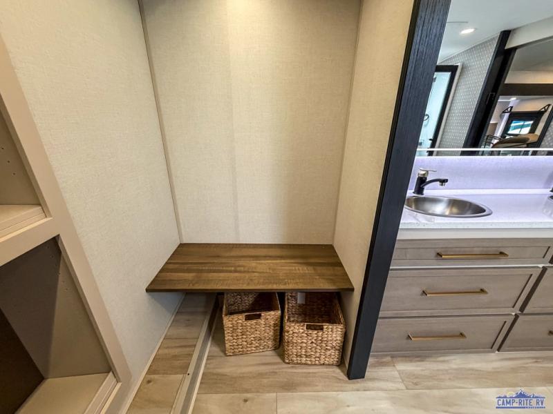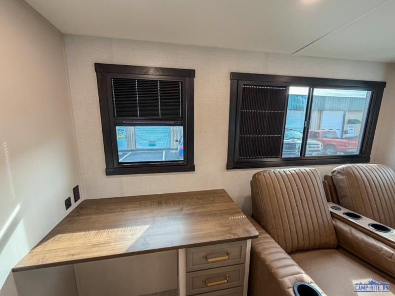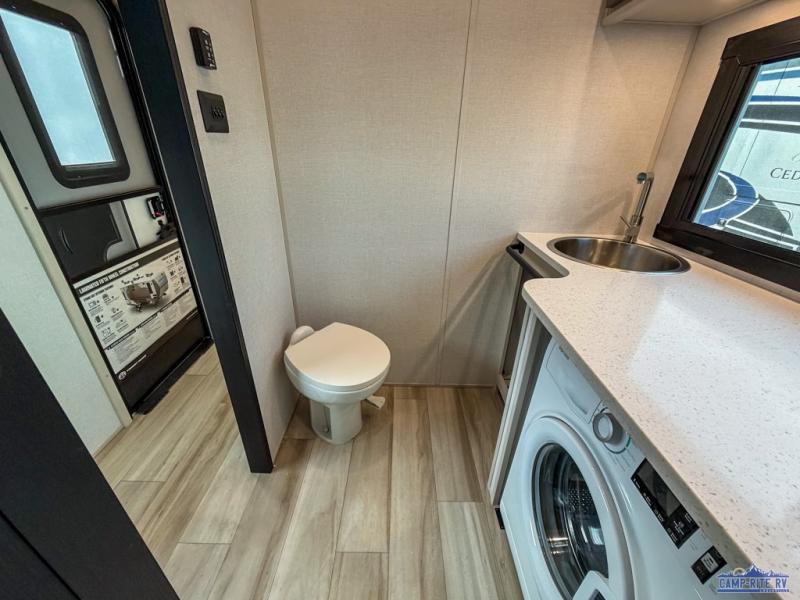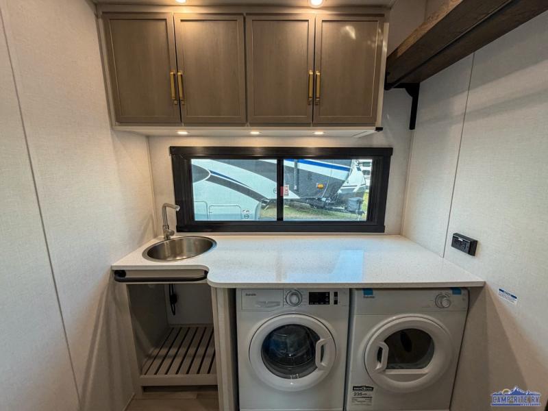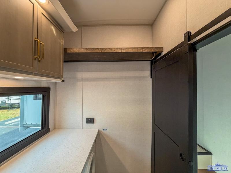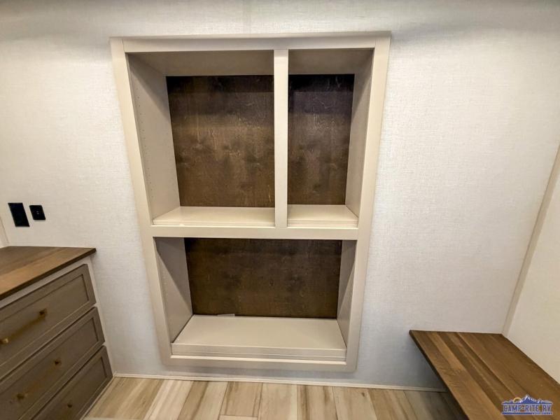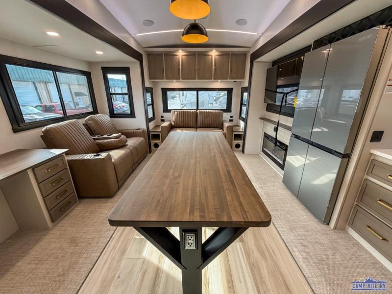 One look at this fifth wheel and you'll be sold! You can wake up each morning in the master bedroom that includes a custom king bed and a dresser with an ottoman. The front full bath has two bath sinks so you both can get ready at once, and you're going to love the walk-in wardrobe with wrap-around hanging rod. A half bath includes a floating shelf with a hanging rod plus washer/dryer prep, giving you the option to make this a laundry room! The back of this unit is where you can cook meals with full kitchen amenities, dine at the kitchen island with four chairs, and relax on the theater seating and tri-fold sofa. A 50" TV and fireplace is also found here, complete with hidden storage behind for board games, movies, and snacks!