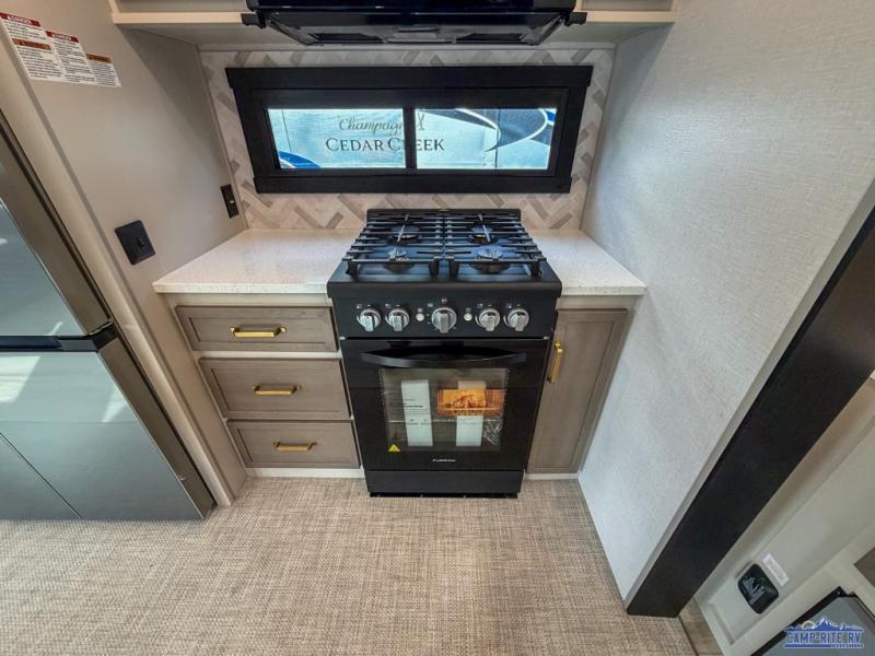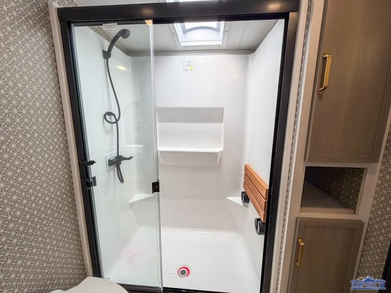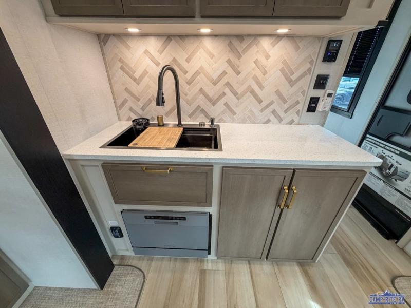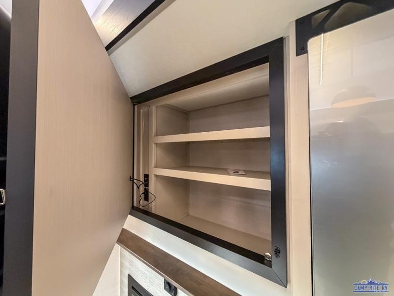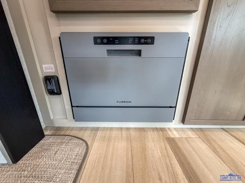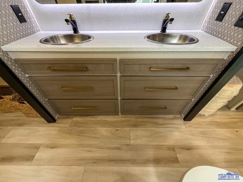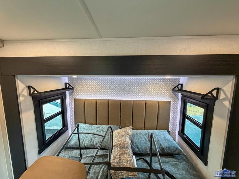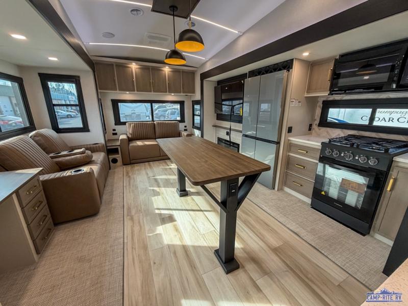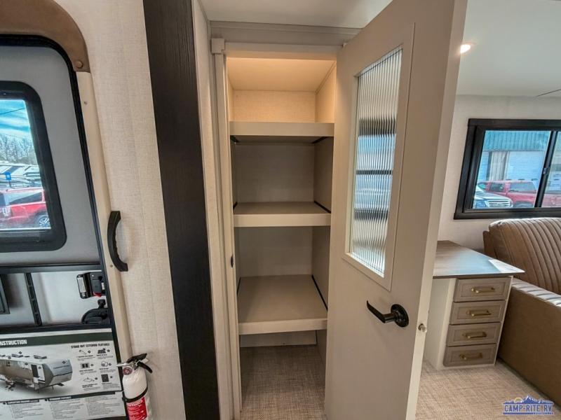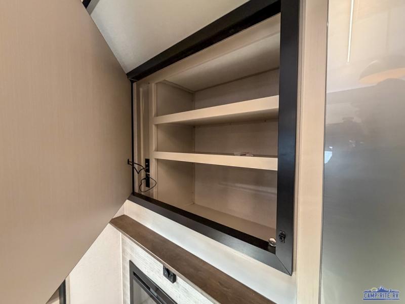 One look at this fifth wheel and you'll be sold! You can wake up each morning in the master bedroom that includes a custom king bed and a dresser with an ottoman. The front full bath has two bath sinks so you both can get ready at once, and you're going to love the walk-in wardrobe with wrap-around hanging rod. A half bath includes a floating shelf with a hanging rod plus washer/dryer prep, giving you the option to make this a laundry room! The back of this unit is where you can cook meals with full kitchen amenities, dine at the kitchen island with four chairs, and relax on the theater seating and tri-fold sofa. A 50" TV and fireplace is also found here, complete with hidden storage behind for board games, movies, and snacks!