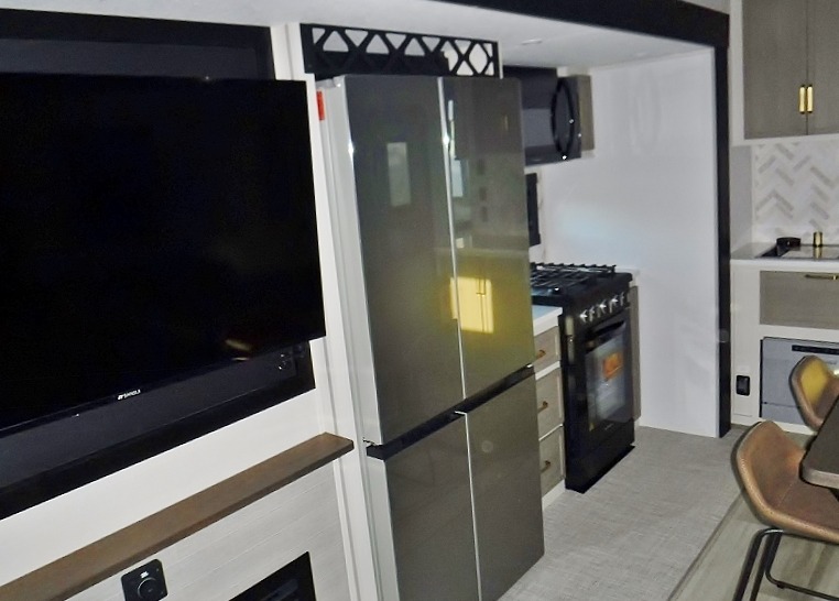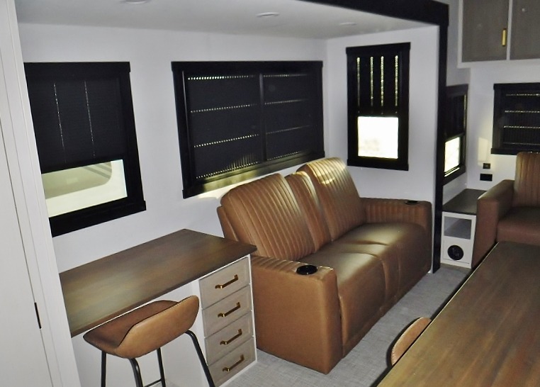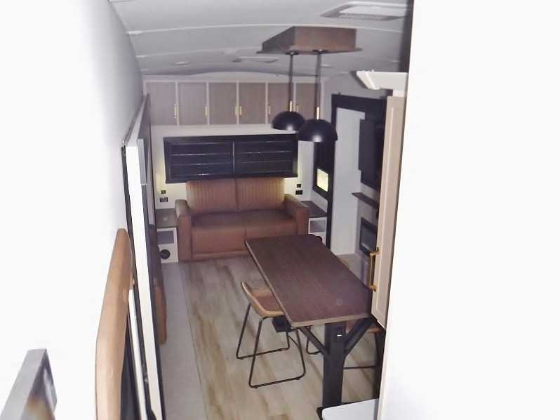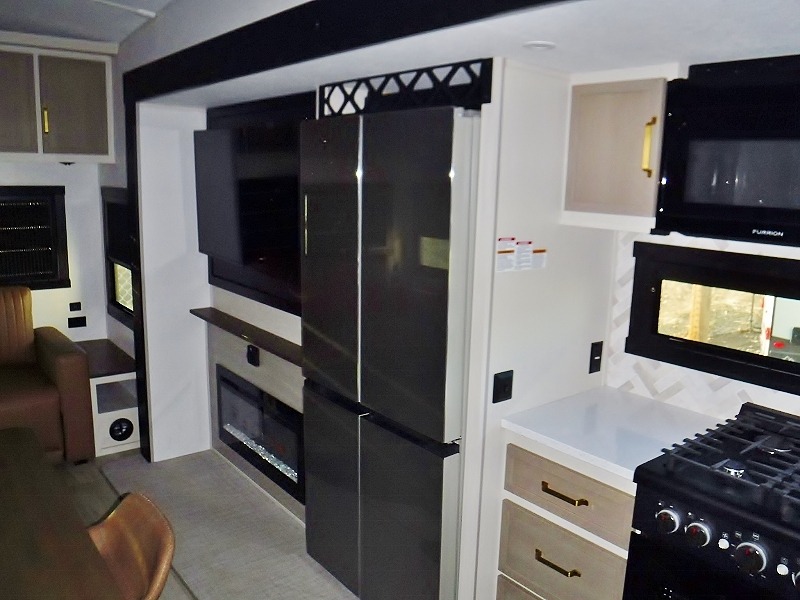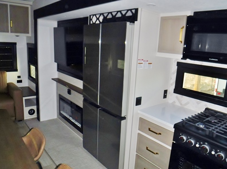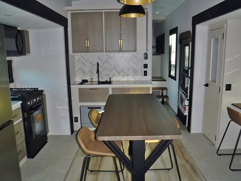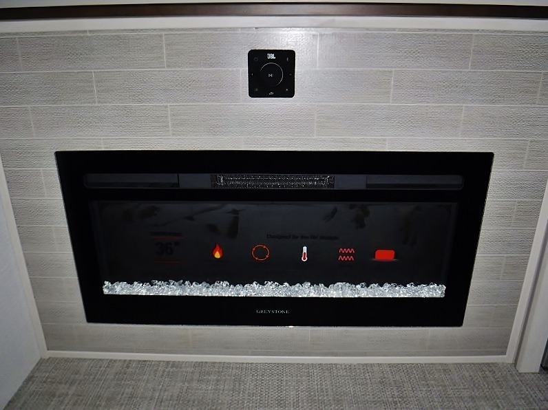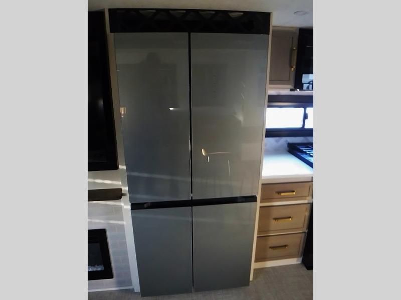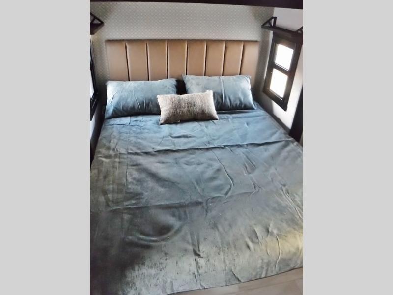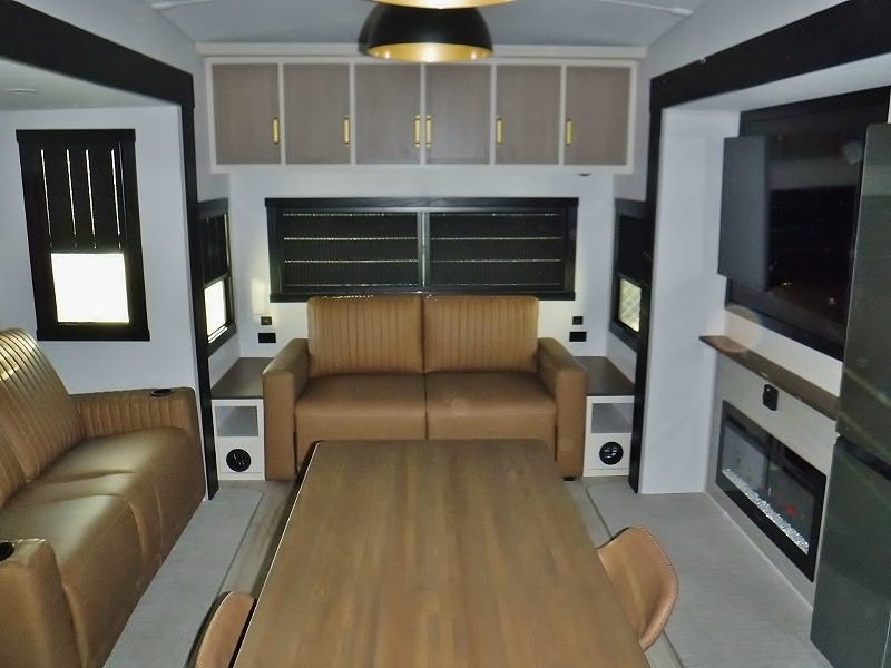 One look at this fifth wheel and you'll be sold! You can wake up each morning in the master bedroom that includes a custom king bed and a dresser with an ottoman. The front full bath has two bath sinks so you both can get ready at once, and you're going to love the walk-in wardrobe with wrap-around hanging rod. A half bath includes a floating shelf with a hanging rod plus washer/dryer prep, giving you the option to make this a laundry room! The back of this unit is where you can cook meals with full kitchen amenities, dine at the kitchen island with four chairs, and relax on the theater seating and tri-fold sofa. A 50" TV and fireplace is also found here, complete with hidden storage behind for board games, movies, and snacks!