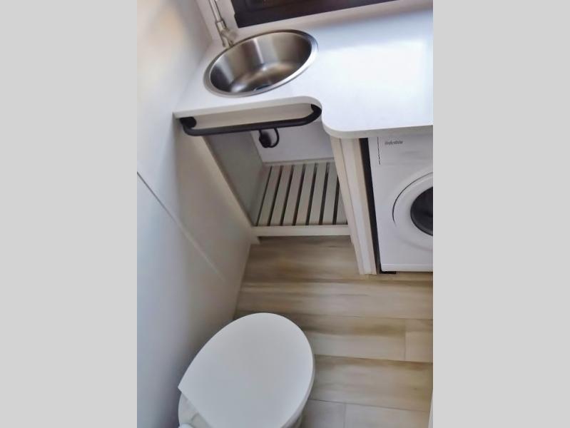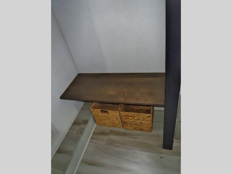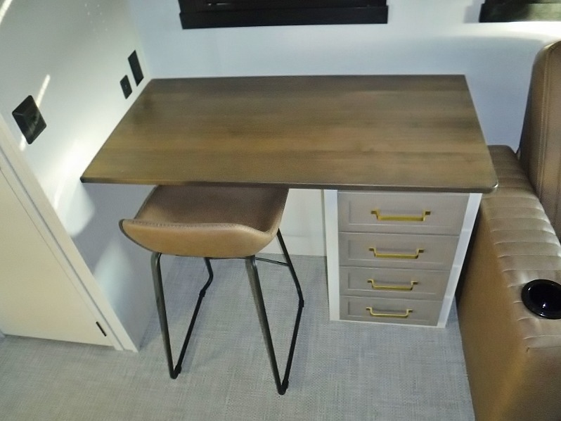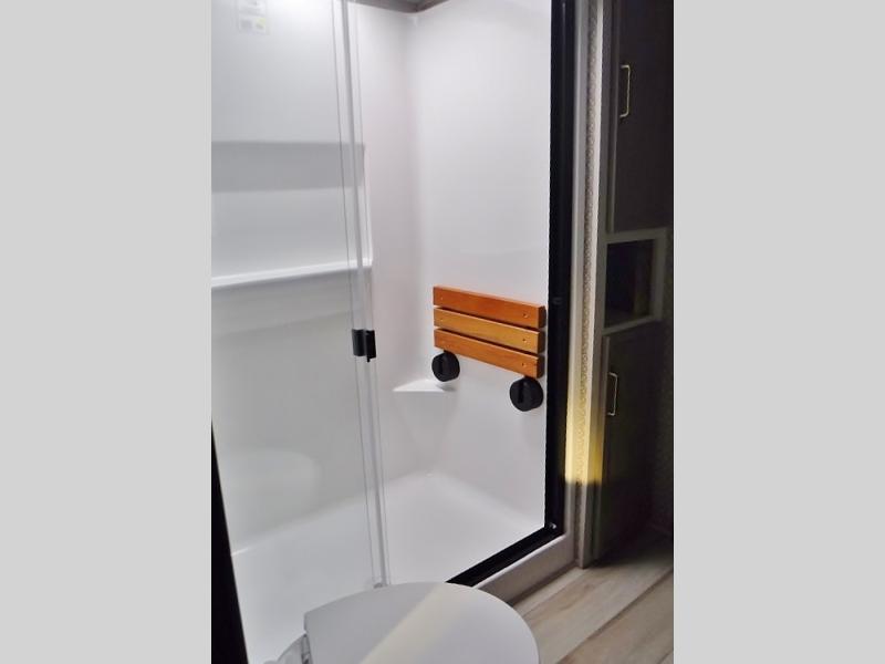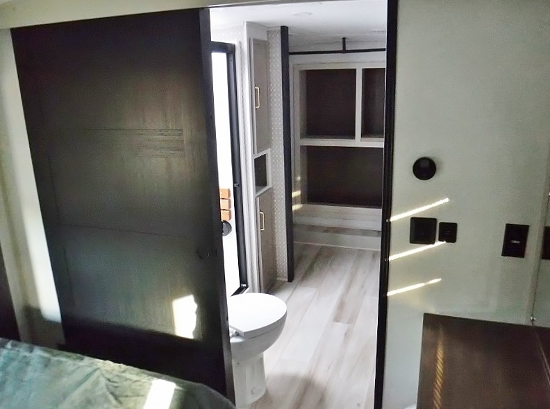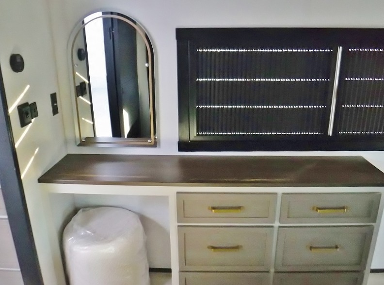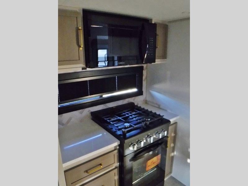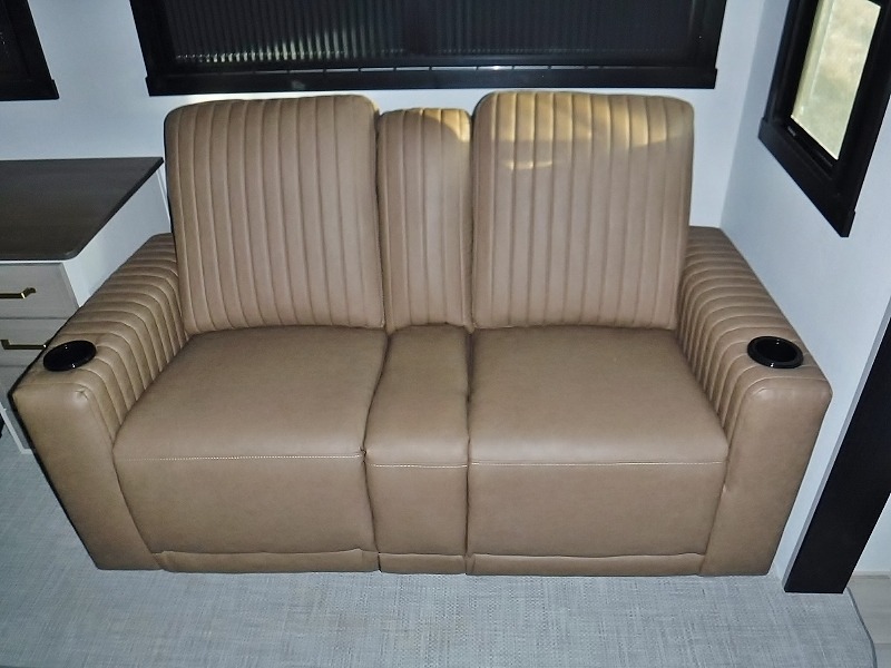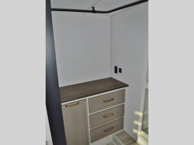One look at this fifth wheel and you'll be sold! You can wake up each morning in the master bedroom that includes a custom king bed and a dresser with an ottoman. The front full bath has two bath sinks so you both can get ready at once, and you're going to love the walk-in wardrobe with wrap-around hanging rod. A half bath includes a floating shelf with a hanging rod plus washer/dryer prep, giving you the option to make this a laundry room! The back of this unit is where you can cook meals with full kitchen amenities, dine at the kitchen island with four chairs, and relax on the theater seating and tri-fold sofa. A 50" TV and fireplace is also found here, complete with hidden storage behind for board games, movies, and snacks!