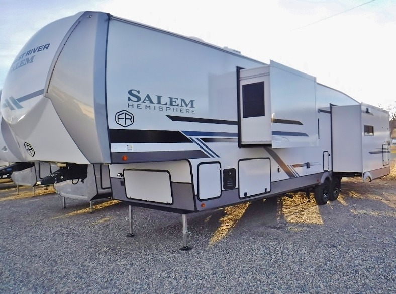 The Salem Hemisphere fifth wheels by Forest River are packed with features, while still being value-minded! Each model is constructed with laminated "Aluma Frame" sidewalls and floor with block foam insulation plus full-length barreled ceilings for added head space. There are LED awning, marker and taillights outside, along with an extra-large pass-thru storage with slam latch baggage doors, plus solar prep and Lippert On-The-Go ladder prep. The 60K on-demand tankless water heater will provide endless hot showers, and the JBL sound system includes a head unit plus interior and exterior speakers to keep the party going. There are also many interior comforts found throughout that will make you feel right at home!
