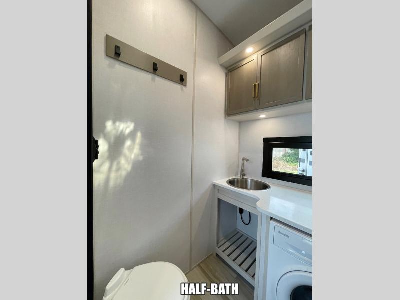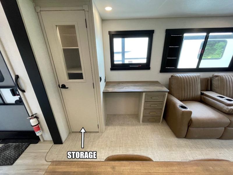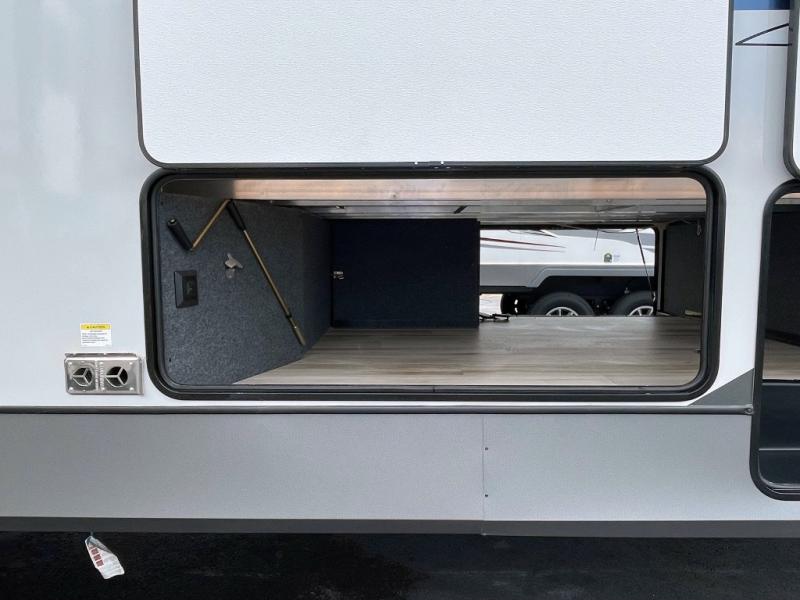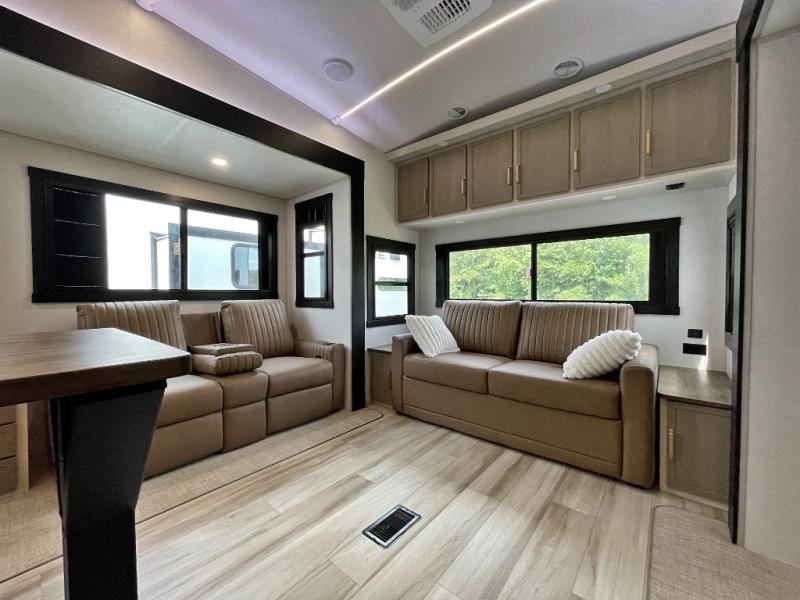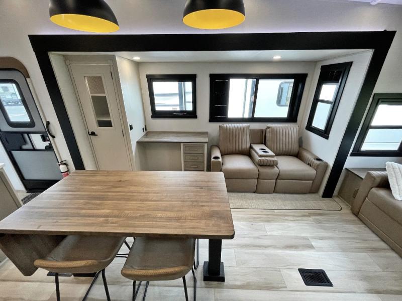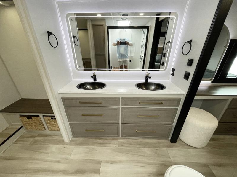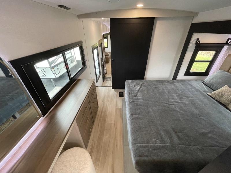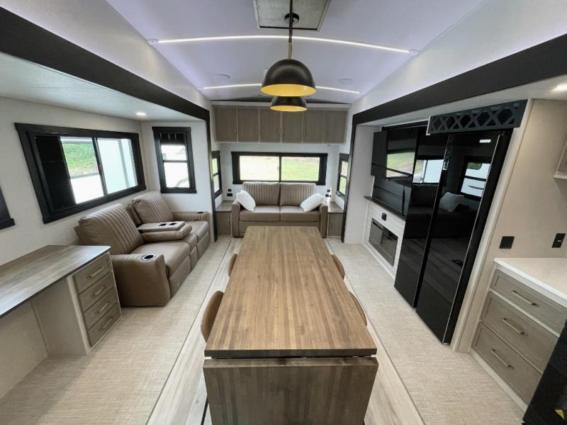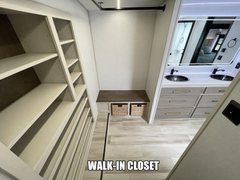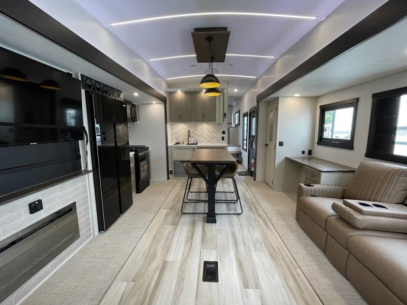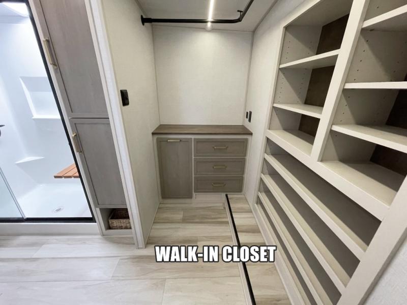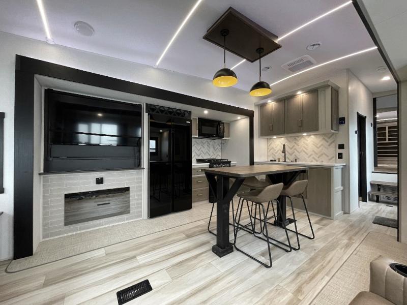 One look at this fifth wheel and you'll be sold! You can wake up each morning in the master bedroom that includes a custom king bed and a dresser with an ottoman. The front full bath has two bath sinks so you both can get ready at once, and you're going to love the walk-in wardrobe with wrap-around hanging rod. A half bath includes a floating shelf with a hanging rod plus washer/dryer prep, giving you the option to make this a laundry room! The back of this unit is where you can cook meals with full kitchen amenities, dine at the kitchen island with four chairs, and relax on the theater seating and tri-fold sofa. A 50" TV and fireplace is also found here, complete with hidden storage behind for board games, movies, and snacks!