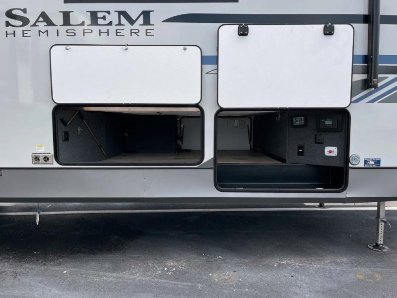 The Salem Hemisphere fifth wheels by Forest River are packed with features, while still being value-minded! Each model is constructed with laminated "Aluma Frame" sidewalls and floor with block foam insulation plus full-length barreled ceilings for added head space. There are LED awning, marker and taillights outside, along with an extra-large pass-thru storage with slam latch baggage doors, plus solar prep and Lippert On-The-Go ladder prep. The 60K on-demand tankless water heater will provide endless hot showers, and the JBL sound system includes a head unit plus interior and exterior speakers to keep the party going. There are also many interior comforts found throughout that will make you feel right at home!