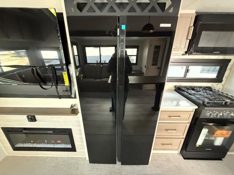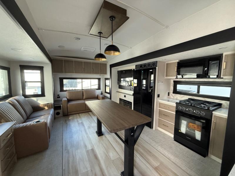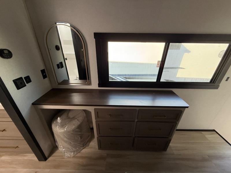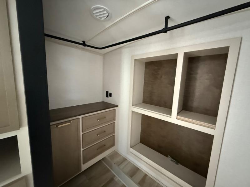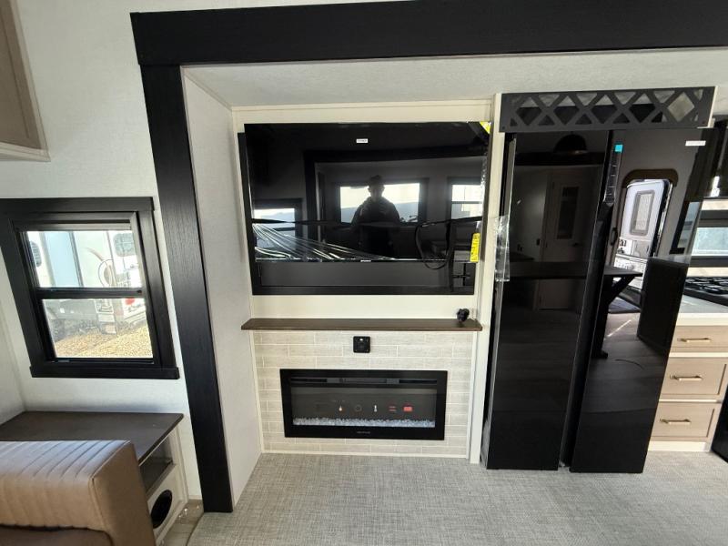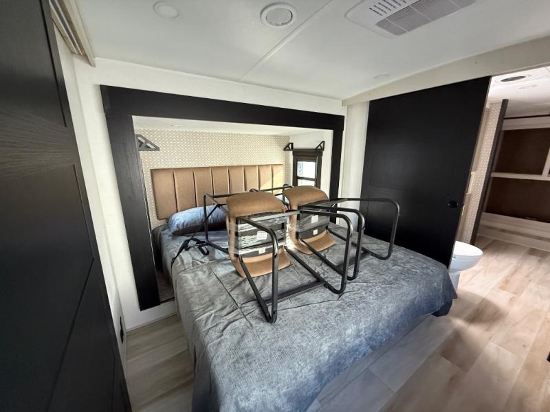 One look at this fifth wheel and you'll be sold! You can wake up each morning in the master bedroom that includes a custom king bed and a dresser with an ottoman. The front full bath has two bath sinks so you both can get ready at once, and you're going to love the walk-in wardrobe with wrap-around hanging rod. A half bath includes a floating shelf with a hanging rod plus washer/dryer prep, giving you the option to make this a laundry room! The back of this unit is where you can cook meals with full kitchen amenities, dine at the kitchen island with four chairs, and relax on the theater seating and tri-fold sofa. A 50" TV and fireplace is also found here, complete with hidden storage behind for board games, movies, and snacks!