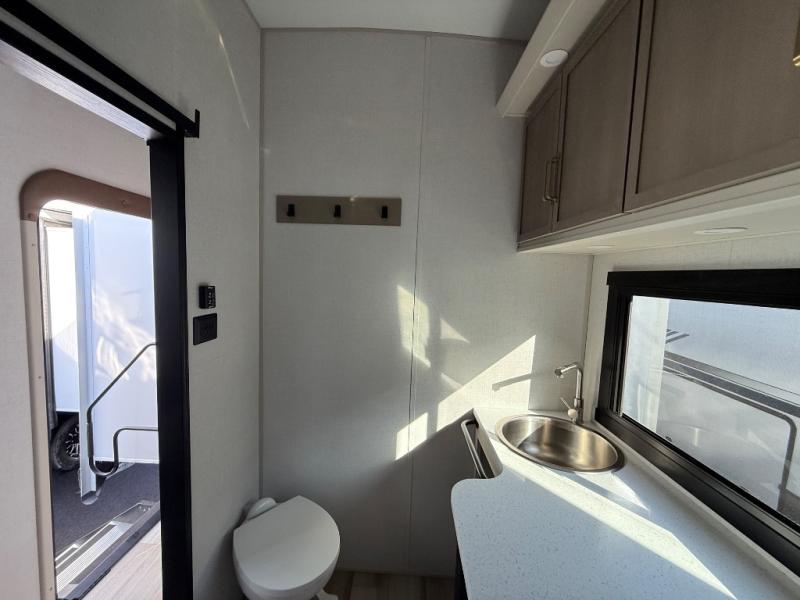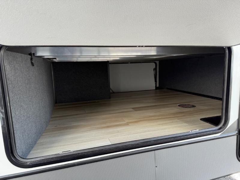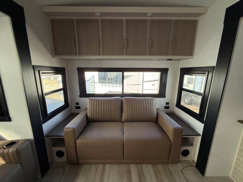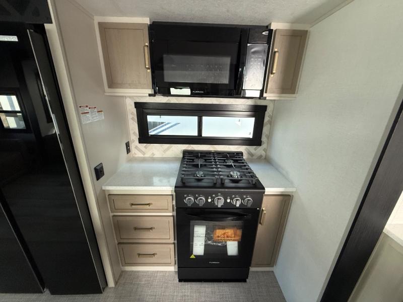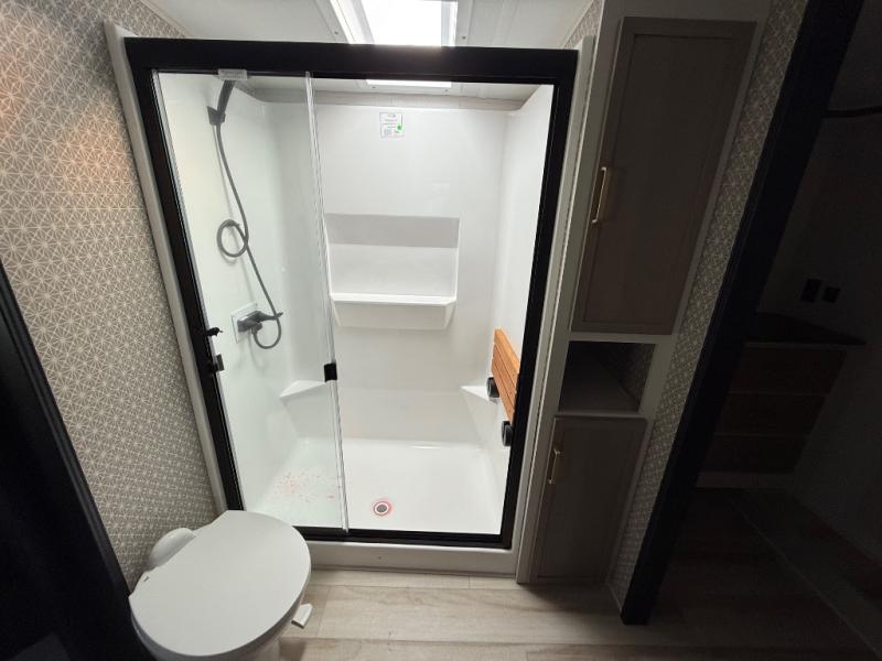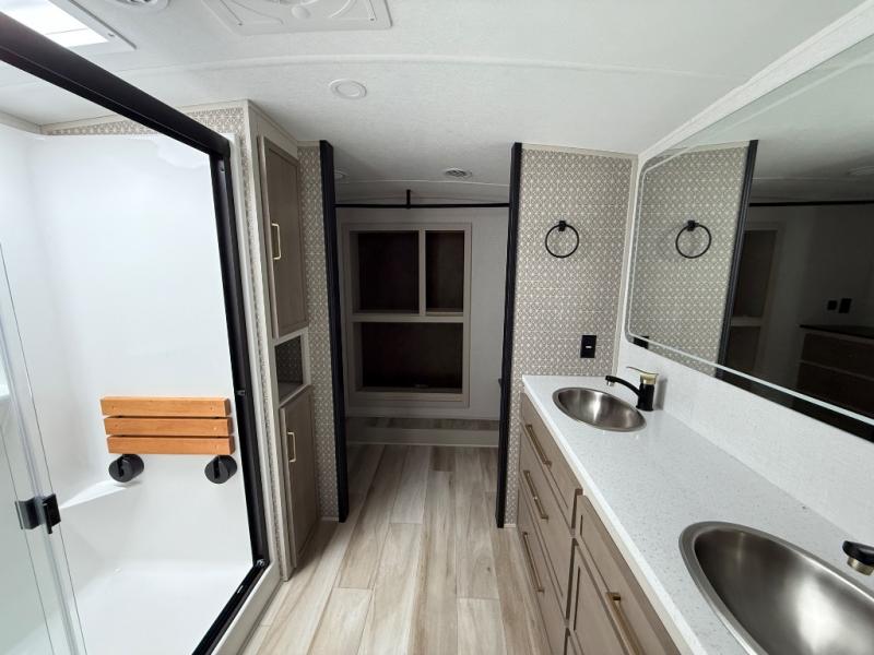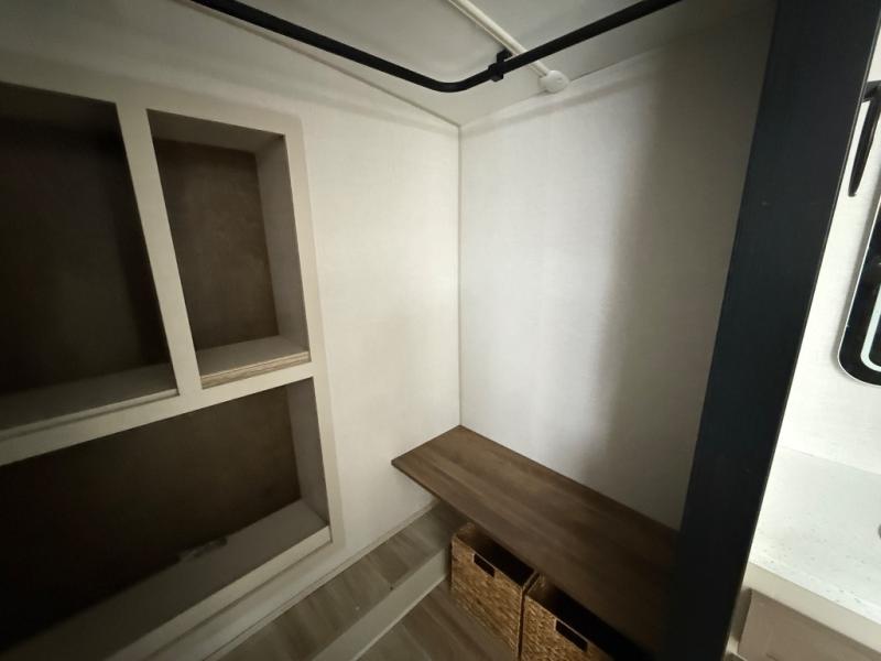 One look at this fifth wheel and you'll be sold! You can wake up each morning in the master bedroom that includes a custom king bed and a dresser with an ottoman. The front full bath has two bath sinks so you both can get ready at once, and you're going to love the walk-in wardrobe with wrap-around hanging rod. A half bath includes a floating shelf with a hanging rod plus washer/dryer prep, giving you the option to make this a laundry room! The back of this unit is where you can cook meals with full kitchen amenities, dine at the kitchen island with four chairs, and relax on the theater seating and tri-fold sofa. A 50" TV and fireplace is also found here, complete with hidden storage behind for board games, movies, and snacks!