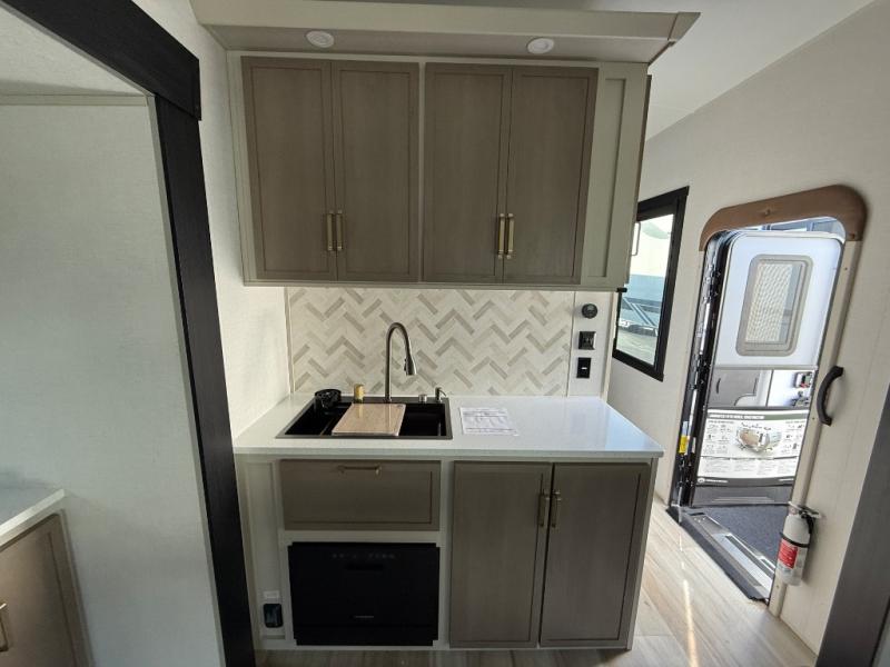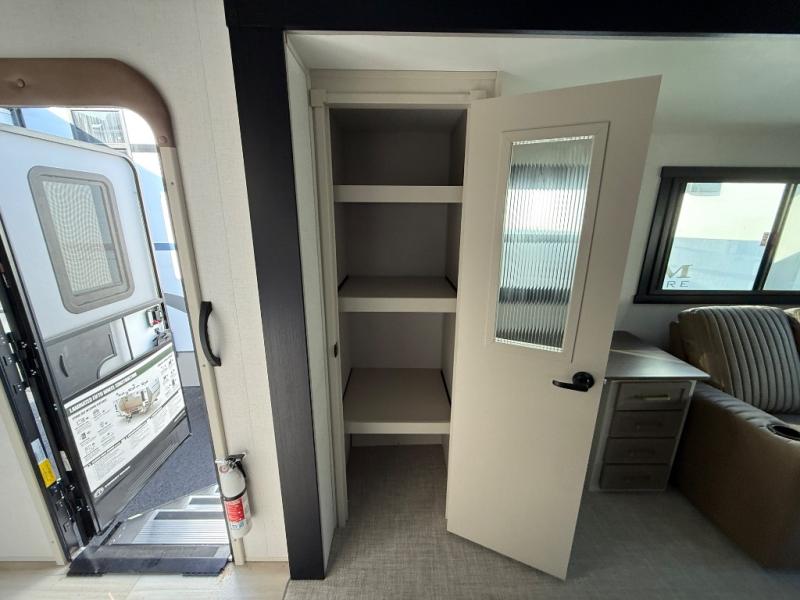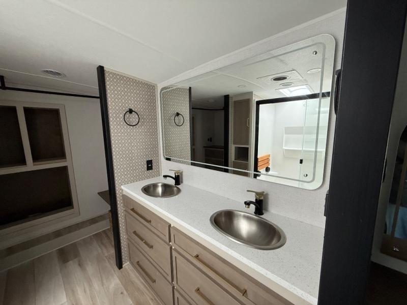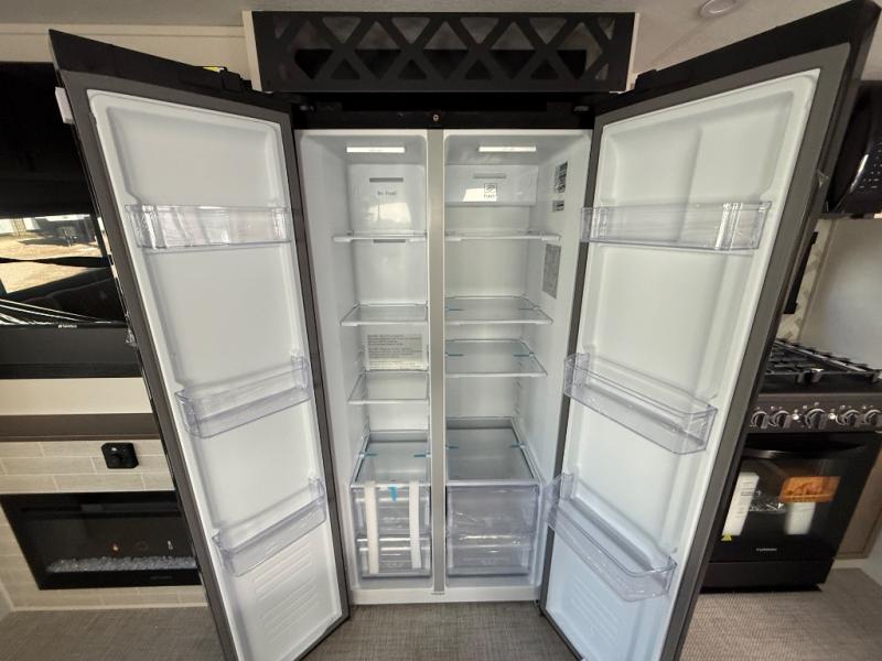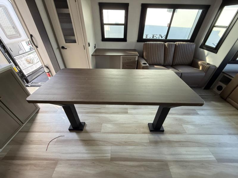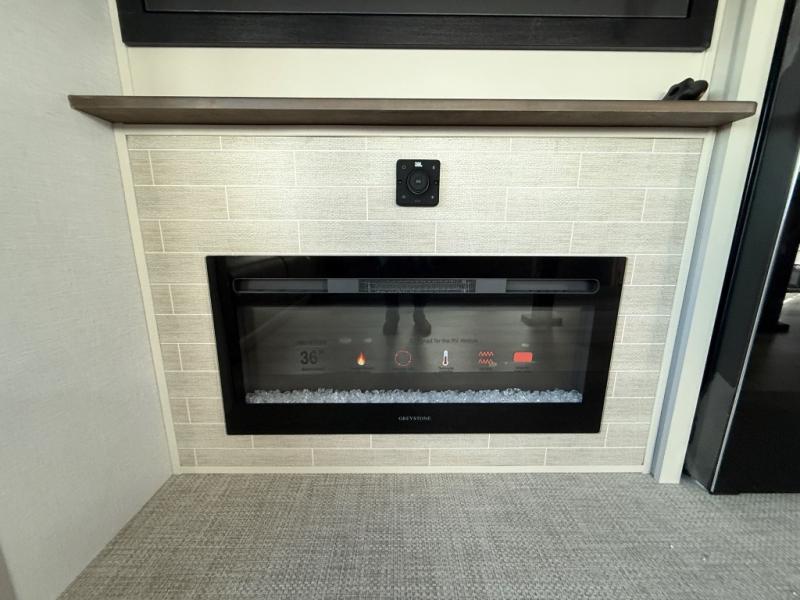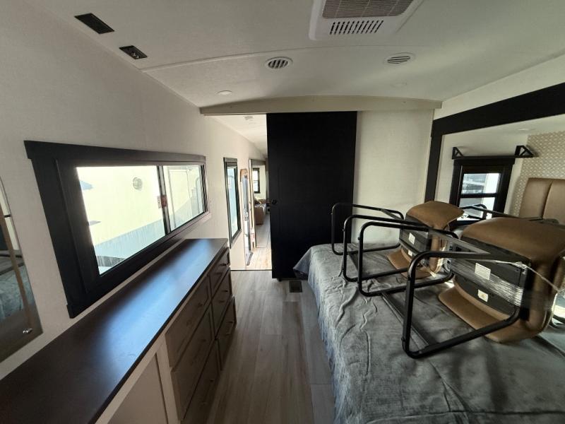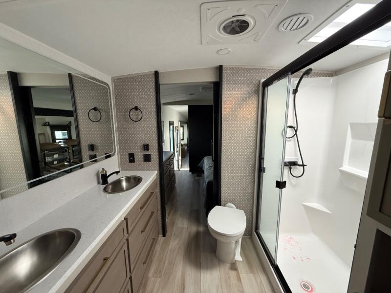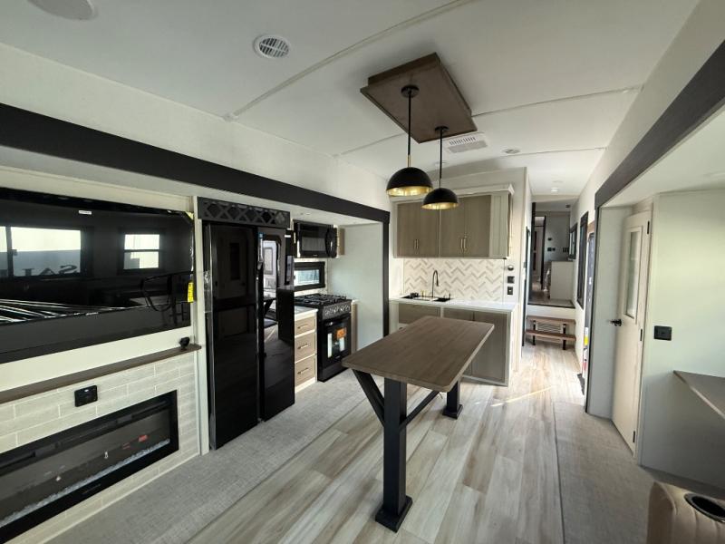 One look at this fifth wheel and you'll be sold! You can wake up each morning in the master bedroom that includes a custom king bed and a dresser with an ottoman. The front full bath has two bath sinks so you both can get ready at once, and you're going to love the walk-in wardrobe with wrap-around hanging rod. A half bath includes a floating shelf with a hanging rod plus washer/dryer prep, giving you the option to make this a laundry room! The back of this unit is where you can cook meals with full kitchen amenities, dine at the kitchen island with four chairs, and relax on the theater seating and tri-fold sofa. A 50" TV and fireplace is also found here, complete with hidden storage behind for board games, movies, and snacks!