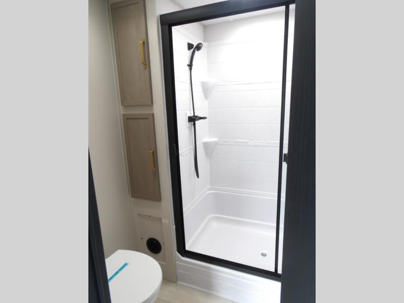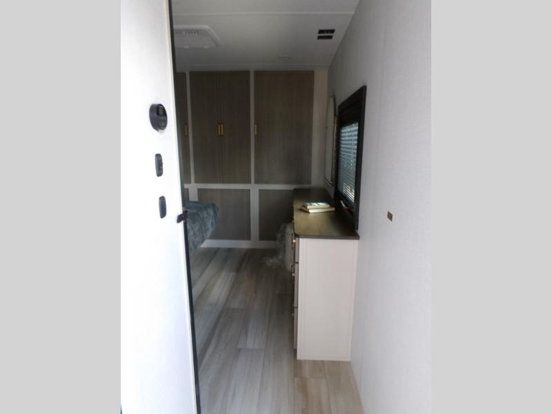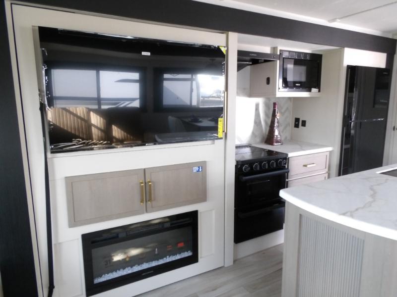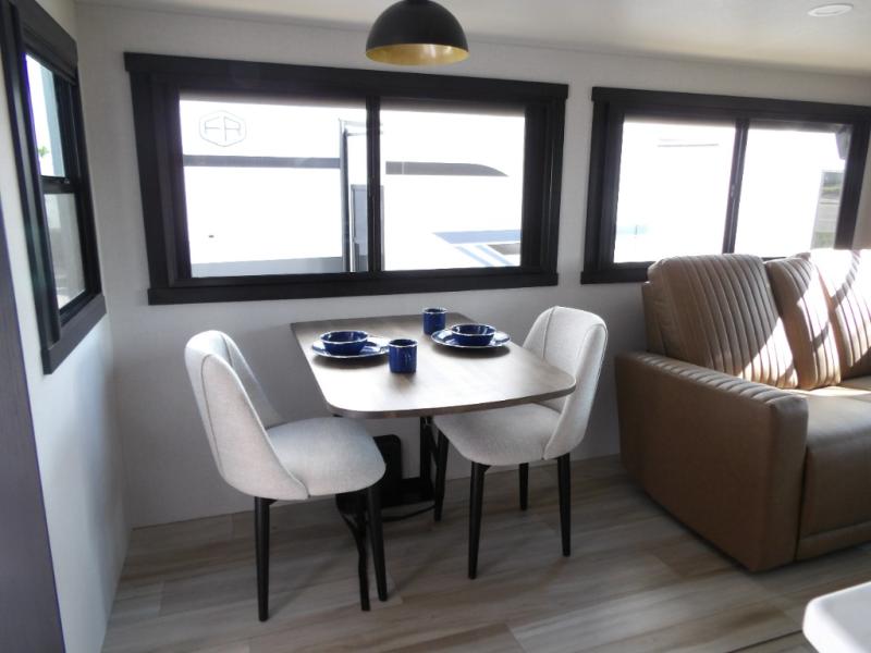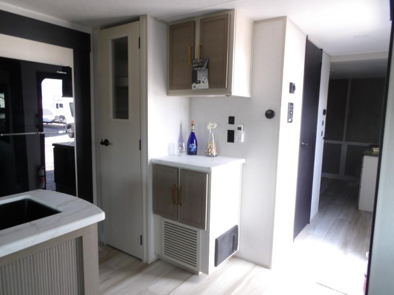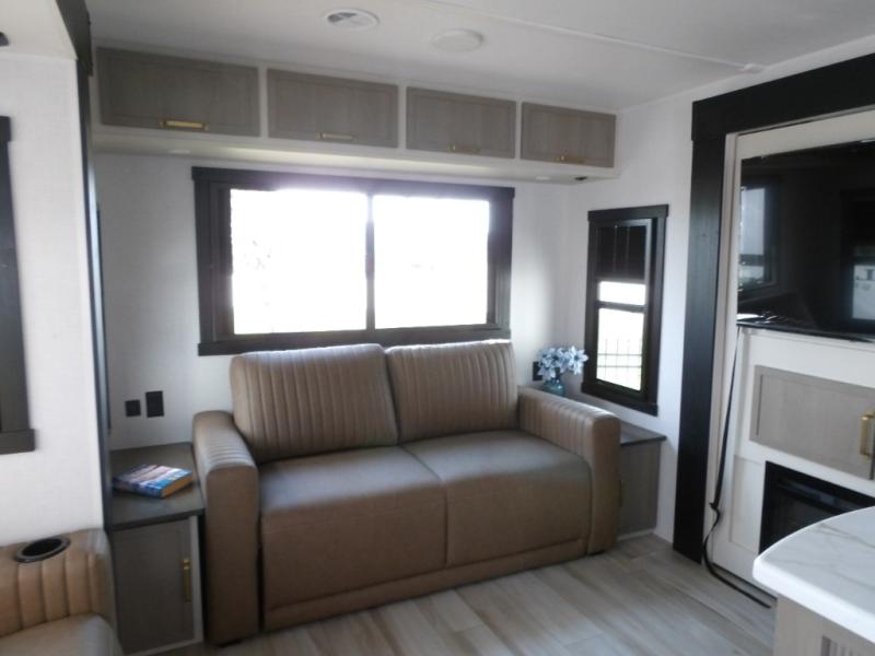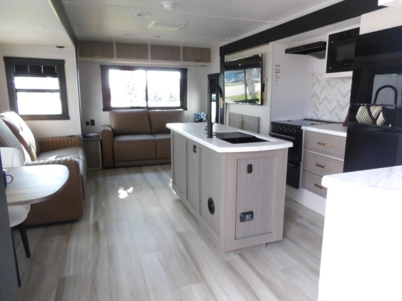 This travel trailer is decked out in features you will love like the front walk-in wardrobe with washer/dryer prep inside the front private bedroom! The full bathroom has everything you will need to get squeaky clean each morning including a residential walk-in shower with a skylight to let in some natural lighting. There is a hutch for you to store your dishes and a kitchen island to make meal prepping even easier. Once you have created a delicious meal, you can head to the booth dinette and enjoy eating it there comfortably while enjoying your view out of the panoramic window!