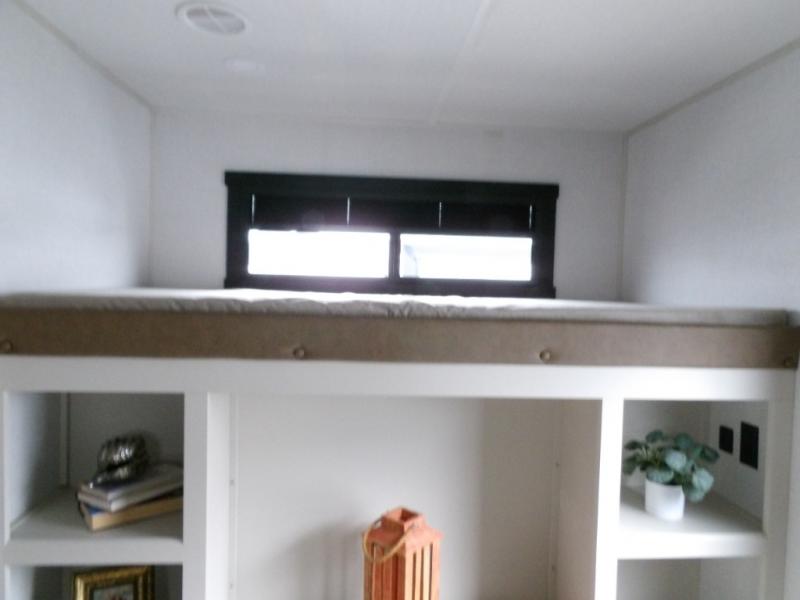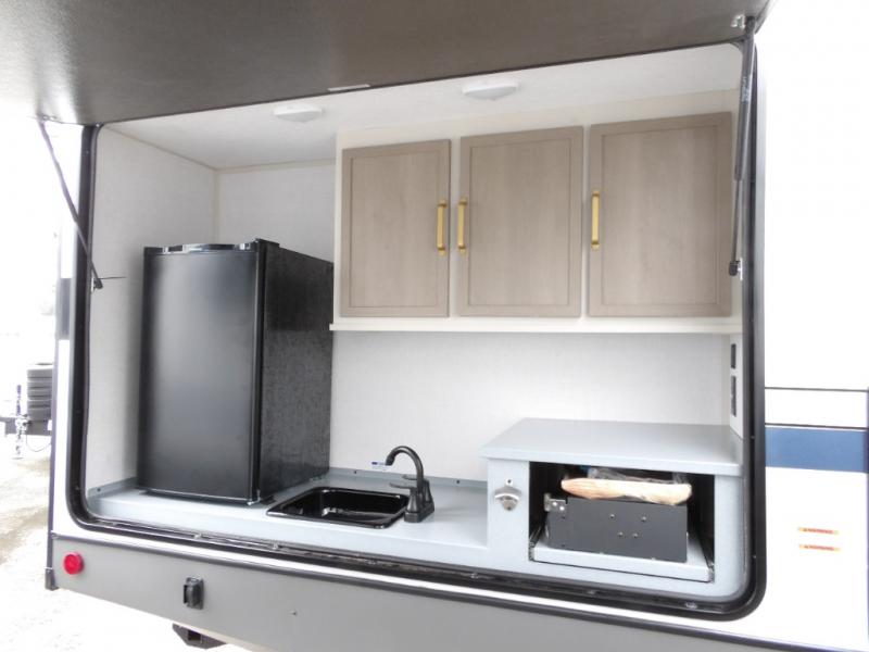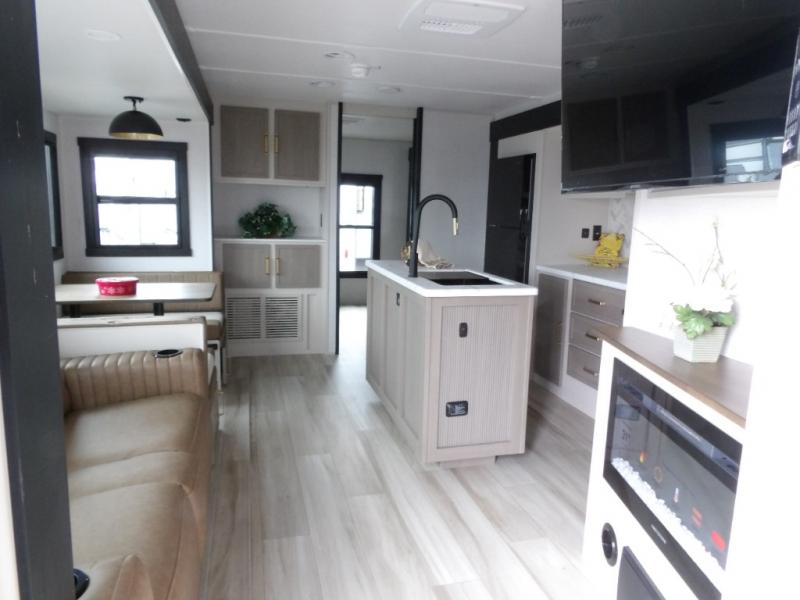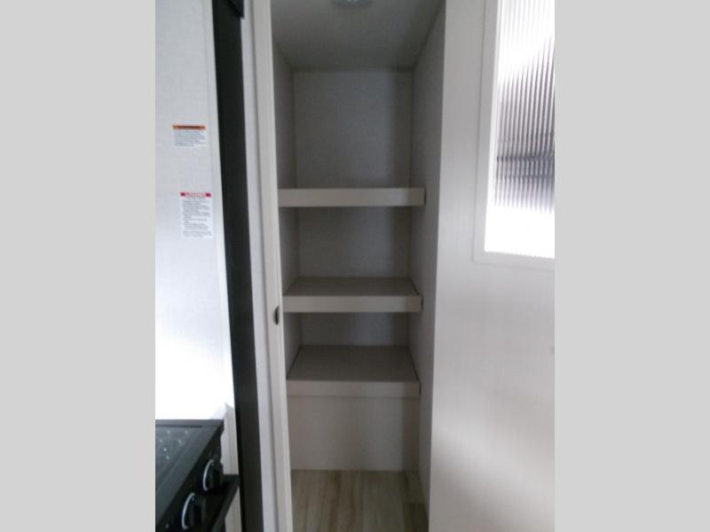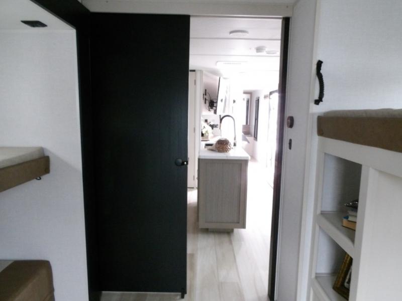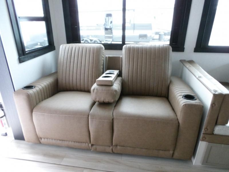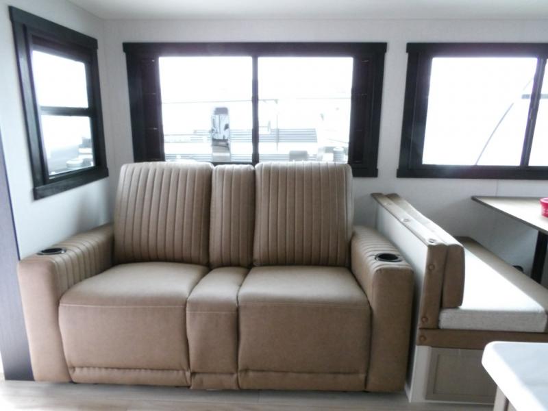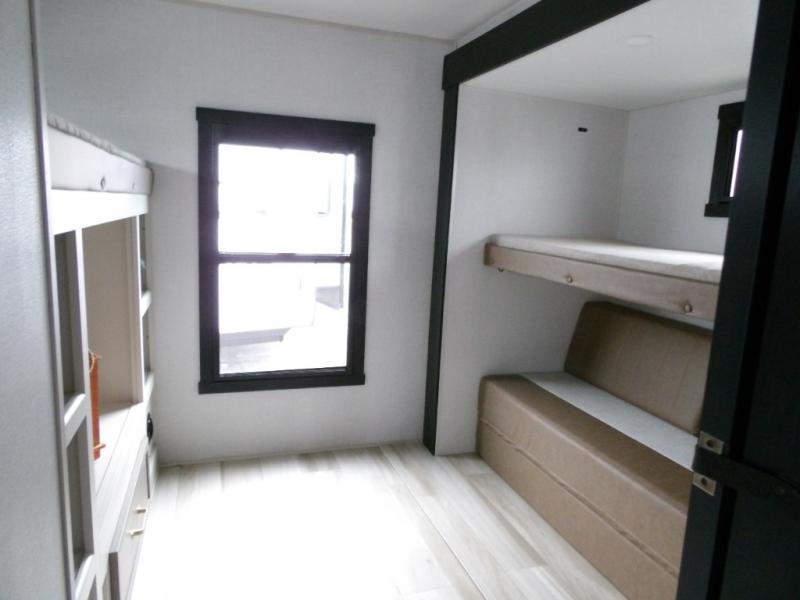 Your kids or friends are going to love camping in this travel trailer! It features a rear private bunkhouse with a bunk above a Versa queen convertible bed/sofa plus an additional bunk above an entertainment center with storage below. Just outside the bunkhouse is the kitchen with a 10 cu. ft. 12V black refrigerator, a microwave, a kitchen island, and a chef-sized walk-in pantry big enough to store everyone's favorite snacks. The booth dinette and the theatre seating are right next to panoramic windows so you can enjoy looking out at your beautiful scenery. You will also love taking a hot, steamy shower in the 30" x 36" shower with skylights and get a good night's rest on the queen bed in the front private bedroom!