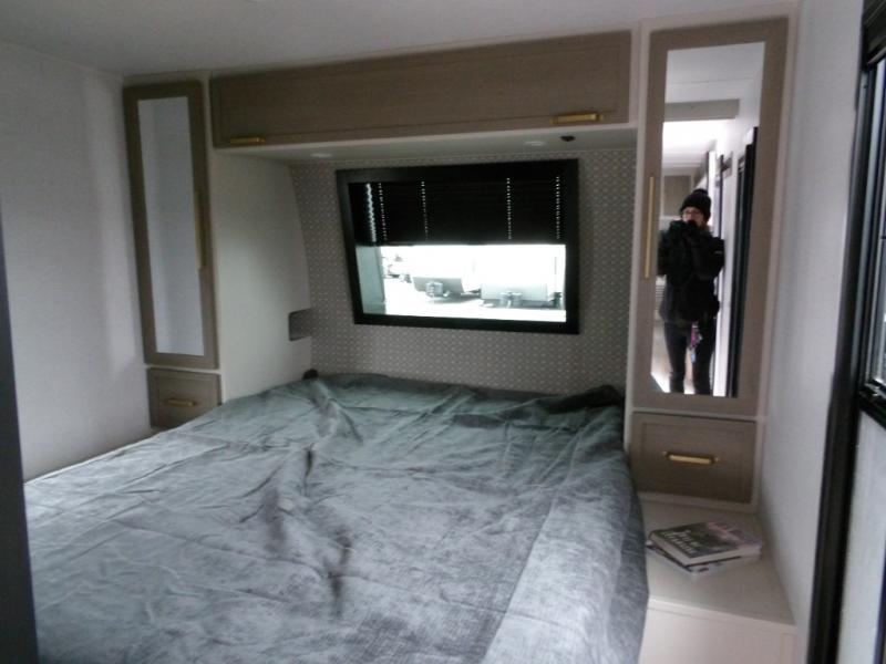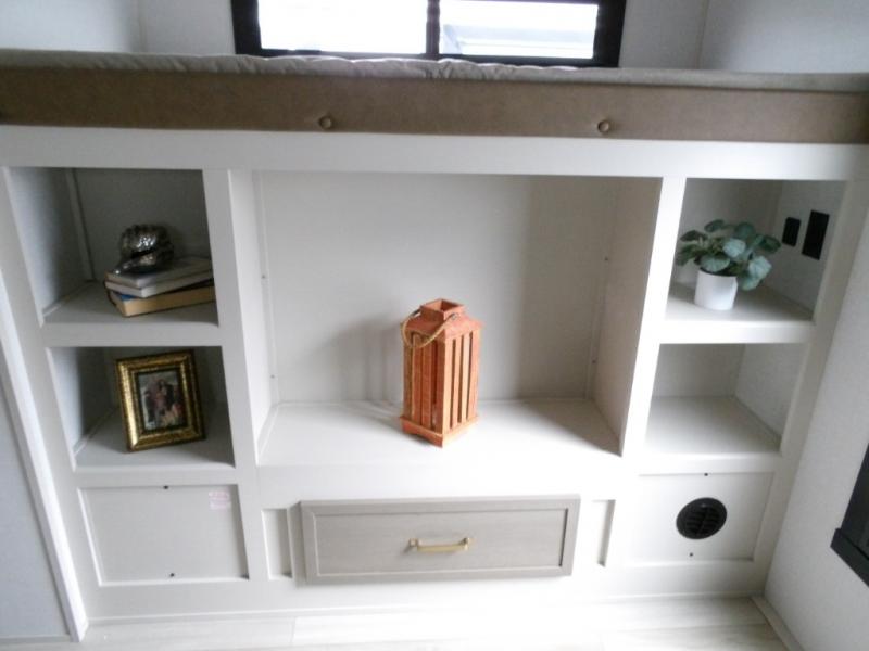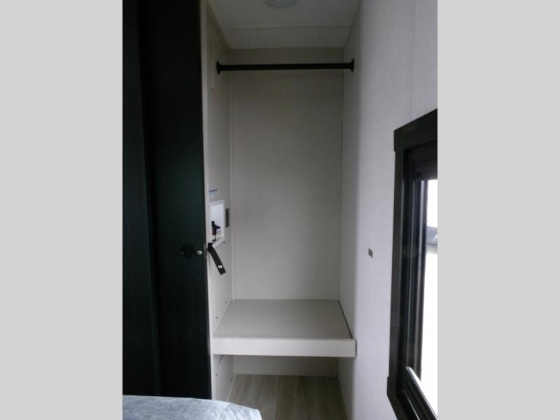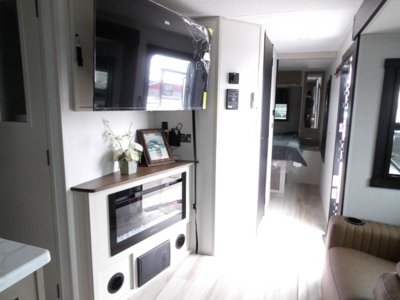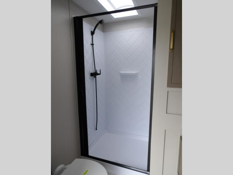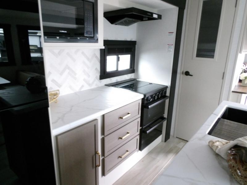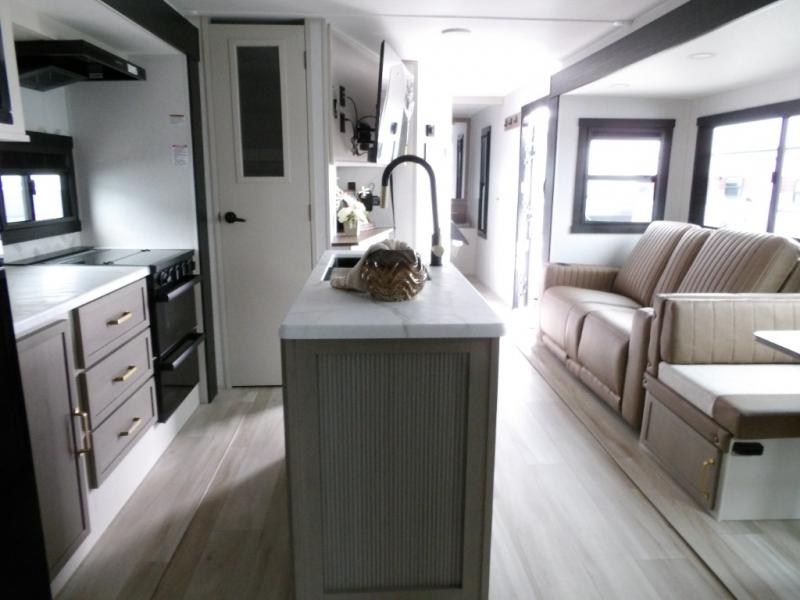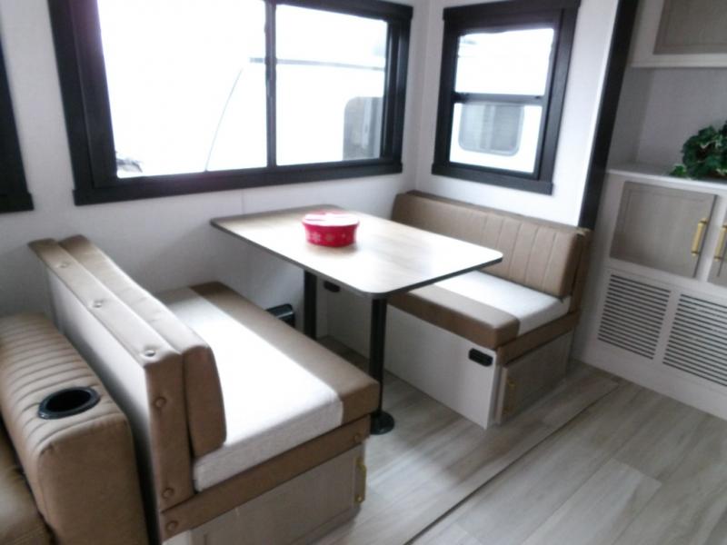 Your kids or friends are going to love camping in this travel trailer! It features a rear private bunkhouse with a bunk above a Versa queen convertible bed/sofa plus an additional bunk above an entertainment center with storage below. Just outside the bunkhouse is the kitchen with a 10 cu. ft. 12V black refrigerator, a microwave, a kitchen island, and a chef-sized walk-in pantry big enough to store everyone's favorite snacks. The booth dinette and the theatre seating are right next to panoramic windows so you can enjoy looking out at your beautiful scenery. You will also love taking a hot, steamy shower in the 30" x 36" shower with skylights and get a good night's rest on the queen bed in the front private bedroom!