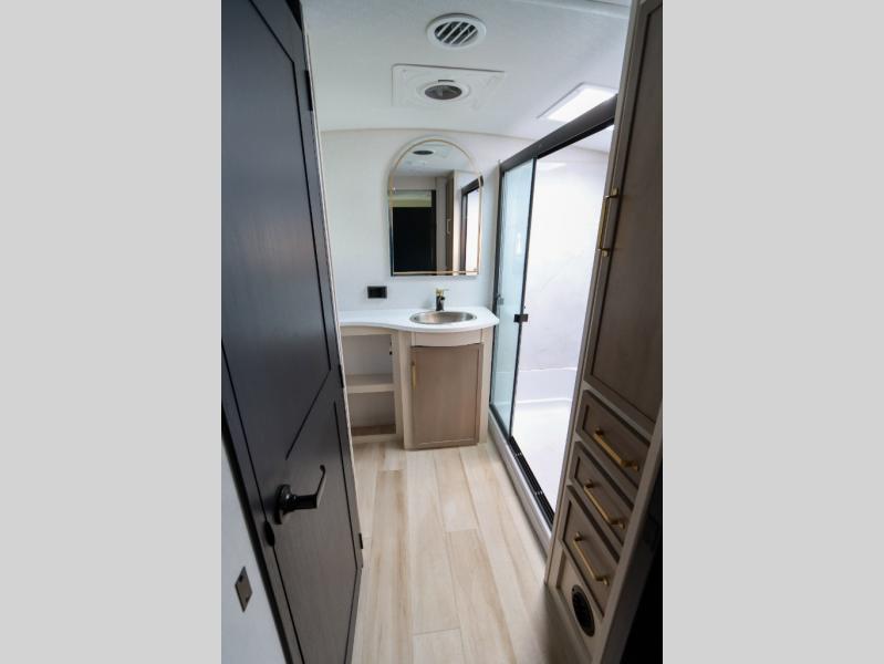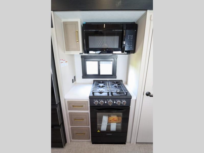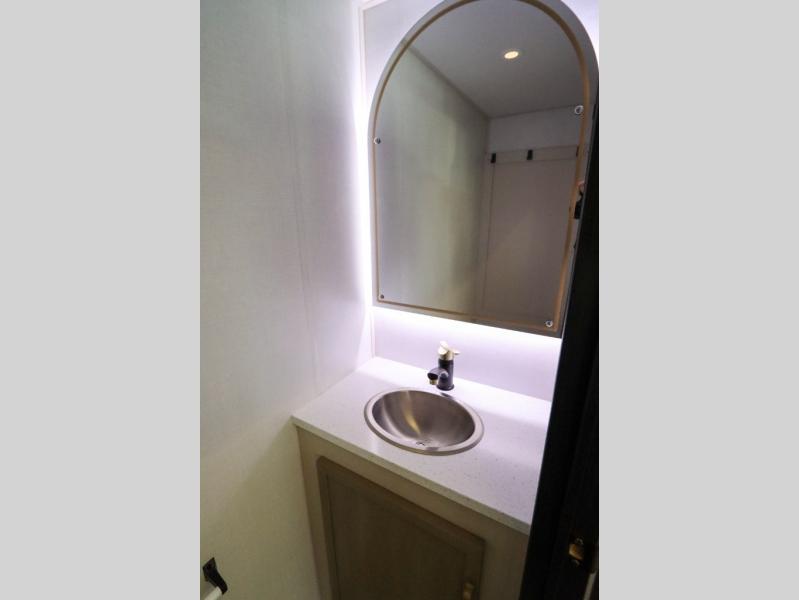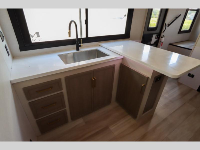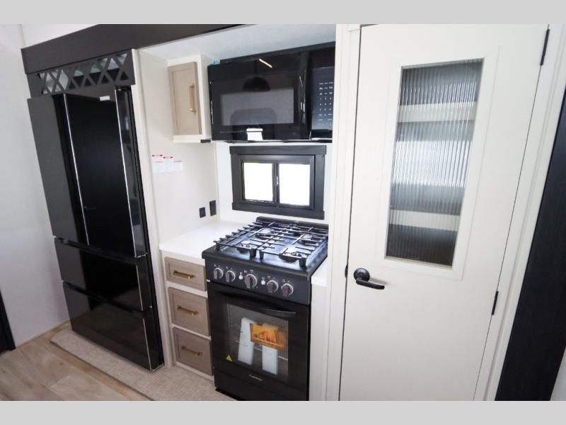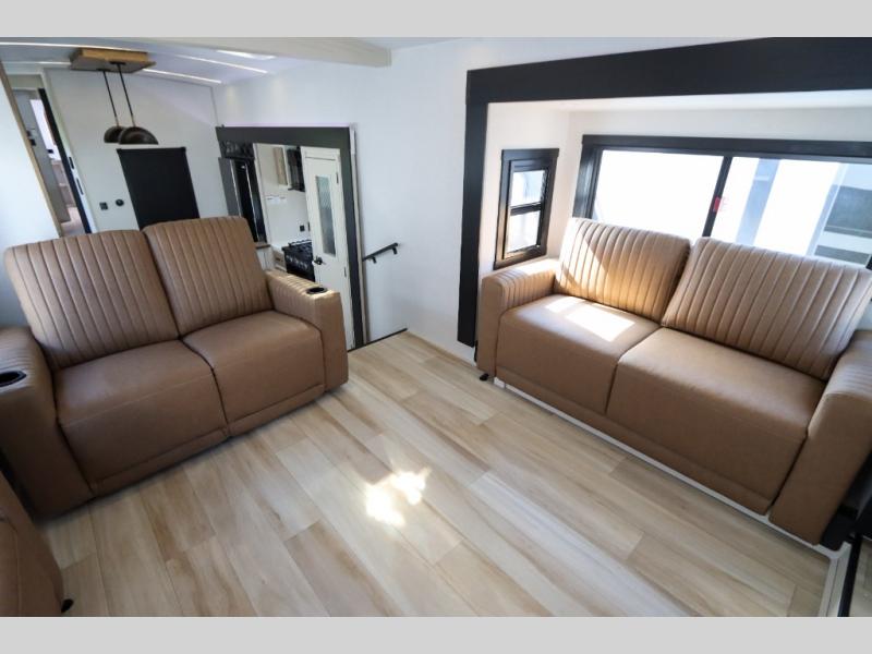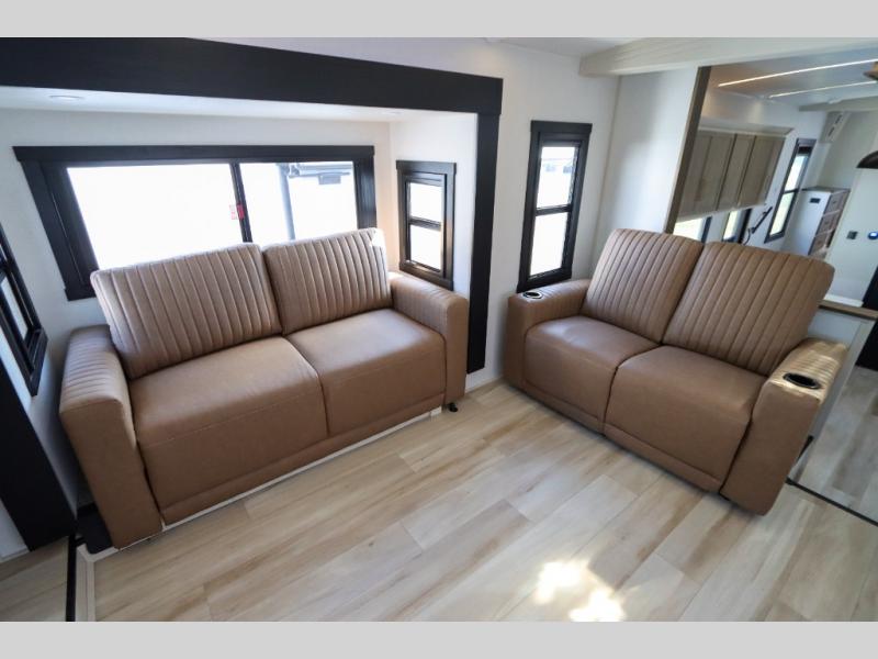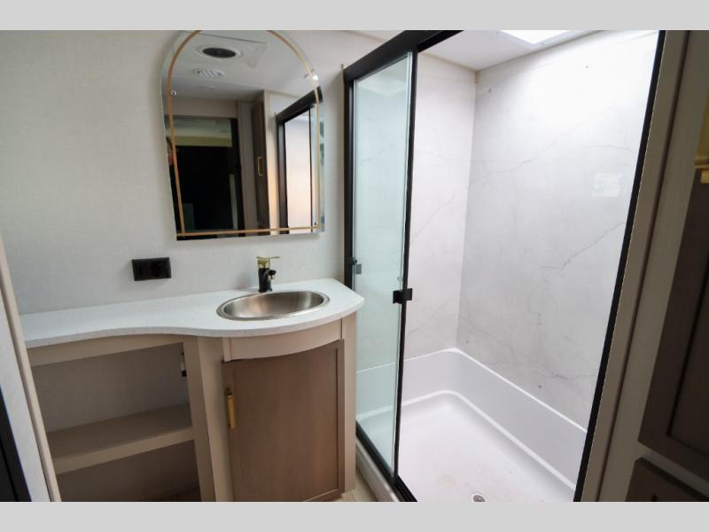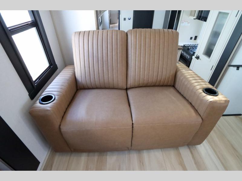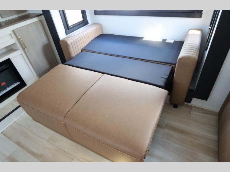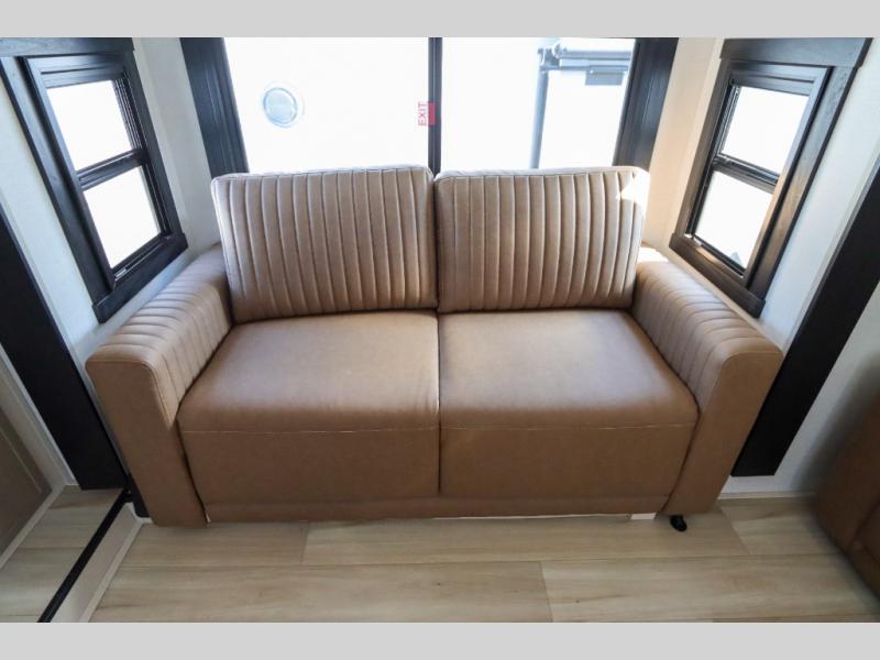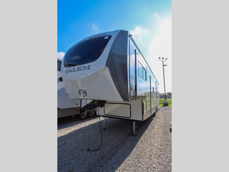 This Salem Hemisphere Elite fifth wheel is quite literally going to amaze you! The exterior has an extensive amount of storage space with its three pass-through storage compartments. The interior also has many storage locations, like the pantry for your dry and canned goods, 20-cubic foot refrigerator, additional storage over the half bath, linen closet, bedroom dresser, and bathroom wardrobe. In the master suite, you'll find extra space with an extra-wide bed slide, and the residential walk-in shower with skylight is going to make morning routines enjoyable. Each day you can sit down in one of the swivel bar stools at the breakfast bar and take in the beautiful views from the panoramic windows. You'll also love to spend your time at the front in the separate living room relaxing on one of the two tri-fold sofas or on the theater seating.