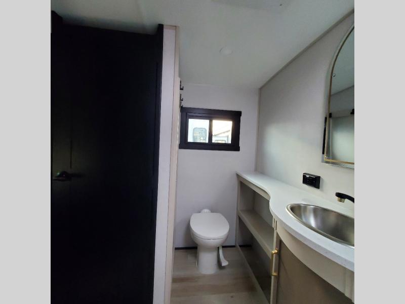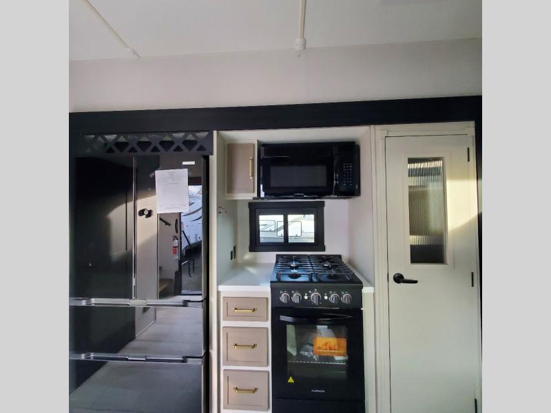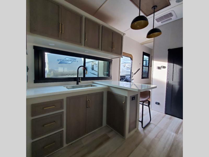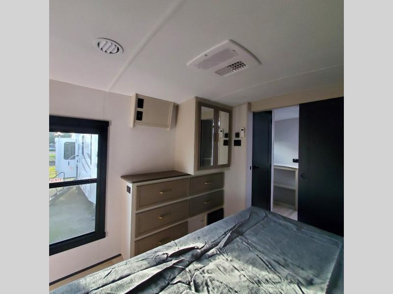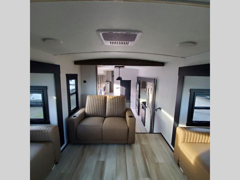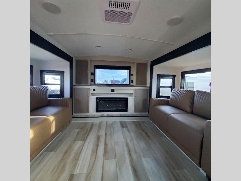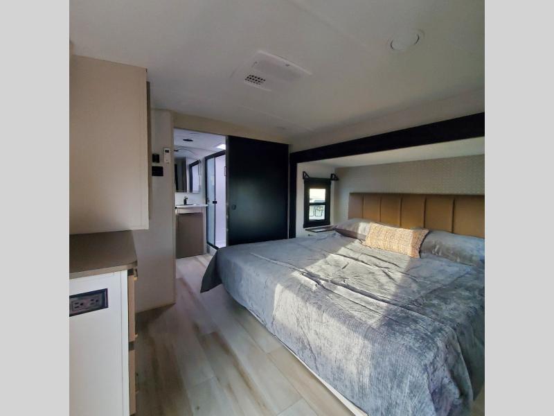 This Salem Hemisphere Elite fifth wheel is quite literally going to amaze you! The exterior has an extensive amount of storage space with its three pass-through storage compartments. The interior also has many storage locations, like the pantry for your dry and canned goods, 20-cubic foot refrigerator, additional storage over the half bath, linen closet, bedroom dresser, and bathroom wardrobe. In the master suite, you'll find extra space with an extra-wide bed slide, and the residential walk-in shower with skylight is going to make morning routines enjoyable. Each day you can sit down in one of the swivel bar stools at the breakfast bar and take in the beautiful views from the panoramic windows. You'll also love to spend your time at the front in the separate living room relaxing on one of the two tri-fold sofas or on the theater seating.