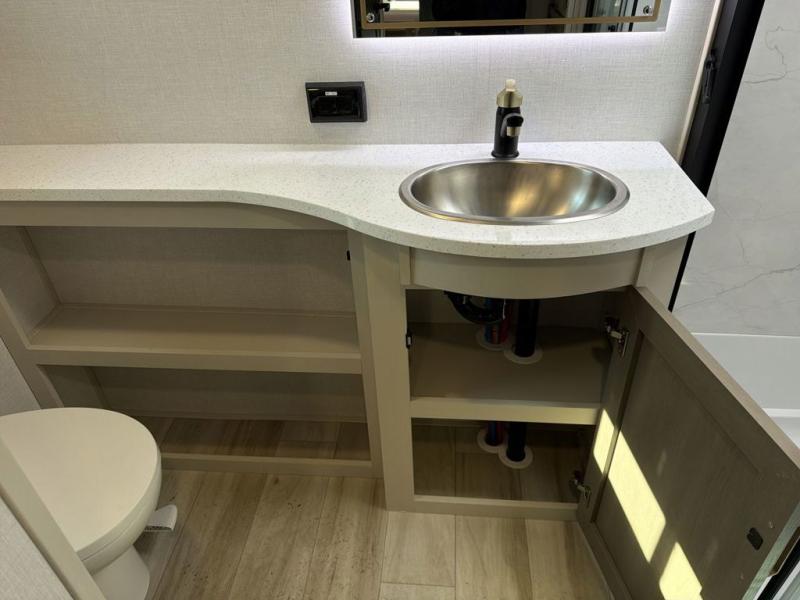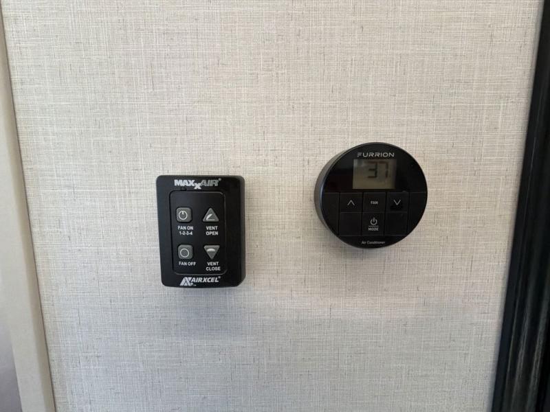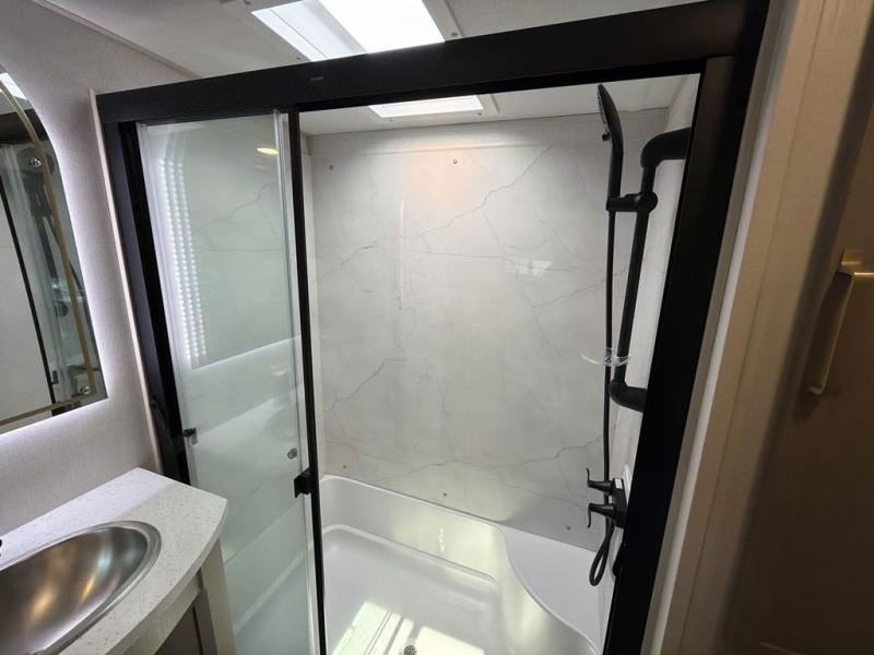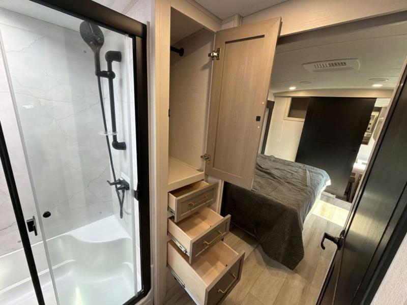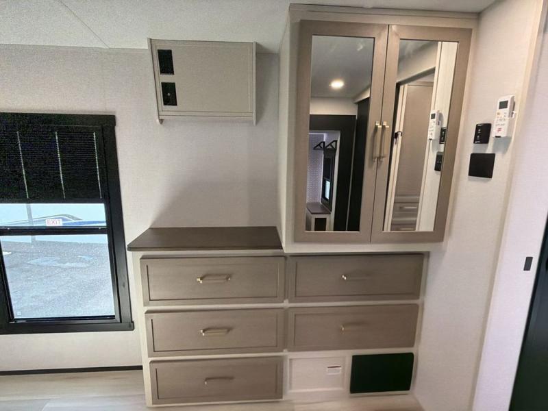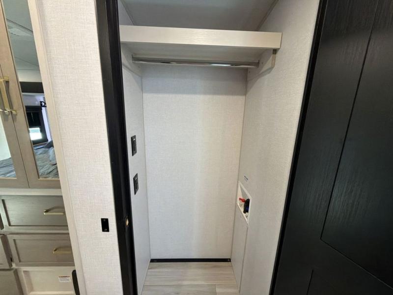 This Salem Hemisphere Elite fifth wheel is quite literally going to amaze you! The exterior has an extensive amount of storage space with its three pass-through storage compartments. The interior also has many storage locations, like the pantry for your dry and canned goods, 20-cubic foot refrigerator, additional storage over the half bath, linen closet, bedroom dresser, and bathroom wardrobe. In the master suite, you'll find extra space with an extra-wide bed slide, and the residential walk-in shower with skylight is going to make morning routines enjoyable. Each day you can sit down in one of the swivel bar stools at the breakfast bar and take in the beautiful views from the panoramic windows. You'll also love to spend your time at the front in the separate living room relaxing on one of the two tri-fold sofas or on the theater seating.