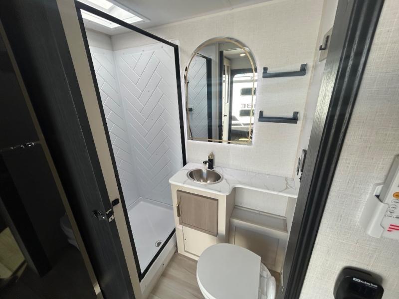 With any Salem Hemisphere Hyper-Lyte travel trailer by Forest River, you will appreciate a wide stance axle and Maxxis radial tires for smooth towing, plus laminated "Aluma Frame" sidewalls and floor for added durability. There are also square windows with built-in shades with reflecting thermal-foil backing to help keep your trailer cool during the summer. The 2" accessory hitch receiver will allow you to bring along more camp gear and the tankless water heater is a feature you won't want to camp without! Inside, you'll find Temple Cherry cabinetry, wood door casings in place of plastic, a residential single bowl undermount sink, and many more comforts. Outside, your furry friend will be happy with the shaded pet tether and security hook, and there is even an outside shower with hot and cold water to fill the dogs water bowl and wash off hiking boots!