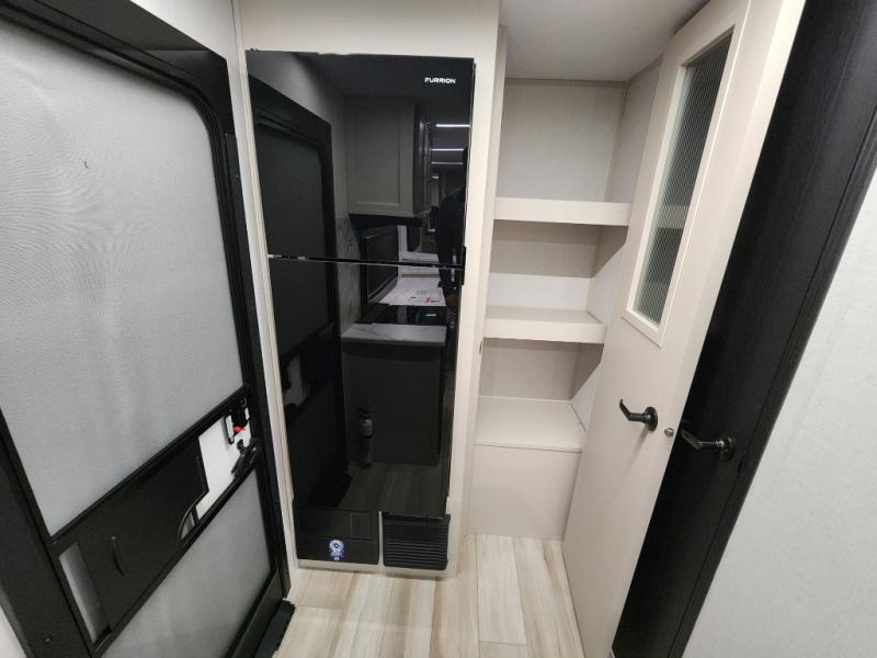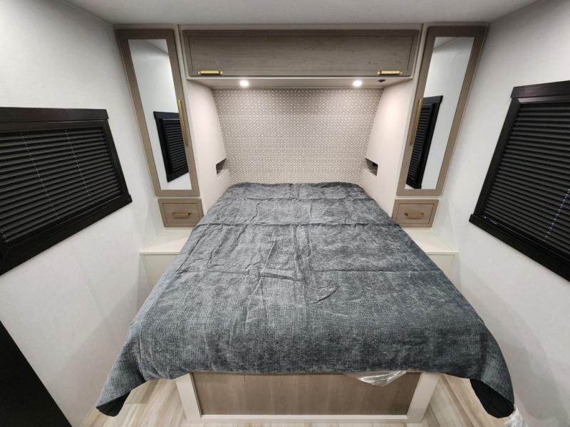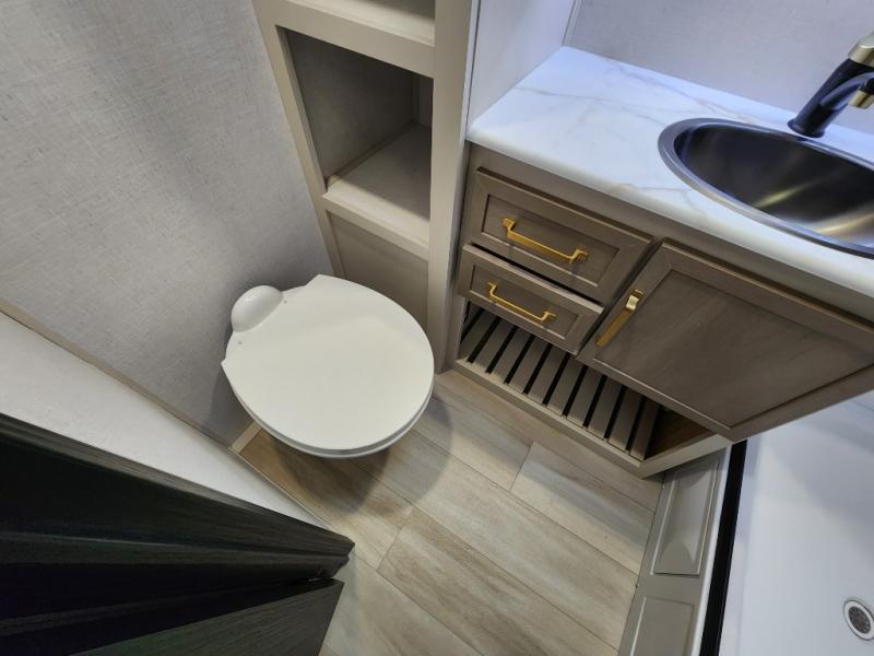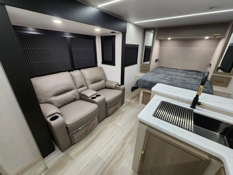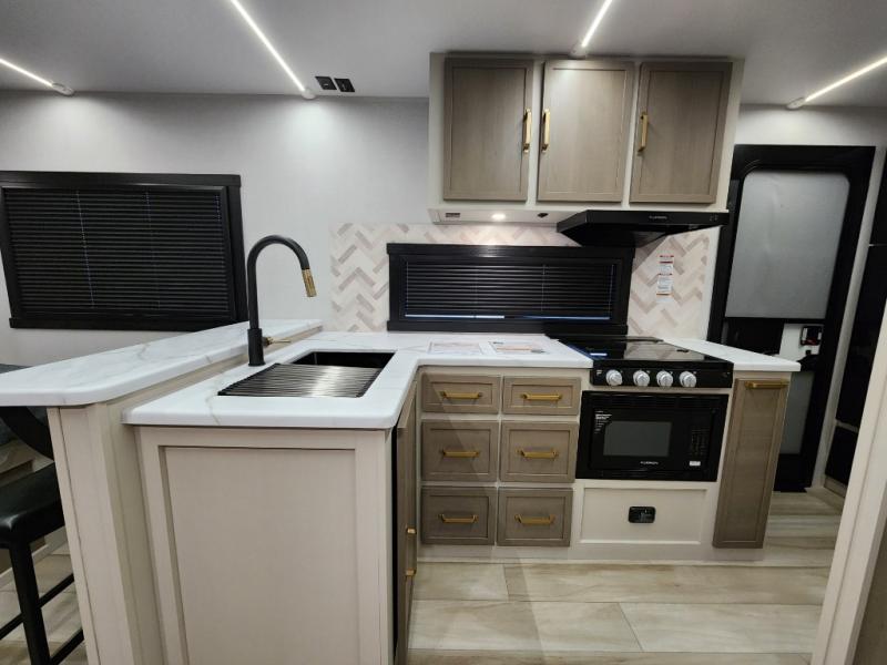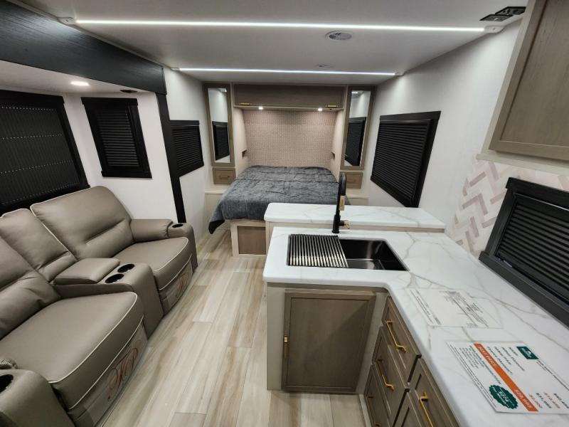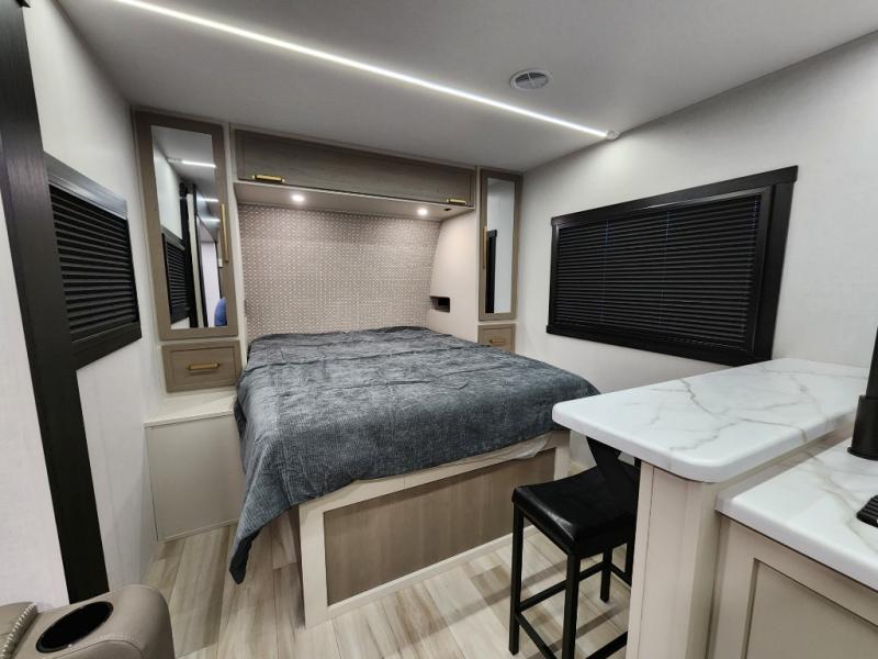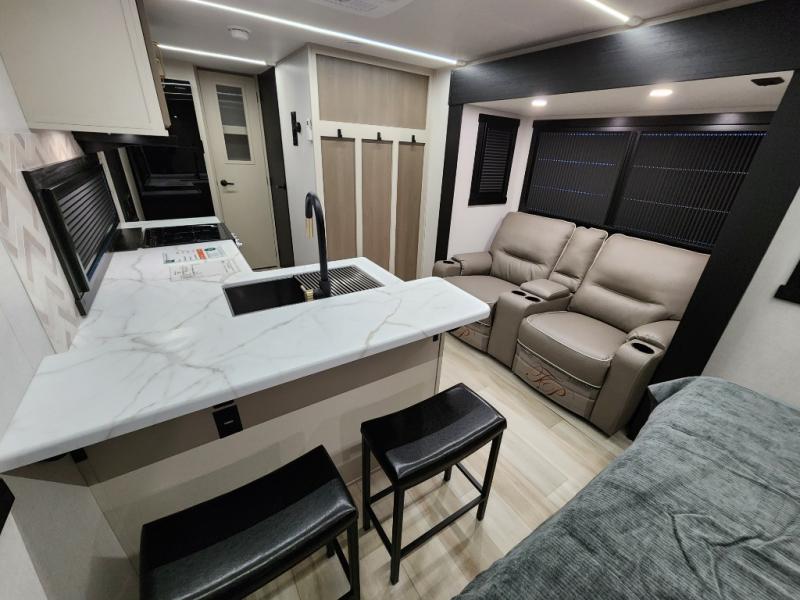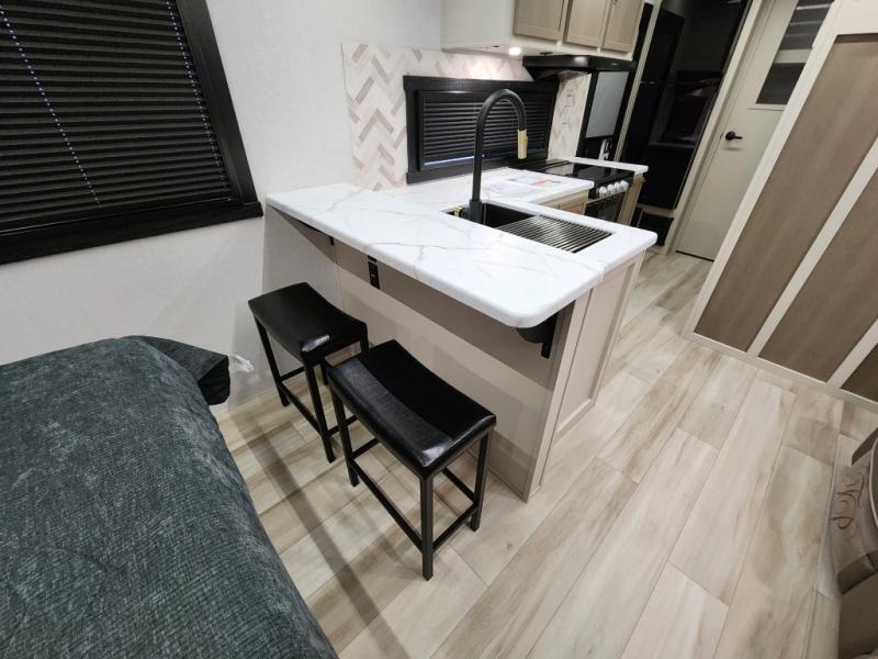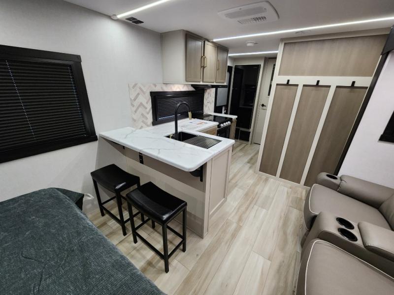 At the front of this thoughtfully designed trailer, a comfortable 60" x 80" queen bed provides a restful retreat, complete with overhead cabinets for storing your essentials and adventure gear. Moving into the center, the L-shaped kitchen impresses with elegant temple cherry cabinetry, Nordic marble countertops, and a residential-style single-bowl undermount sink, while a convenient bar with stools at the end offers a cozy spot to enjoy meals or morning coffee. Across from the kitchen, a slide-out adds generous space and features theater seating where you can relax and take in the views through large panoramic windows. At the rear, a 10-cu. ft. refrigerator and pantry keep all your groceries and dry goods organized, and just opposite, a full bathroom ensures you can freshen up without relying on campsite facilities.