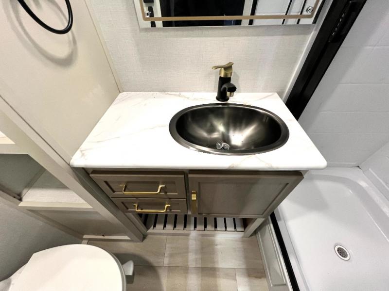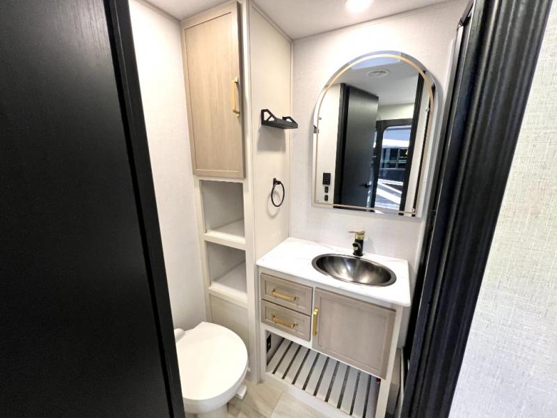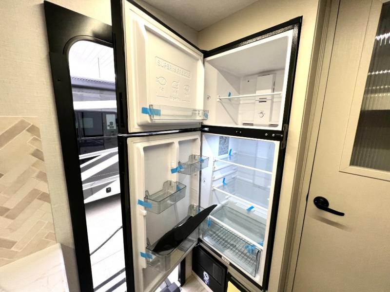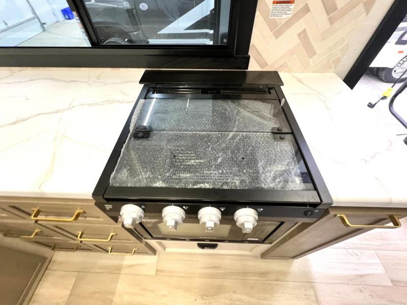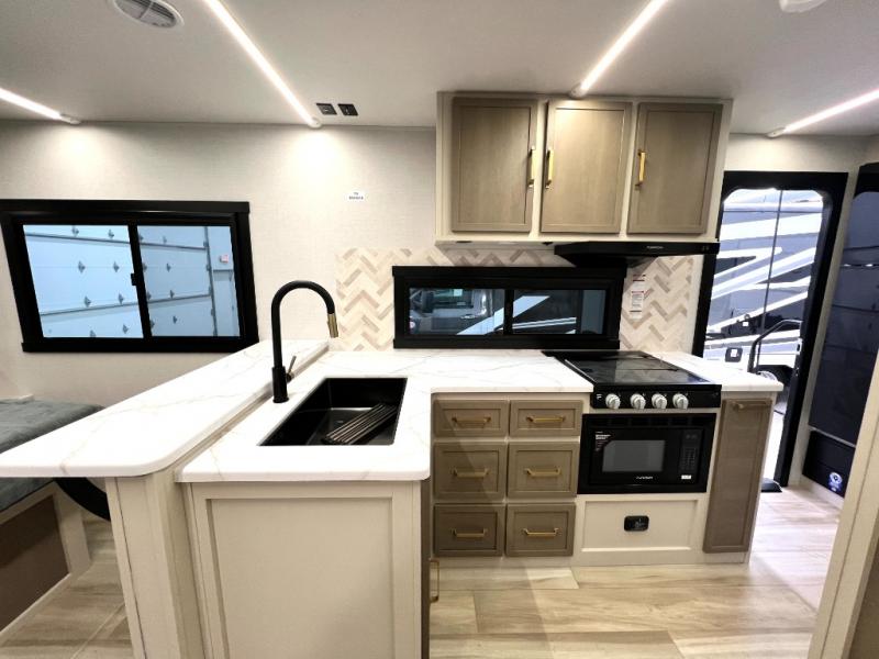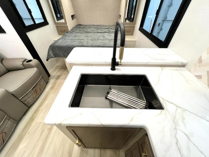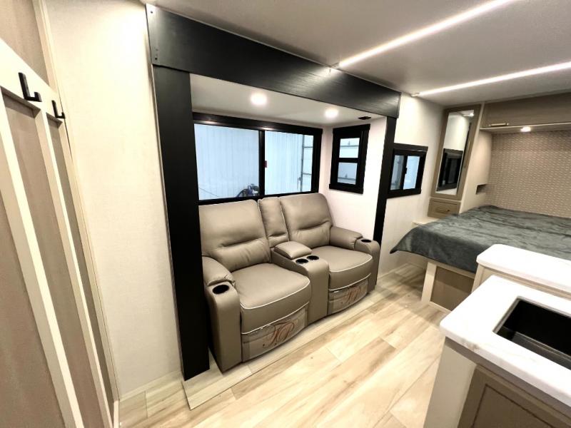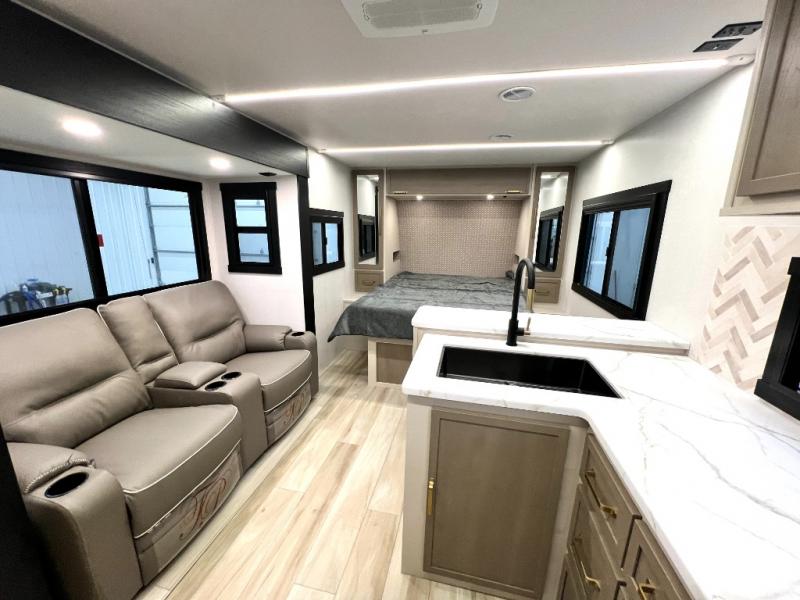 At the front of this thoughtfully designed trailer, a comfortable 60" x 80" queen bed provides a restful retreat, complete with overhead cabinets for storing your essentials and adventure gear. Moving into the center, the L-shaped kitchen impresses with elegant temple cherry cabinetry, Nordic marble countertops, and a residential-style single-bowl undermount sink, while a convenient bar with stools at the end offers a cozy spot to enjoy meals or morning coffee. Across from the kitchen, a slide-out adds generous space and features theater seating where you can relax and take in the views through large panoramic windows. At the rear, a 10-cu. ft. refrigerator and pantry keep all your groceries and dry goods organized, and just opposite, a full bathroom ensures you can freshen up without relying on campsite facilities.