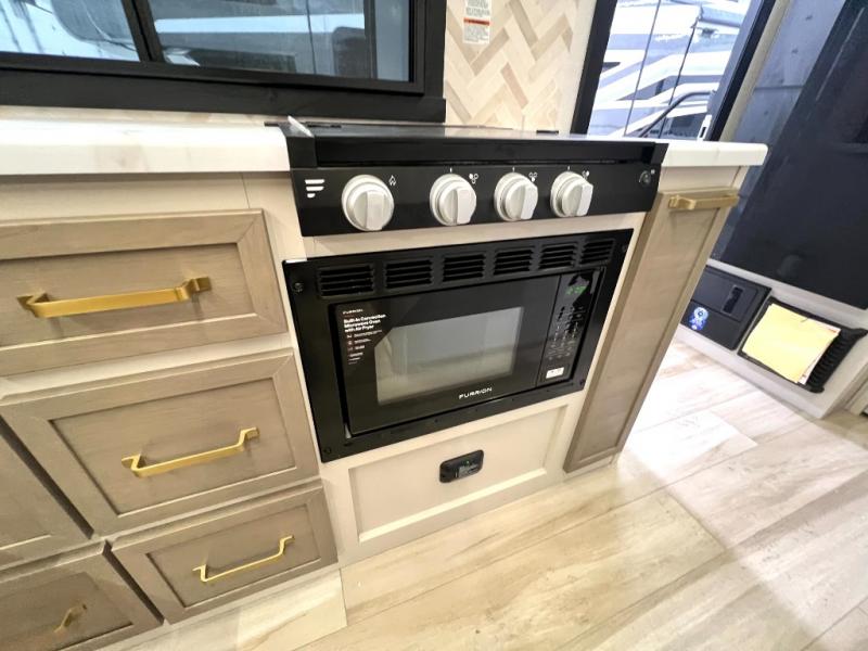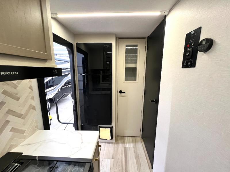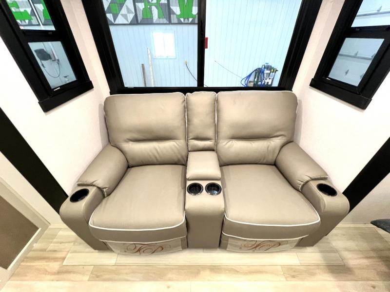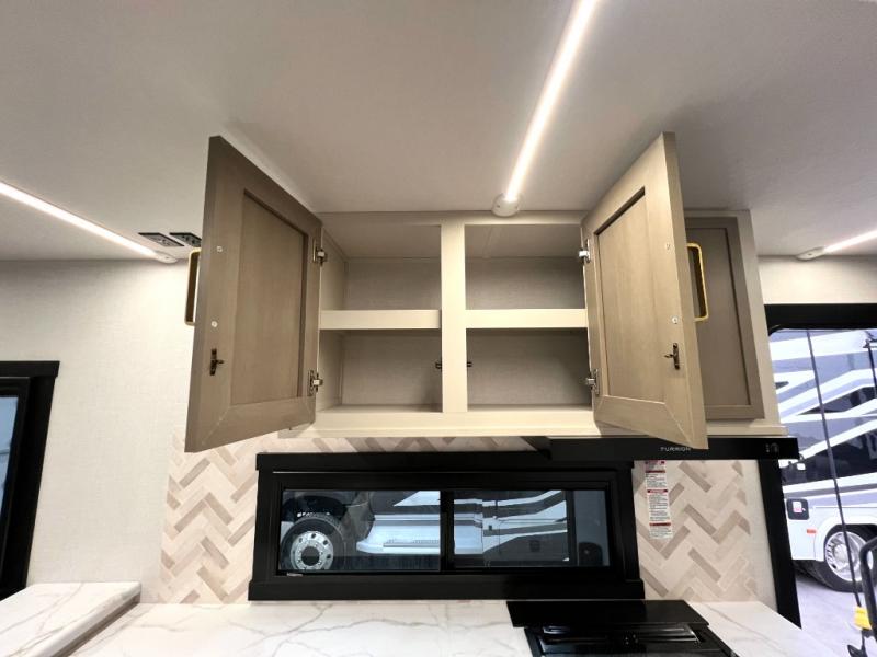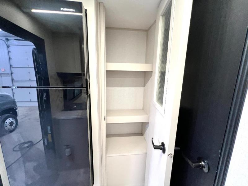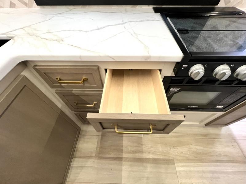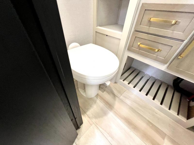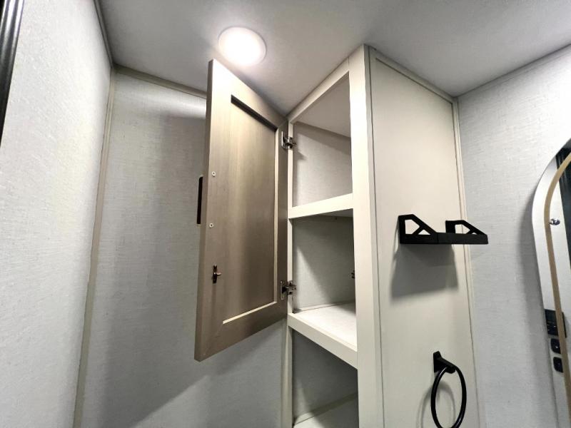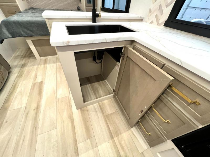 At the front of this thoughtfully designed trailer, a comfortable 60" x 80" queen bed provides a restful retreat, complete with overhead cabinets for storing your essentials and adventure gear. Moving into the center, the L-shaped kitchen impresses with elegant temple cherry cabinetry, Nordic marble countertops, and a residential-style single-bowl undermount sink, while a convenient bar with stools at the end offers a cozy spot to enjoy meals or morning coffee. Across from the kitchen, a slide-out adds generous space and features theater seating where you can relax and take in the views through large panoramic windows. At the rear, a 10-cu. ft. refrigerator and pantry keep all your groceries and dry goods organized, and just opposite, a full bathroom ensures you can freshen up without relying on campsite facilities.