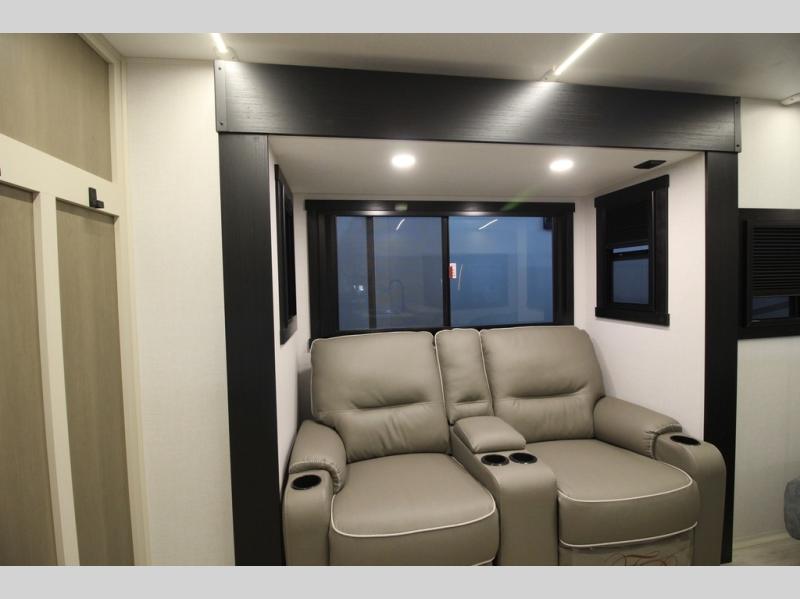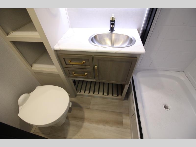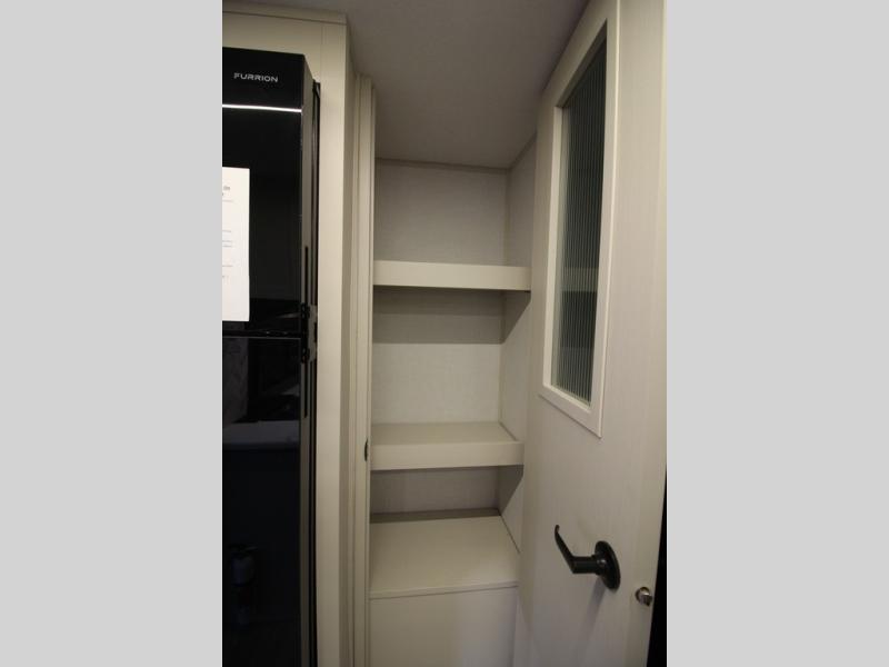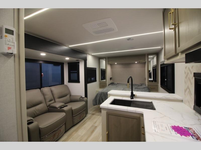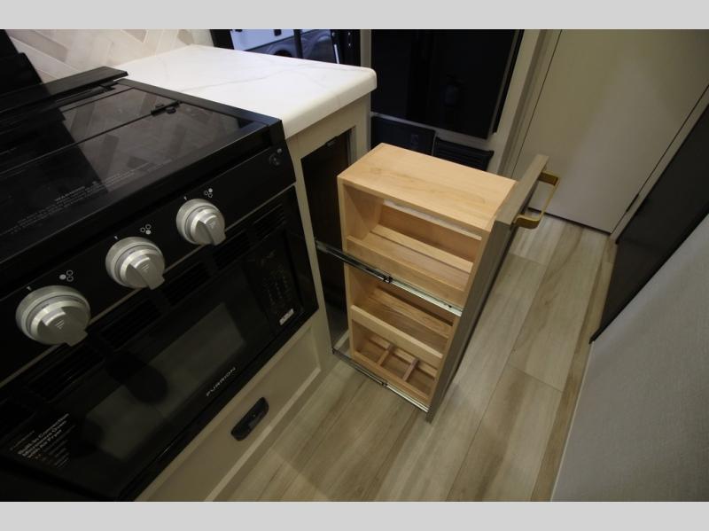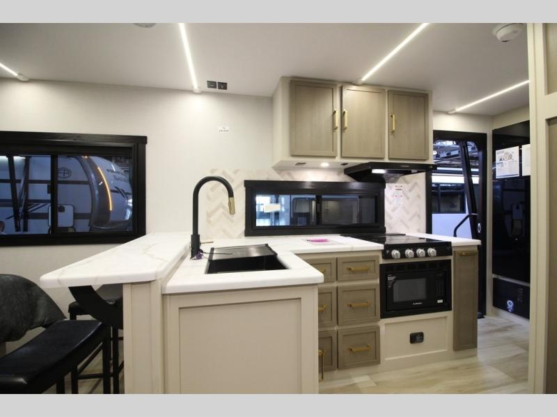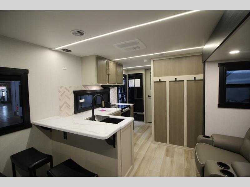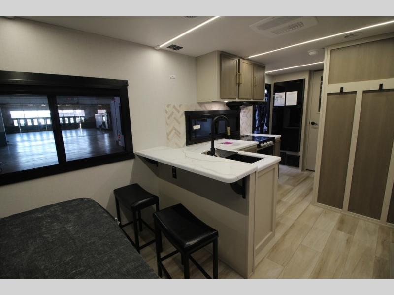 At the front of this thoughtfully designed trailer, a comfortable 60" x 80" queen bed provides a restful retreat, complete with overhead cabinets for storing your essentials and adventure gear. Moving into the center, the L-shaped kitchen impresses with elegant temple cherry cabinetry, Nordic marble countertops, and a residential-style single-bowl undermount sink, while a convenient bar with stools at the end offers a cozy spot to enjoy meals or morning coffee. Across from the kitchen, a slide-out adds generous space and features theater seating where you can relax and take in the views through large panoramic windows. At the rear, a 10-cu. ft. refrigerator and pantry keep all your groceries and dry goods organized, and just opposite, a full bathroom ensures you can freshen up without relying on campsite facilities.