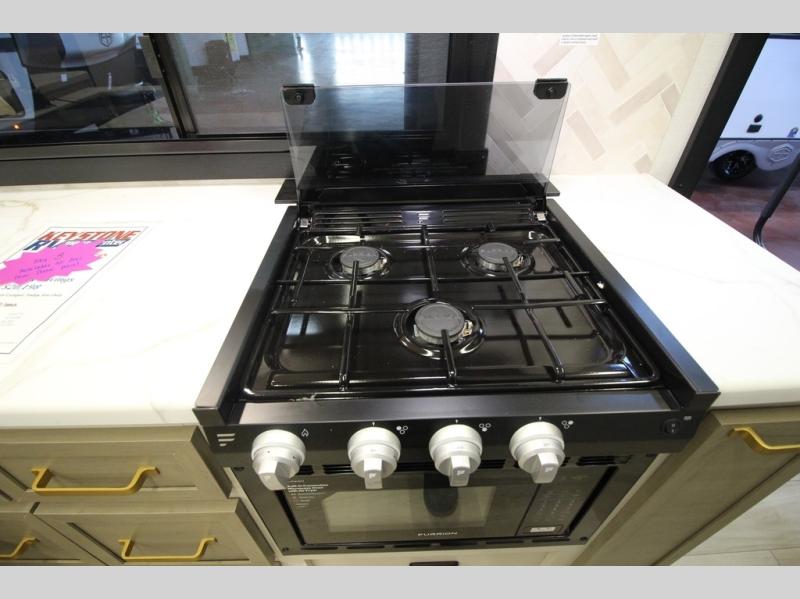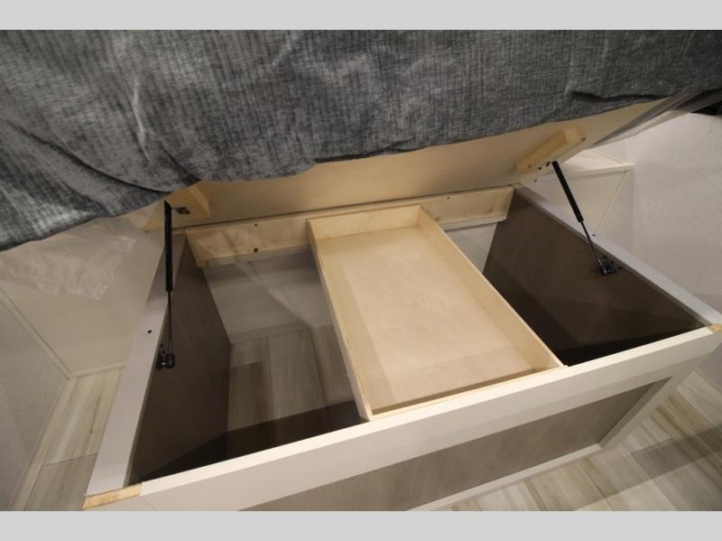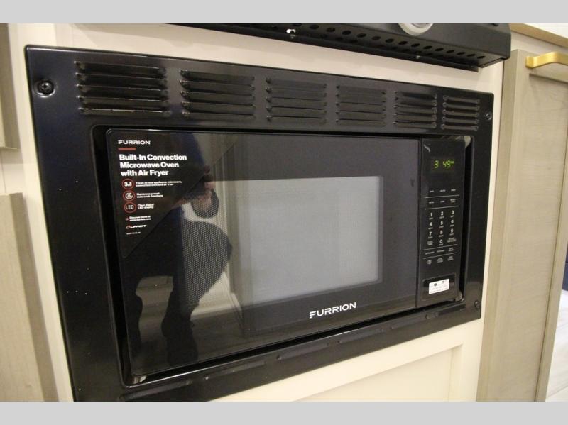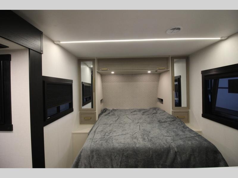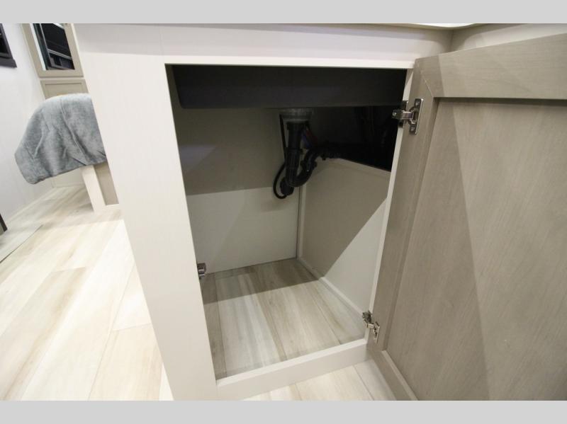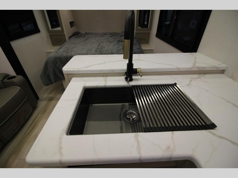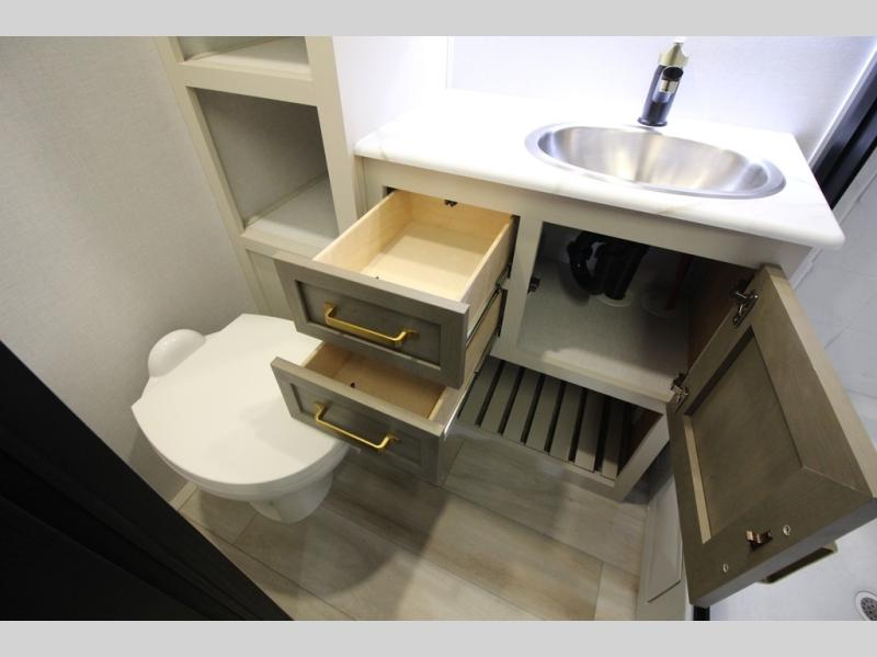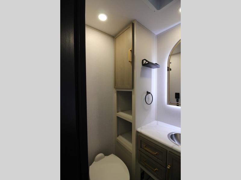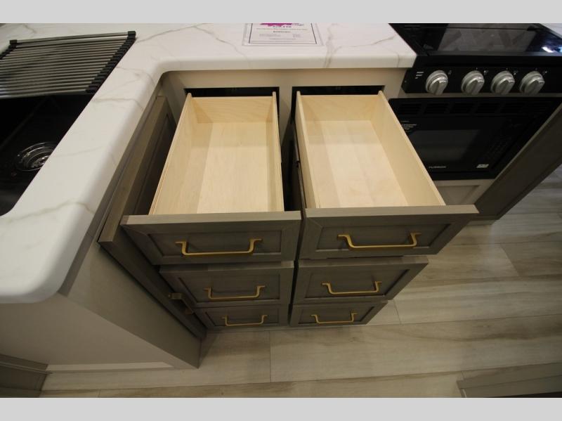 At the front of this thoughtfully designed trailer, a comfortable 60" x 80" queen bed provides a restful retreat, complete with overhead cabinets for storing your essentials and adventure gear. Moving into the center, the L-shaped kitchen impresses with elegant temple cherry cabinetry, Nordic marble countertops, and a residential-style single-bowl undermount sink, while a convenient bar with stools at the end offers a cozy spot to enjoy meals or morning coffee. Across from the kitchen, a slide-out adds generous space and features theater seating where you can relax and take in the views through large panoramic windows. At the rear, a 10-cu. ft. refrigerator and pantry keep all your groceries and dry goods organized, and just opposite, a full bathroom ensures you can freshen up without relying on campsite facilities.