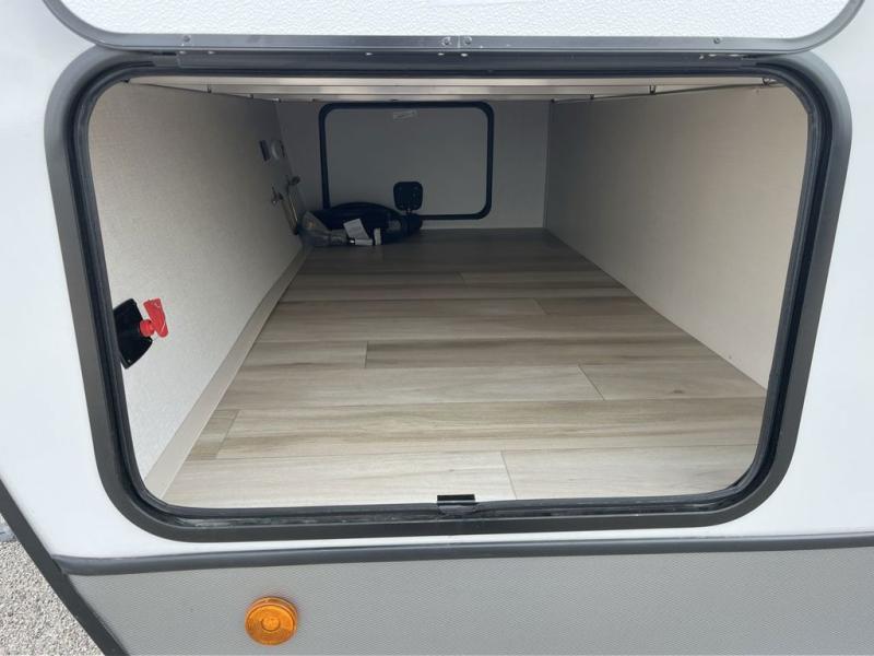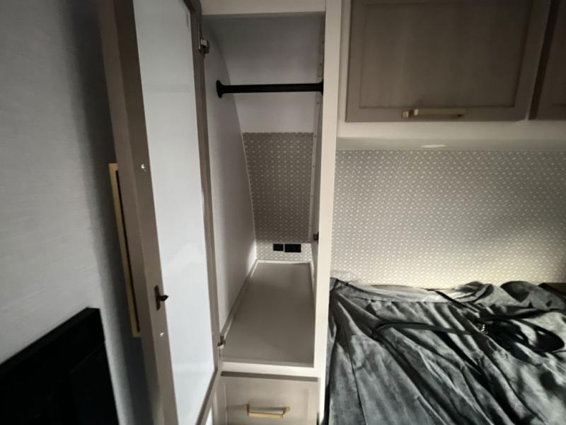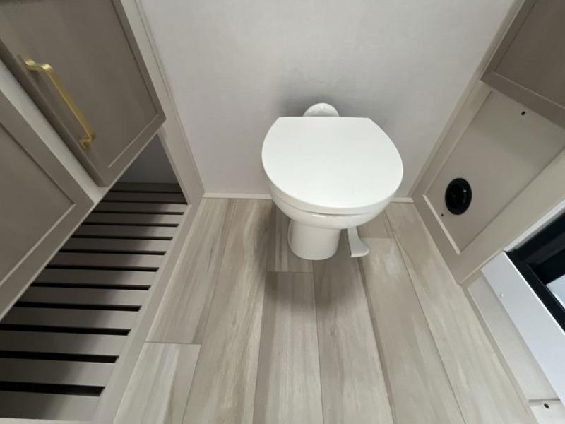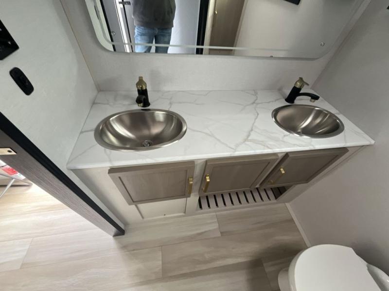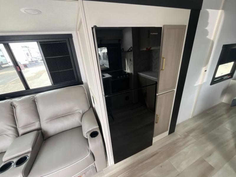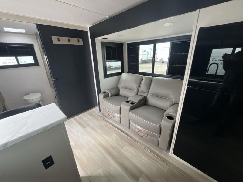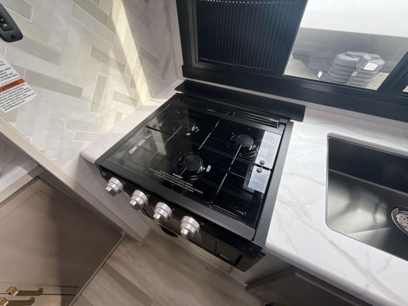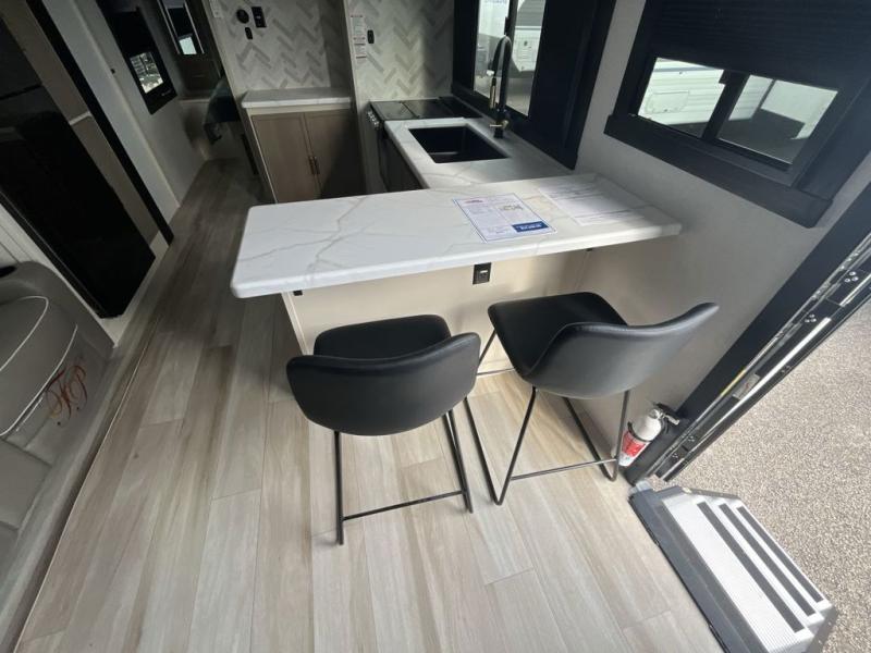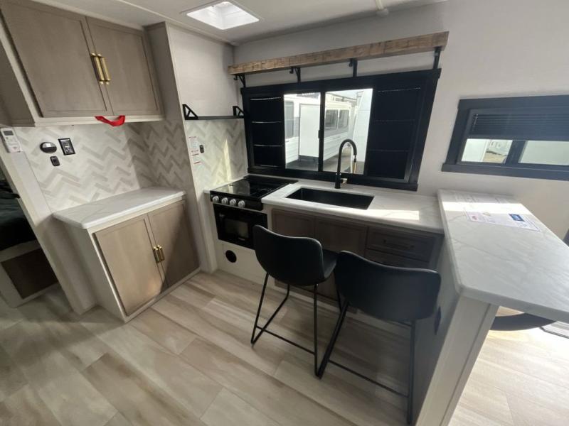 At the front of this well-designed trailer, a private bedroom offers a cozy 60" x 80" queen bed for a restful night’s sleep, complemented by overhead cabinets and a wardrobe for neatly storing clothing and essentials. Moving into the center, a spacious slide-out opens up the living area and houses a comfortable theater seat perfect for lounging after a day of adventure along with a 10 cu. ft. refrigerator and pantry to keep all your groceries and dry goods organized. Across from this space, the L-shaped kitchen provides everything you need to cook your favorite meals, featuring a three-burner range, a residential-style single-bowl undermount sink, and elegant Nordic marble countertops. At the end of the kitchen, a convenient bar top with stools creates a welcoming spot to enjoy meals or unwind with a drink. Toward the rear, the full bathroom adds a touch of luxury with a porcelain toilet, dual sinks, and an LED backlit mirror, allowing two people to get ready comfortably and without the morning rush.