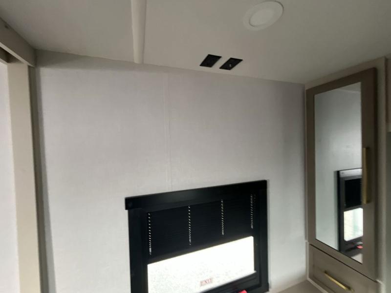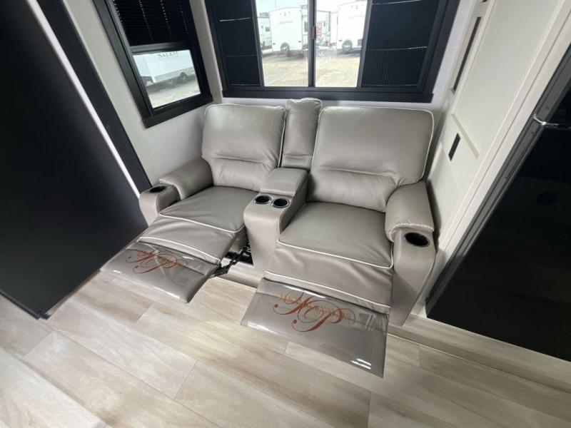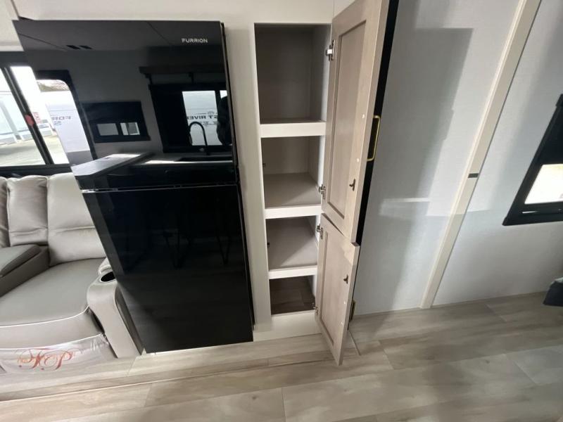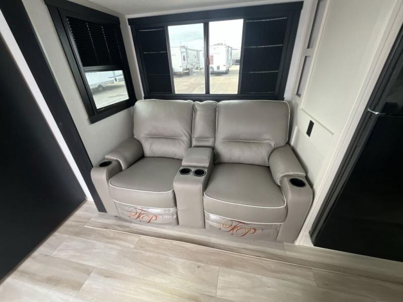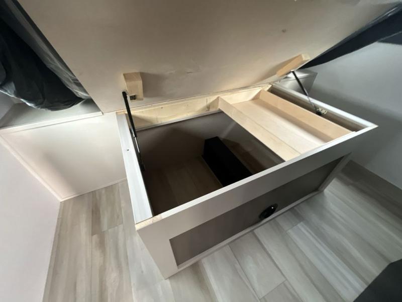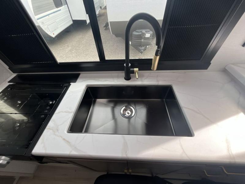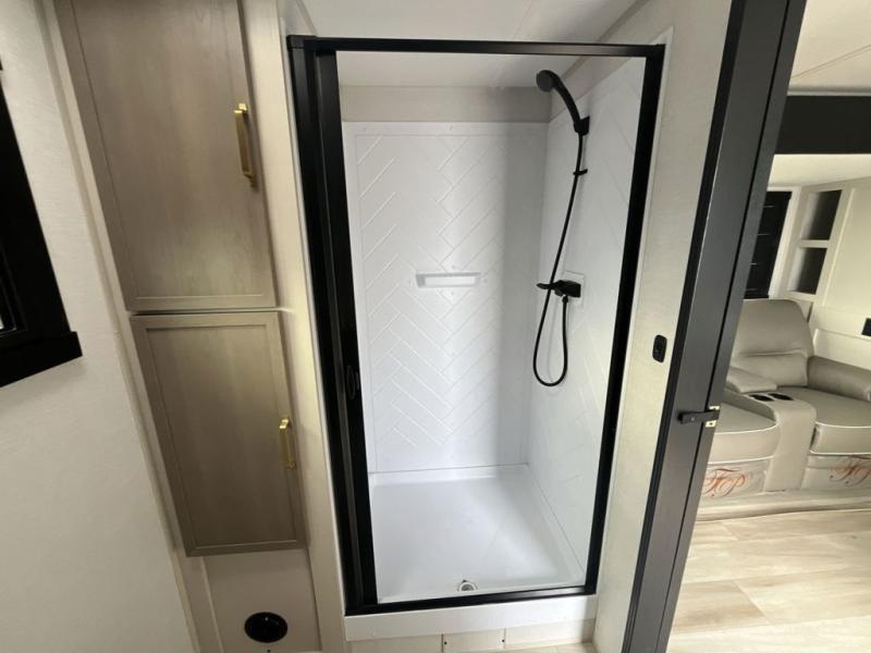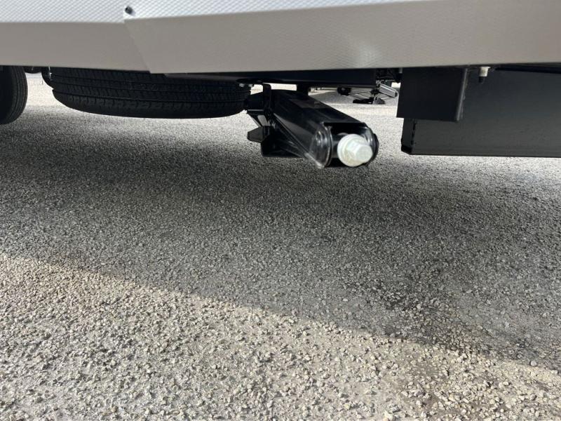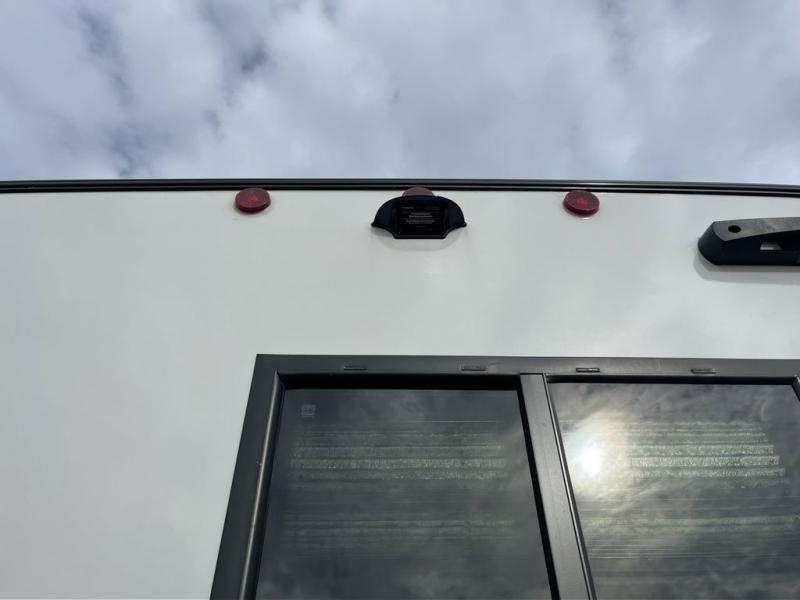 At the front of this well-designed trailer, a private bedroom offers a cozy 60" x 80" queen bed for a restful night’s sleep, complemented by overhead cabinets and a wardrobe for neatly storing clothing and essentials. Moving into the center, a spacious slide-out opens up the living area and houses a comfortable theater seat perfect for lounging after a day of adventure along with a 10 cu. ft. refrigerator and pantry to keep all your groceries and dry goods organized. Across from this space, the L-shaped kitchen provides everything you need to cook your favorite meals, featuring a three-burner range, a residential-style single-bowl undermount sink, and elegant Nordic marble countertops. At the end of the kitchen, a convenient bar top with stools creates a welcoming spot to enjoy meals or unwind with a drink. Toward the rear, the full bathroom adds a touch of luxury with a porcelain toilet, dual sinks, and an LED backlit mirror, allowing two people to get ready comfortably and without the morning rush.