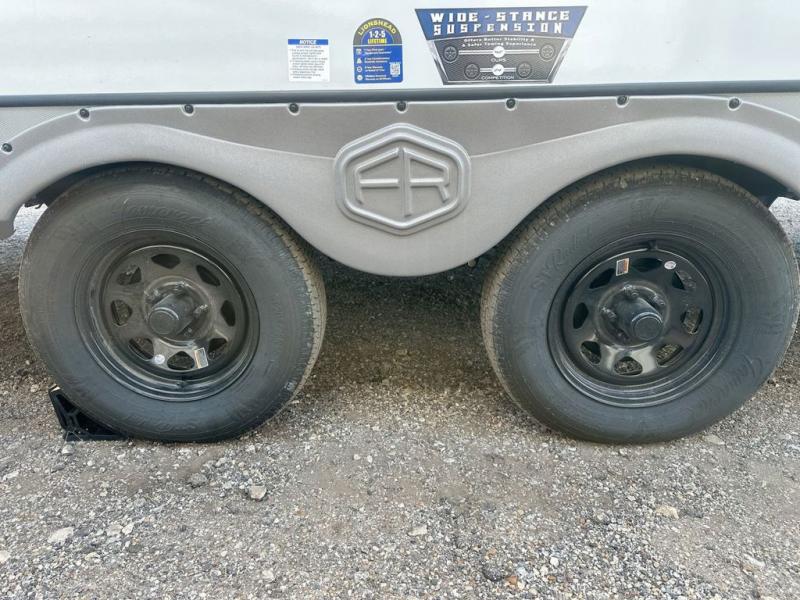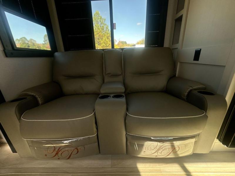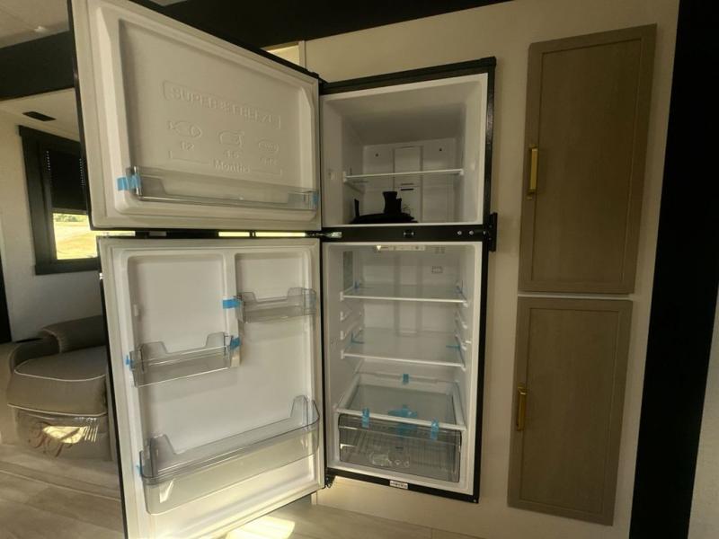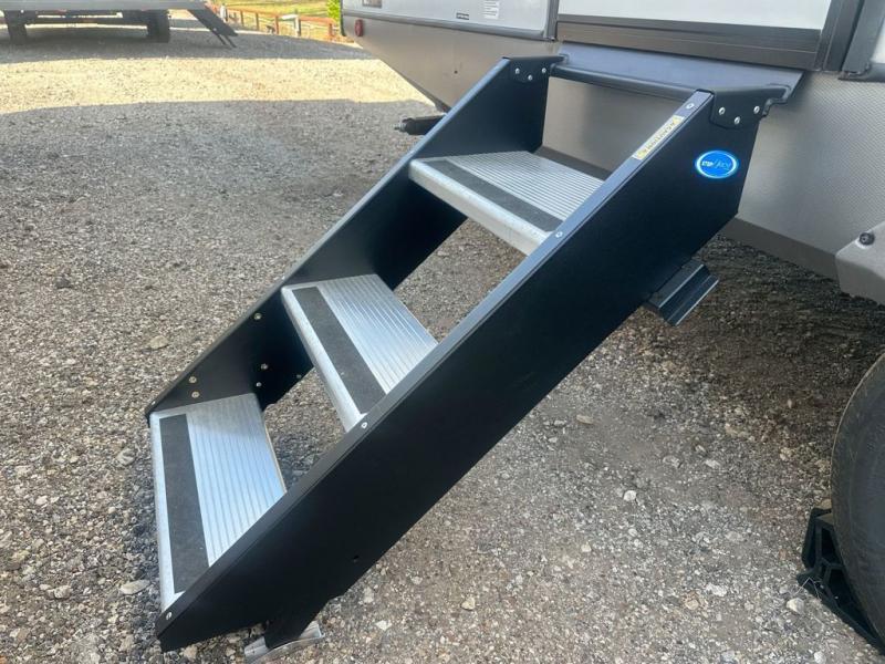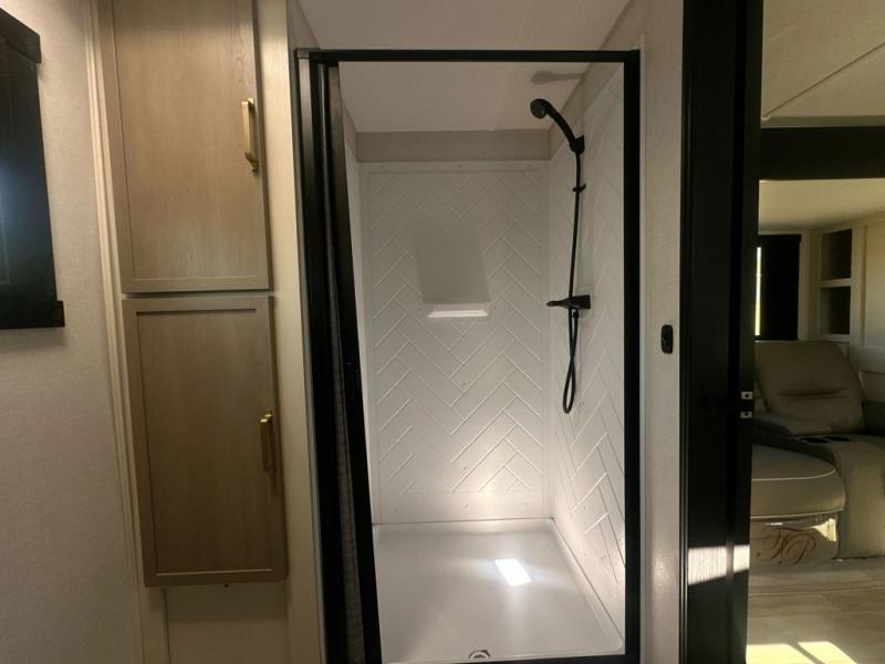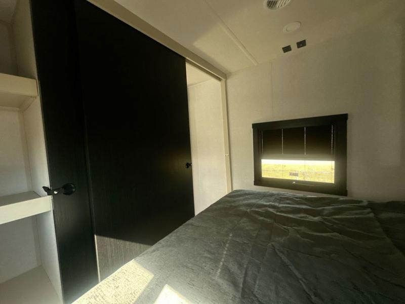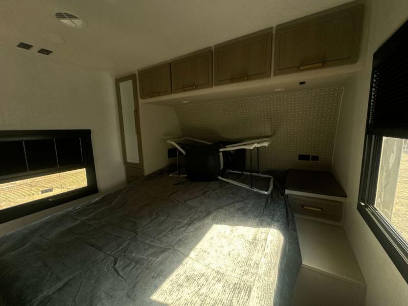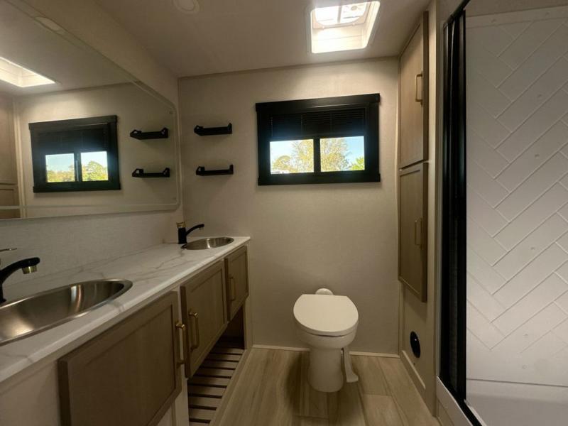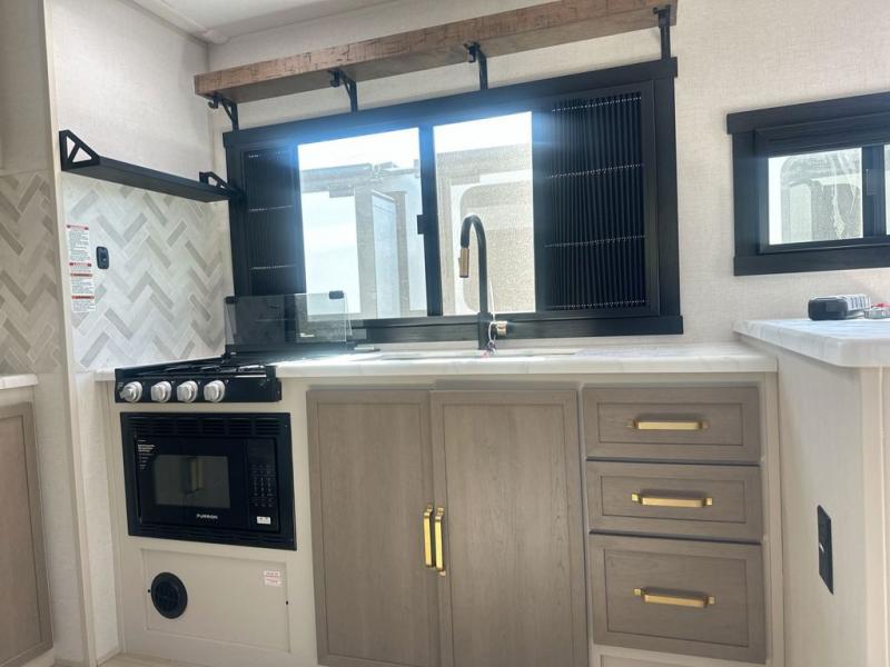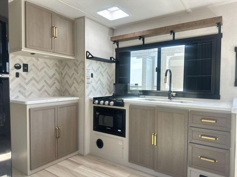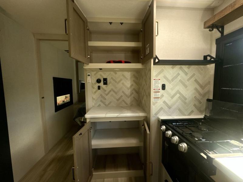 At the front of this well-designed trailer, a private bedroom offers a cozy 60" x 80" queen bed for a restful night’s sleep, complemented by overhead cabinets and a wardrobe for neatly storing clothing and essentials. Moving into the center, a spacious slide-out opens up the living area and houses a comfortable theater seat perfect for lounging after a day of adventure along with a 10 cu. ft. refrigerator and pantry to keep all your groceries and dry goods organized. Across from this space, the L-shaped kitchen provides everything you need to cook your favorite meals, featuring a three-burner range, a residential-style single-bowl undermount sink, and elegant Nordic marble countertops. At the end of the kitchen, a convenient bar top with stools creates a welcoming spot to enjoy meals or unwind with a drink. Toward the rear, the full bathroom adds a touch of luxury with a porcelain toilet, dual sinks, and an LED backlit mirror, allowing two people to get ready comfortably and without the morning rush.
