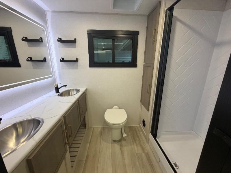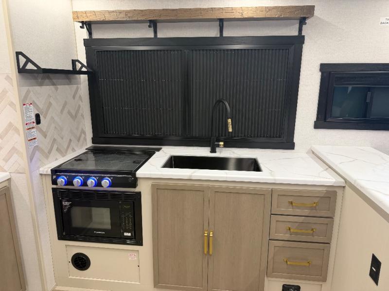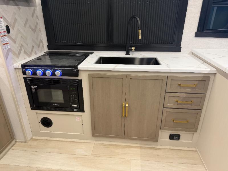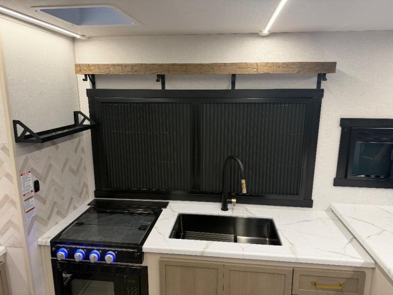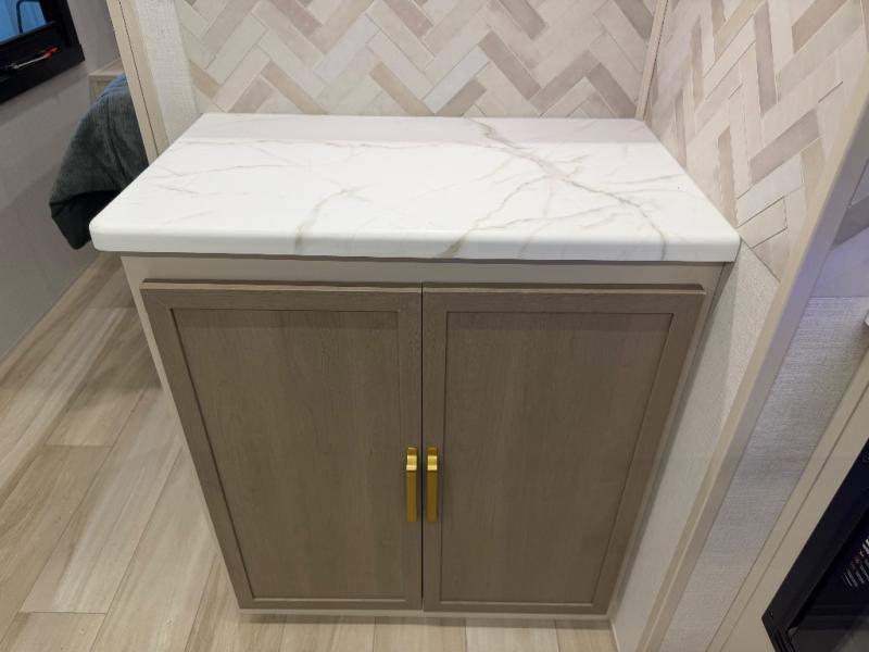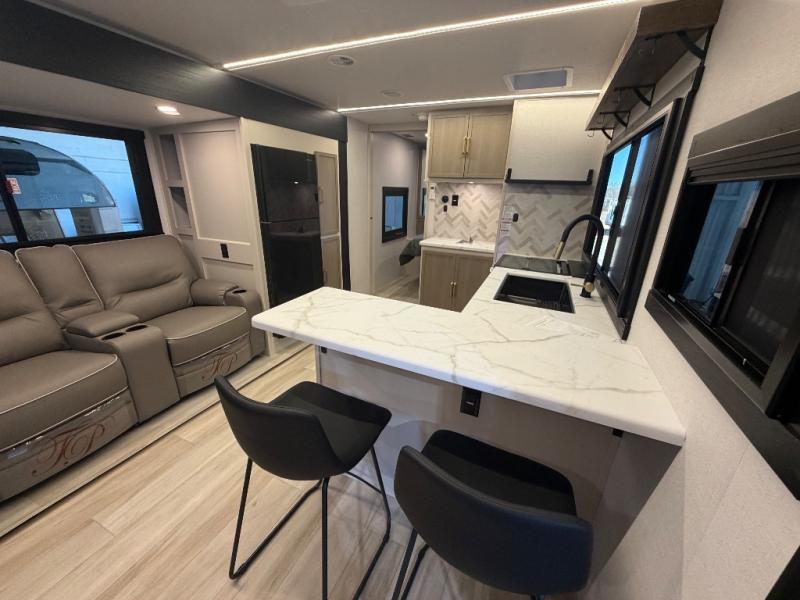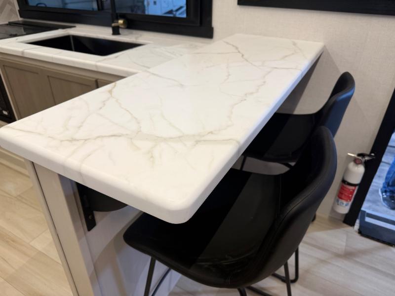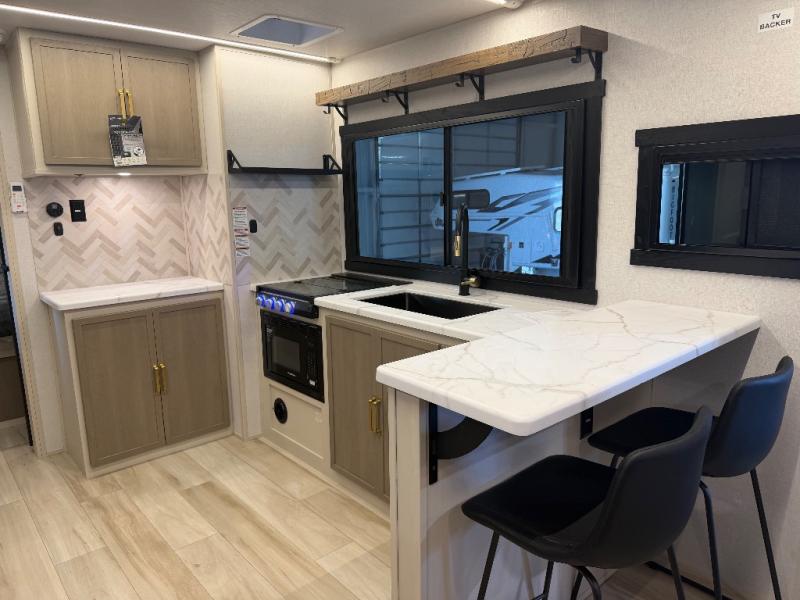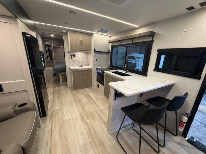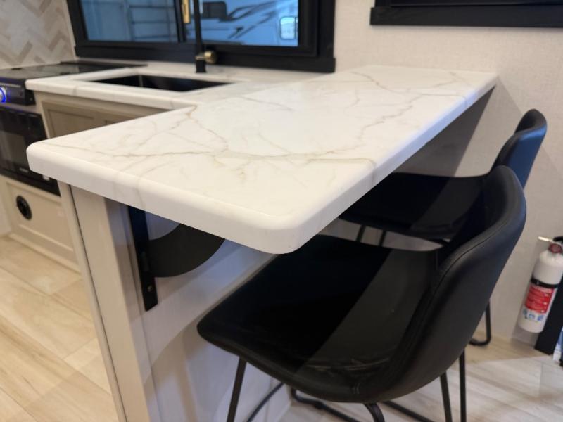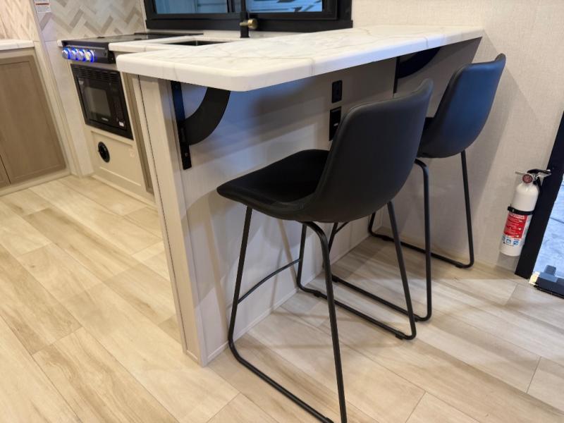 At the front of this well-designed trailer, a private bedroom offers a cozy 60" x 80" queen bed for a restful night's sleep, complemented by overhead cabinets and a wardrobe for neatly storing clothing and essentials. Moving into the center, a spacious slide-out opens up the living area and houses a comfortable theater seat perfect for lounging after a day of adventure along with a 10-cu. ft. refrigerator and pantry to keep all your groceries and dry goods organized. Across from this space, the L-shaped kitchen provides everything you need to cook your favorite meals, featuring a three-burner range, a residential-style single-bowl undermount sink, and elegant Nordic marble countertops. At the end of the kitchen, a convenient bar top with stools creates a welcoming spot to enjoy meals or unwind with a drink. Toward the rear, the full bathroom adds a touch of luxury with a porcelain toilet, dual sinks, and an LED backlit mirror, allowing two people to get ready comfortably and without the morning rush.