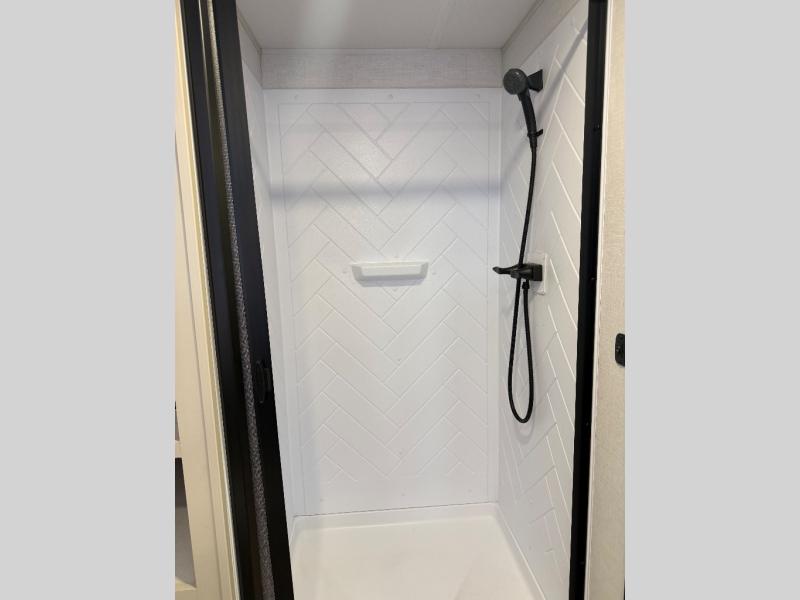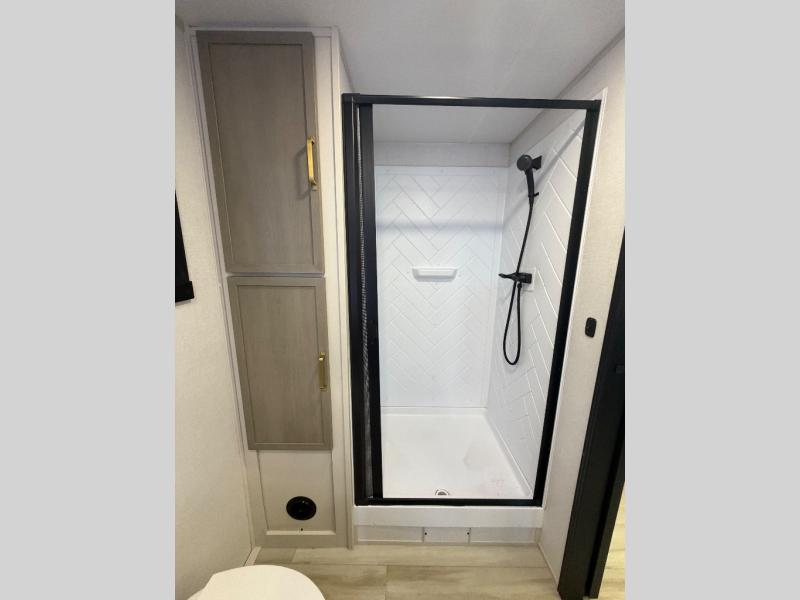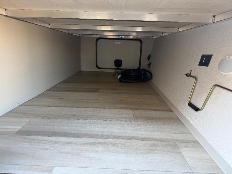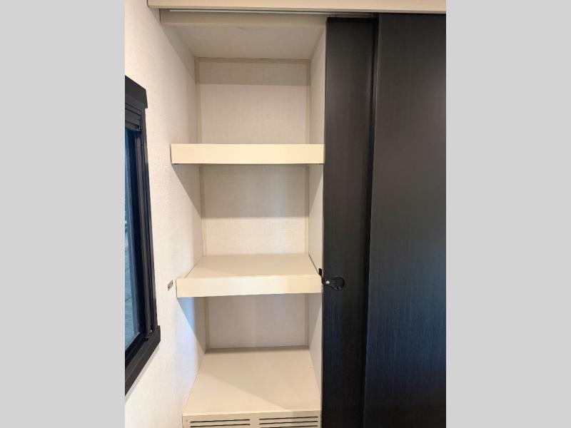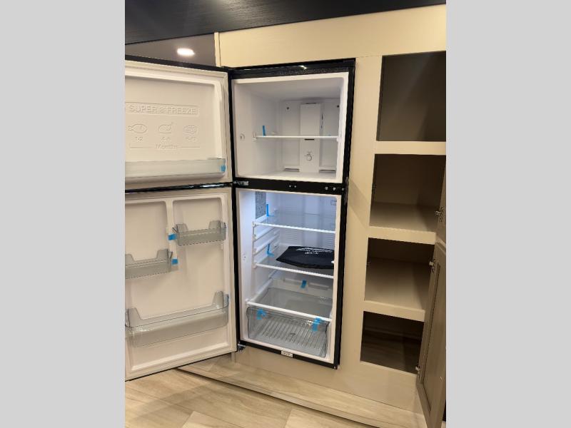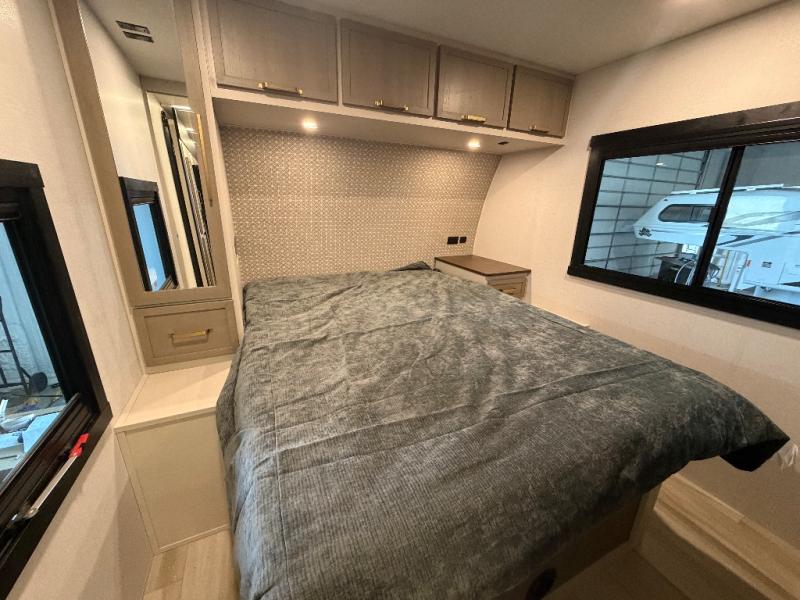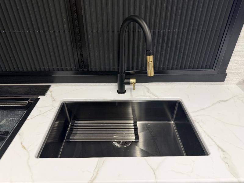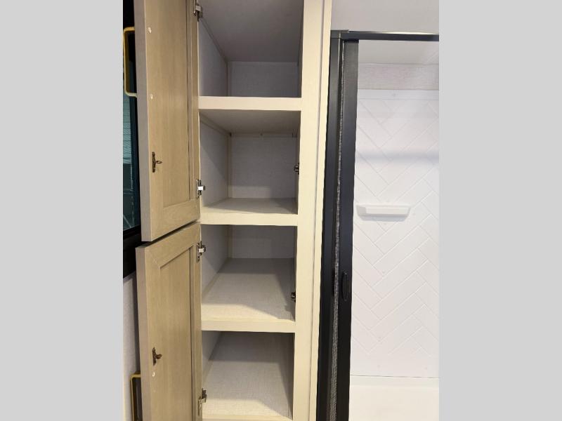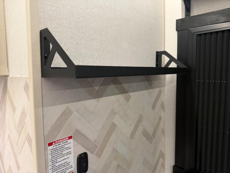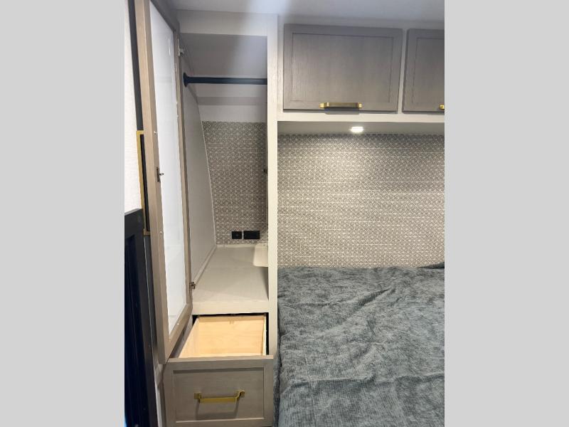At the front of this well-designed trailer, a private bedroom offers a cozy 60" x 80" queen bed for a restful night's sleep, complemented by overhead cabinets and a wardrobe for neatly storing clothing and essentials. Moving into the center, a spacious slide-out opens up the living area and houses a comfortable theater seat perfect for lounging after a day of adventure along with a 10-cu. ft. refrigerator and pantry to keep all your groceries and dry goods organized. Across from this space, the L-shaped kitchen provides everything you need to cook your favorite meals, featuring a three-burner range, a residential-style single-bowl undermount sink, and elegant Nordic marble countertops. At the end of the kitchen, a convenient bar top with stools creates a welcoming spot to enjoy meals or unwind with a drink. Toward the rear, the full bathroom adds a touch of luxury with a porcelain toilet, dual sinks, and an LED backlit mirror, allowing two people to get ready comfortably and without the morning rush.