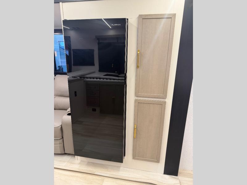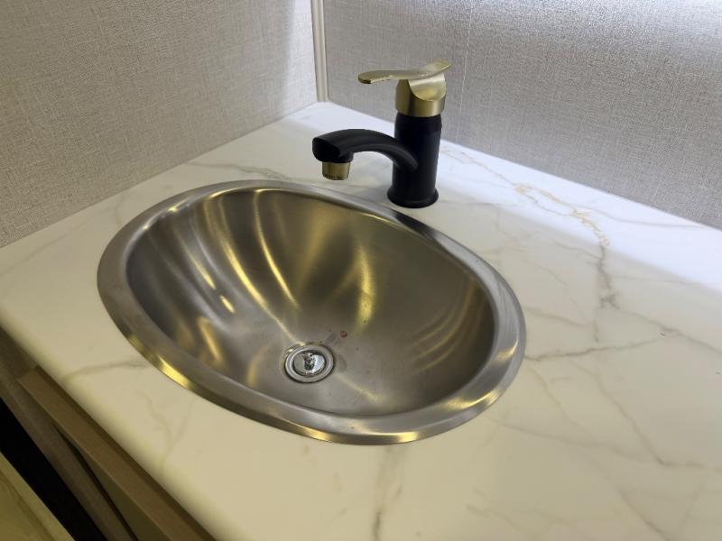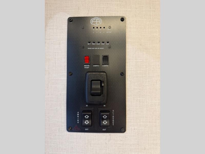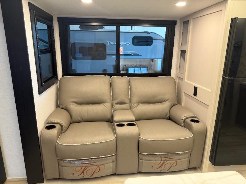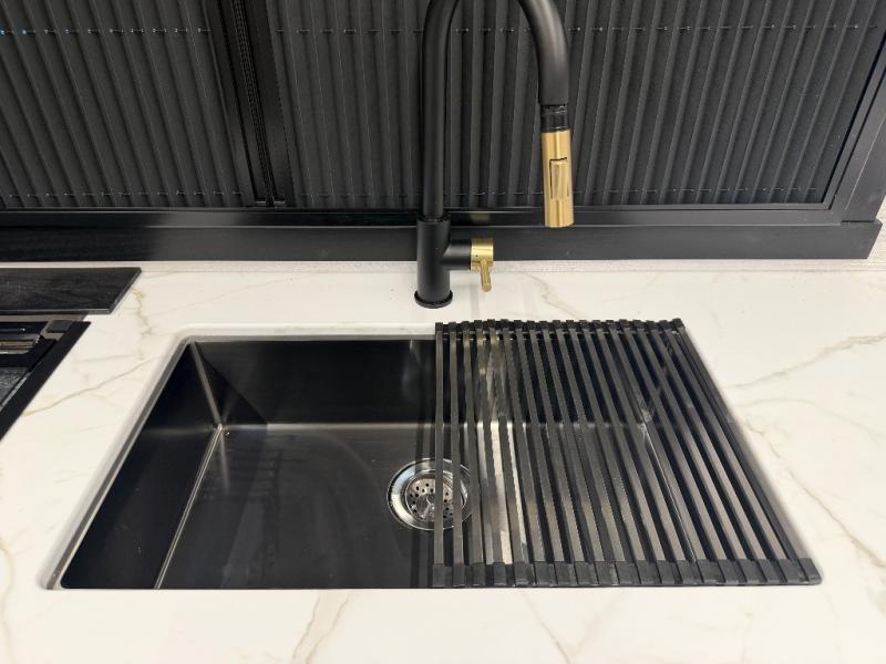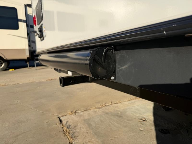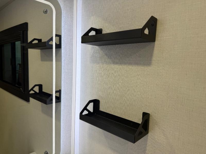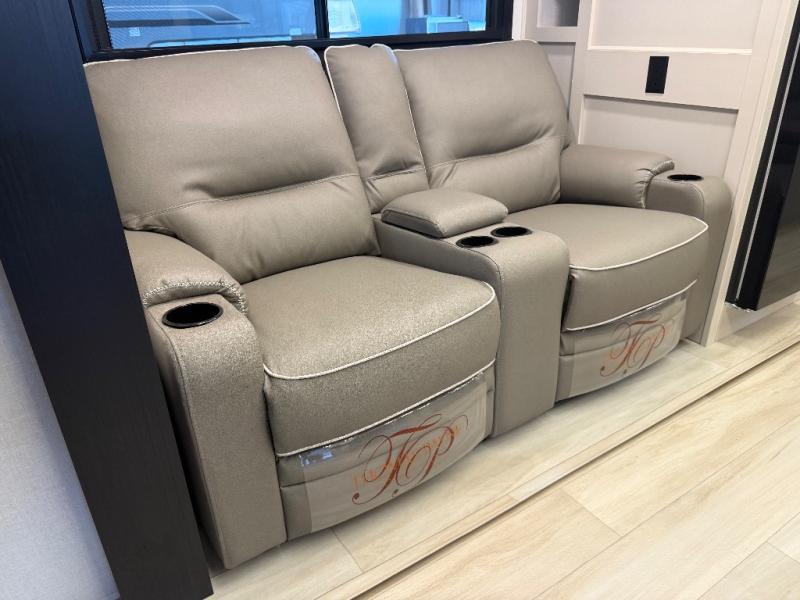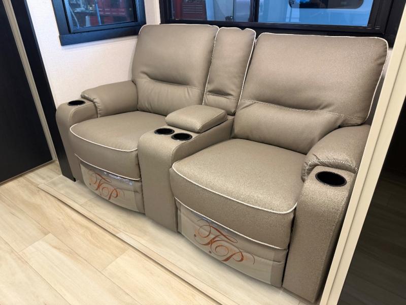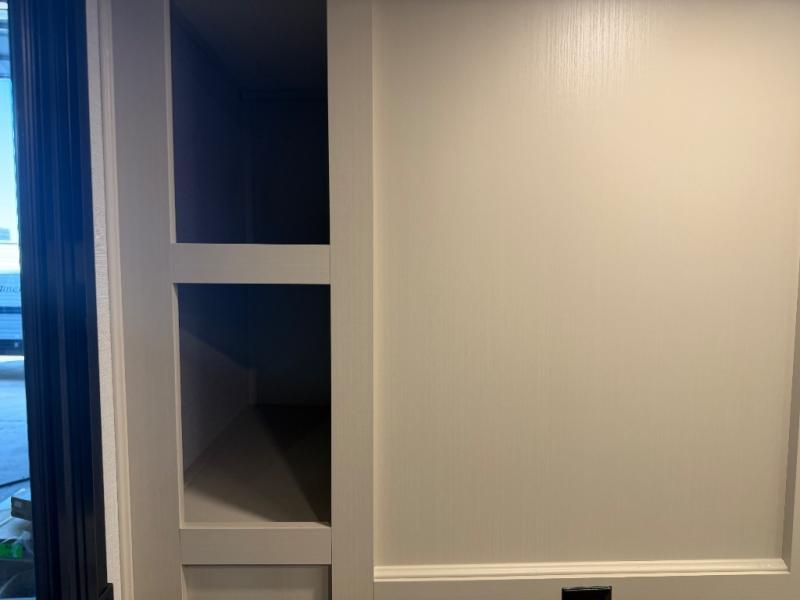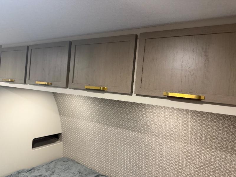 At the front of this well-designed trailer, a private bedroom offers a cozy 60" x 80" queen bed for a restful night's sleep, complemented by overhead cabinets and a wardrobe for neatly storing clothing and essentials. Moving into the center, a spacious slide-out opens up the living area and houses a comfortable theater seat perfect for lounging after a day of adventure along with a 10-cu. ft. refrigerator and pantry to keep all your groceries and dry goods organized. Across from this space, the L-shaped kitchen provides everything you need to cook your favorite meals, featuring a three-burner range, a residential-style single-bowl undermount sink, and elegant Nordic marble countertops. At the end of the kitchen, a convenient bar top with stools creates a welcoming spot to enjoy meals or unwind with a drink. Toward the rear, the full bathroom adds a touch of luxury with a porcelain toilet, dual sinks, and an LED backlit mirror, allowing two people to get ready comfortably and without the morning rush.