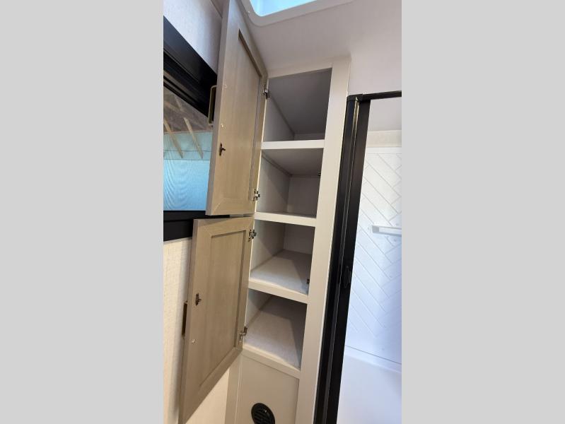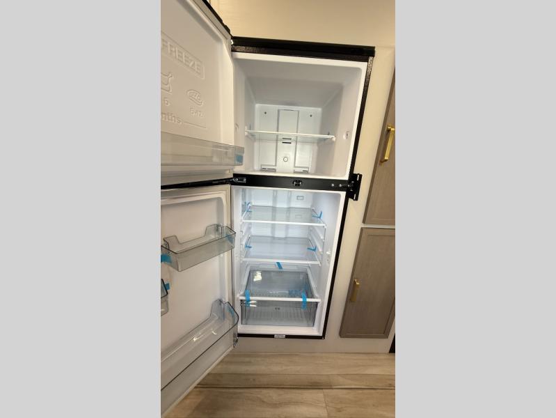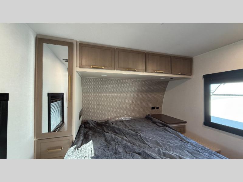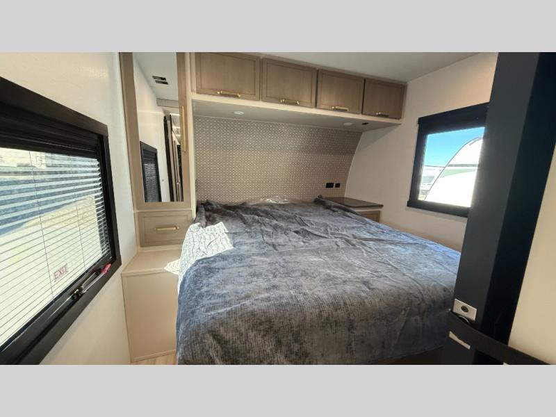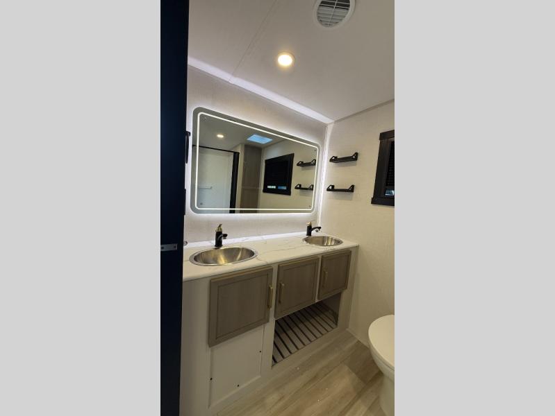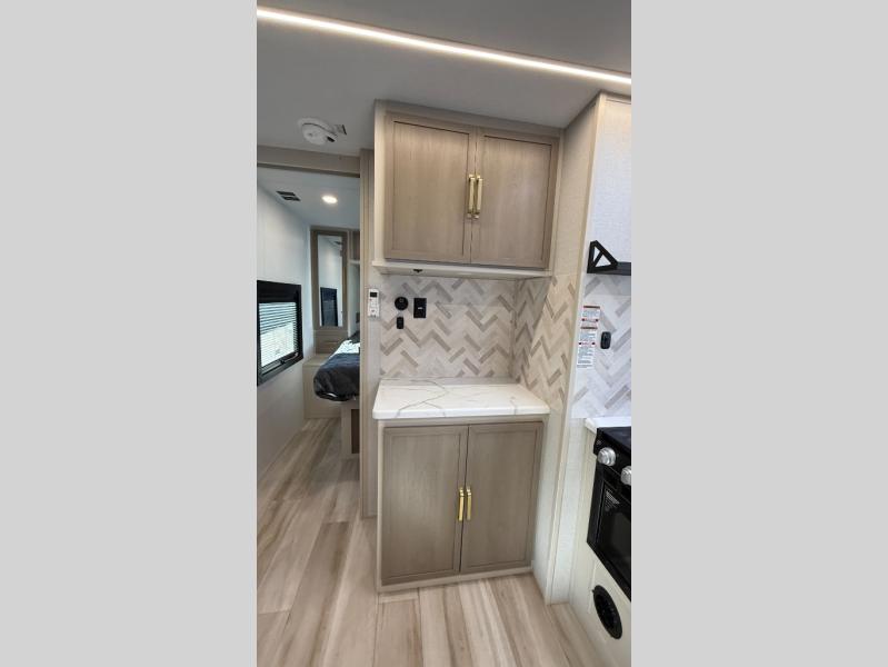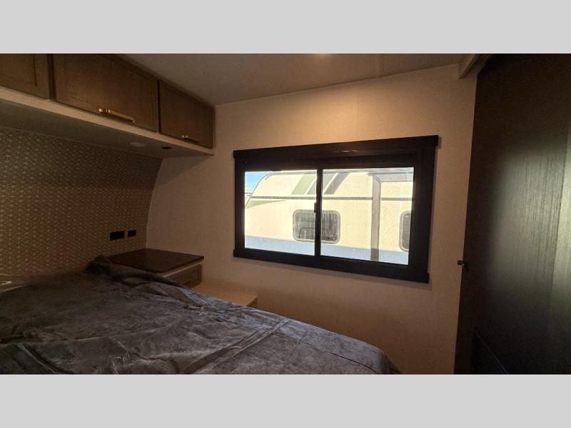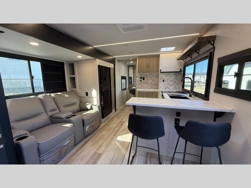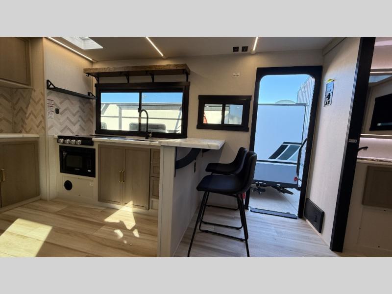 At the front of this well-designed trailer, a private bedroom offers a cozy 60" x 80" queen bed for a restful night’s sleep, complemented by overhead cabinets and a wardrobe for neatly storing clothing and essentials. Moving into the center, a spacious slide-out opens up the living area and houses a comfortable theater seat perfect for lounging after a day of adventure along with a 10 cu. ft. refrigerator and pantry to keep all your groceries and dry goods organized. Across from this space, the L-shaped kitchen provides everything you need to cook your favorite meals, featuring a three-burner range, a residential-style single-bowl undermount sink, and elegant Nordic marble countertops. At the end of the kitchen, a convenient bar top with stools creates a welcoming spot to enjoy meals or unwind with a drink. Toward the rear, the full bathroom adds a touch of luxury with a porcelain toilet, dual sinks, and an LED backlit mirror, allowing two people to get ready comfortably and without the morning rush.