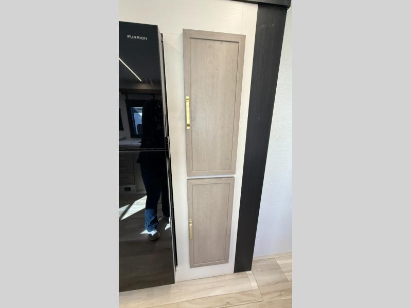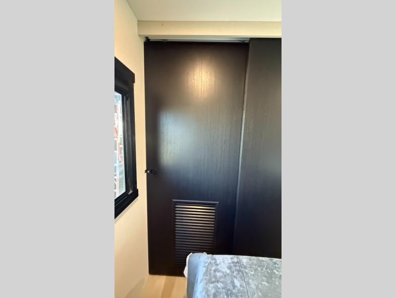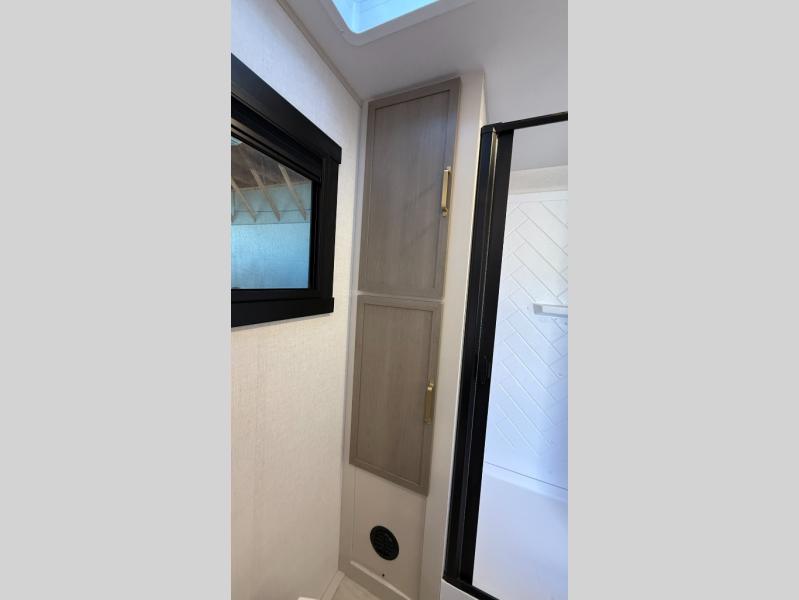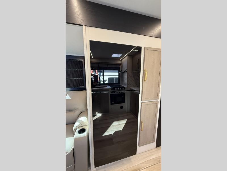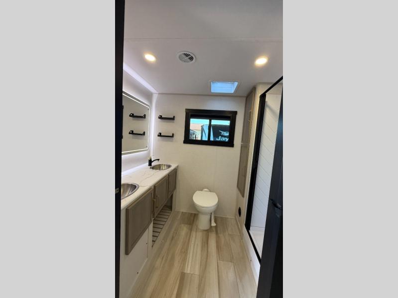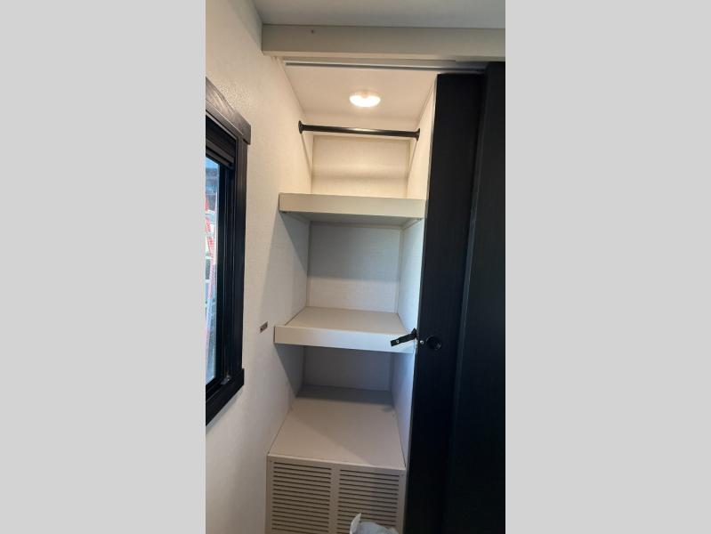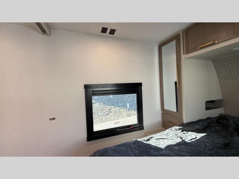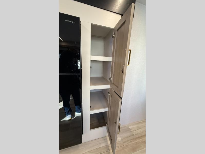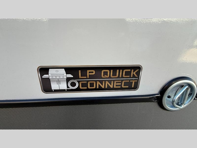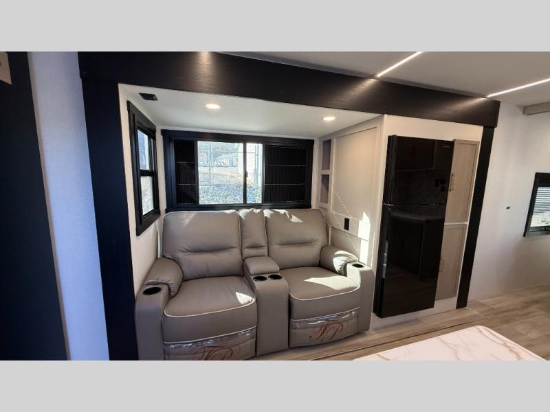 At the front of this well-designed trailer, a private bedroom offers a cozy 60" x 80" queen bed for a restful night’s sleep, complemented by overhead cabinets and a wardrobe for neatly storing clothing and essentials. Moving into the center, a spacious slide-out opens up the living area and houses a comfortable theater seat perfect for lounging after a day of adventure along with a 10 cu. ft. refrigerator and pantry to keep all your groceries and dry goods organized. Across from this space, the L-shaped kitchen provides everything you need to cook your favorite meals, featuring a three-burner range, a residential-style single-bowl undermount sink, and elegant Nordic marble countertops. At the end of the kitchen, a convenient bar top with stools creates a welcoming spot to enjoy meals or unwind with a drink. Toward the rear, the full bathroom adds a touch of luxury with a porcelain toilet, dual sinks, and an LED backlit mirror, allowing two people to get ready comfortably and without the morning rush.