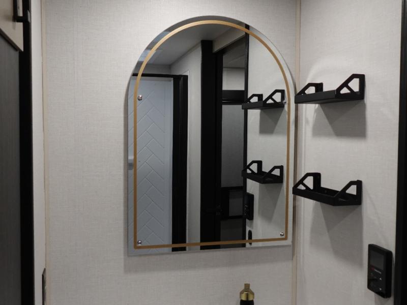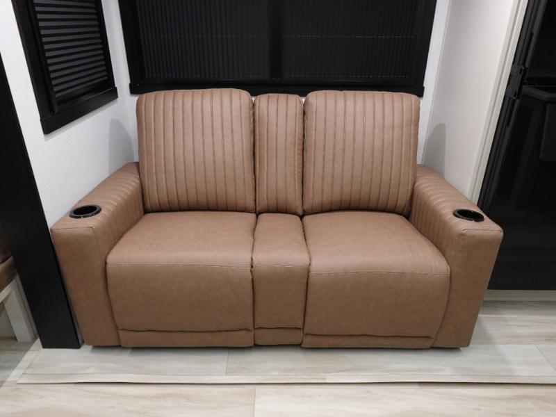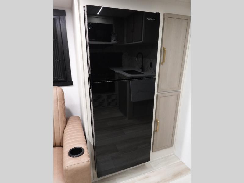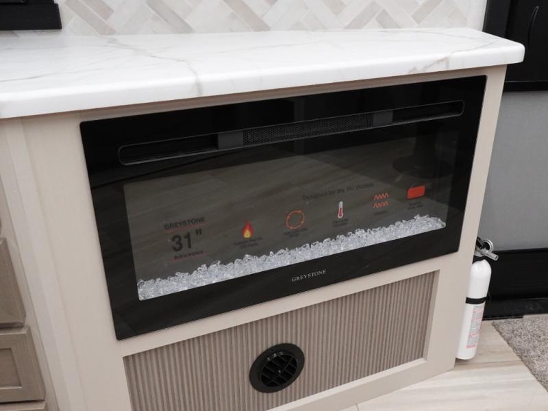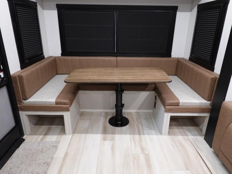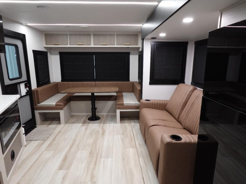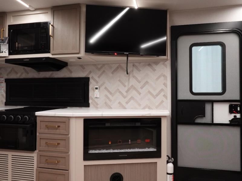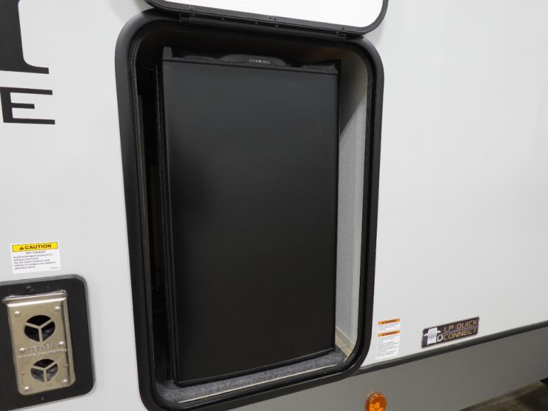 This dual entry travel trailer is perfect for your family or group of four! There is a front master bedroom up front with its own exterior entry door so you can slip out in the morning to go fish. You'll also find a queen bed with Versa-Tilt, dual bedroom wardrobes, and easy access to the walk-through bath. Any guests you have can sleep on the U-shaped dinette in the back, and in the morning, everyone can enjoy breakfast here before heading out for the day. You can prepare lunch in the full kitchen that includes a countertop extension for convenience, plus a 12V refrigerator and a pantry for food storage. If the weather is nice, you might just want to cook on the exterior griddle, and the outdoor refrigerator will let you store cold drinks! On the rainy days you can plan to relax on the theater seating within the slide out and watch a movie on the 40" LED TV. There is even a fireplace for a more cozy feel.