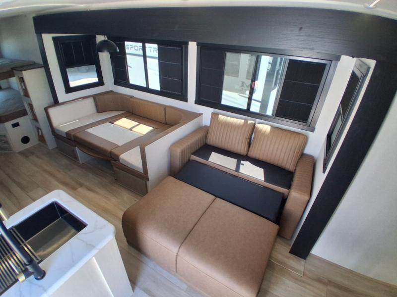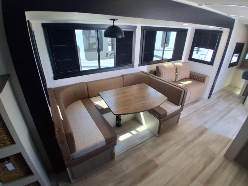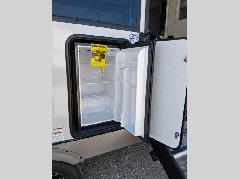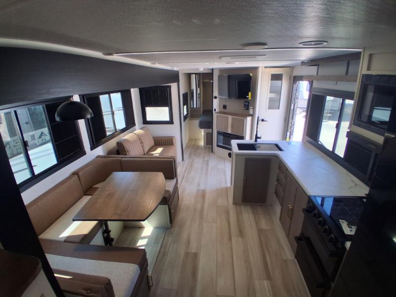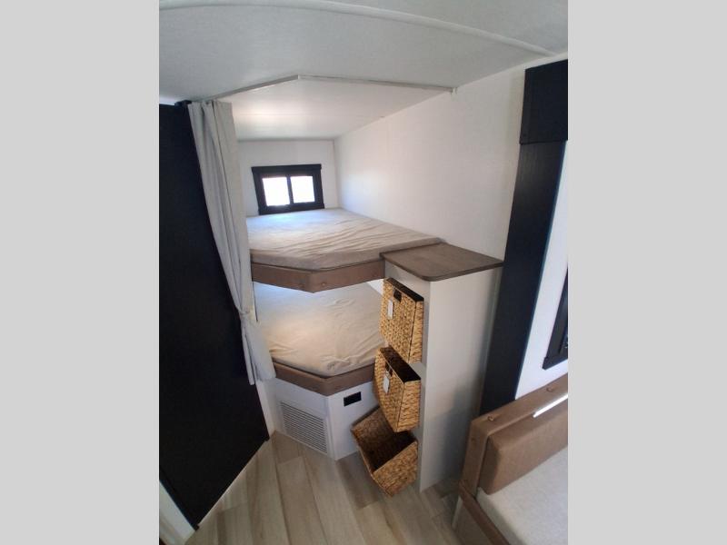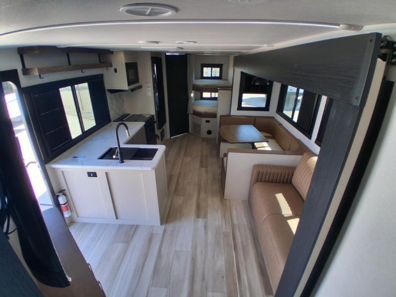 The whole gang will love camping in this bunkhouse model! Since the double-size bunks are right beside the full bath, the little ones can easily use it at night, plus you'll find the second entry door here for added convenience! The combined kitchen and living area includes a U-shaped dinette and tri-fold sofa in great view of the entertainment center with a TV and fireplace. A front private bedroom will provide you with your own space at night, and you're sure to sleep great on the queen bed with Versa Tilt. Head outdoors to enjoy the 20' awning with LED lights and the camp kitchen!