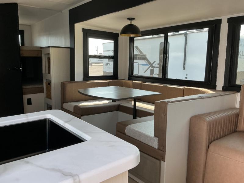 The whole gang will love camping in this bunkhouse model! Since the double-size bunks are right beside the full bath, the little ones can easily use it at night, plus you'll find the second entry door here for added convenience! The combined kitchen and living area include a U-shaped dinette and tri-fold sofa in great view of the entertainment center with storage below. A front private bedroom will provide you with your own space at night, and you're sure to sleep great on the 60" x 80" queen bed. Head outdoors to enjoy the 20' awning with LED lights and the camp kitchen!