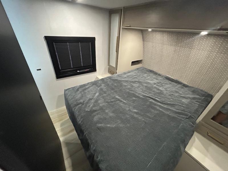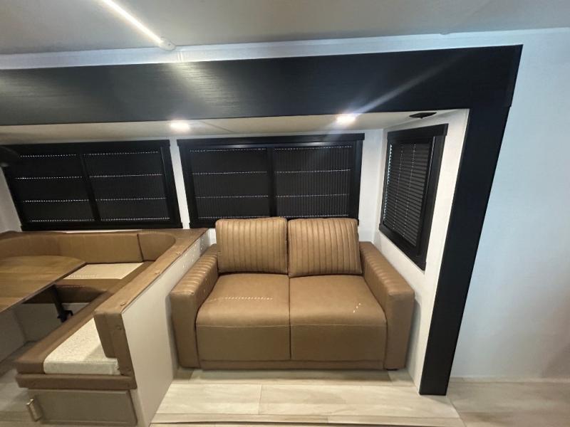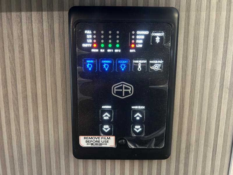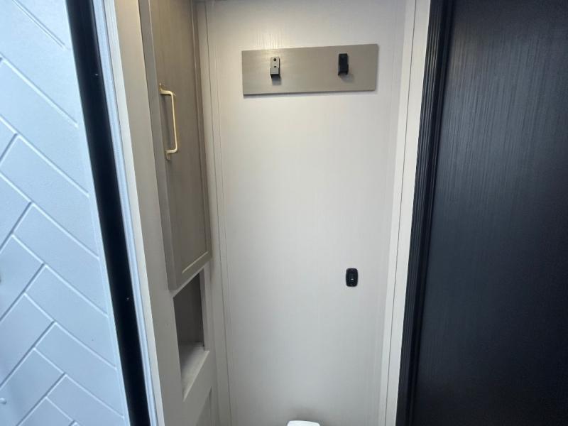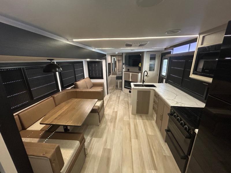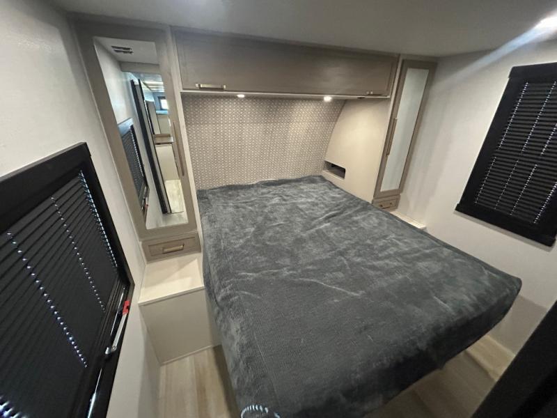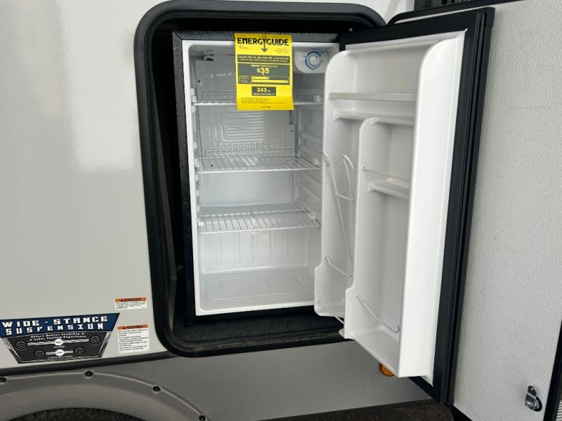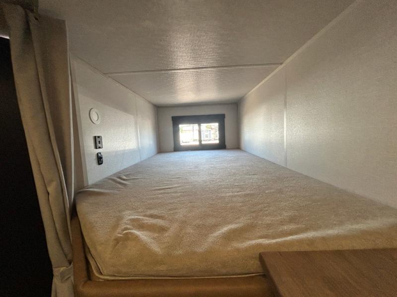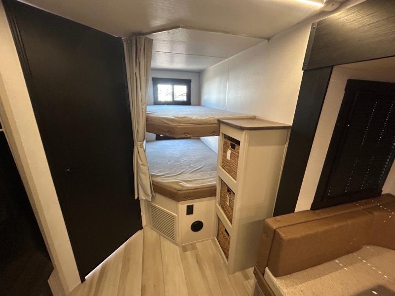 The whole gang will love camping in this bunkhouse model! Since the double-size bunks are right beside the full bath, the little ones can easily use it at night, plus you'll find the second entry door here for added convenience! The combined kitchen and living area includes a U-shaped dinette and tri-fold sofa in great view of the entertainment center with a TV and fireplace. A front private bedroom will provide you with your own space at night, and you're sure to sleep great on the queen bed with Versa Tilt. Head outdoors to enjoy the 20' awning with LED lights and the camp kitchen!