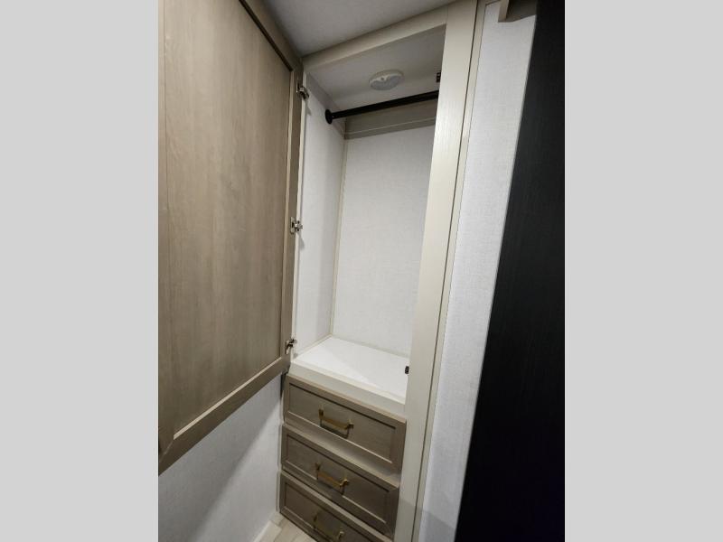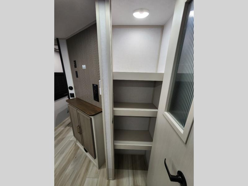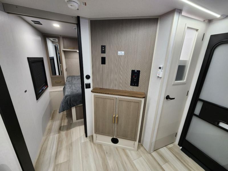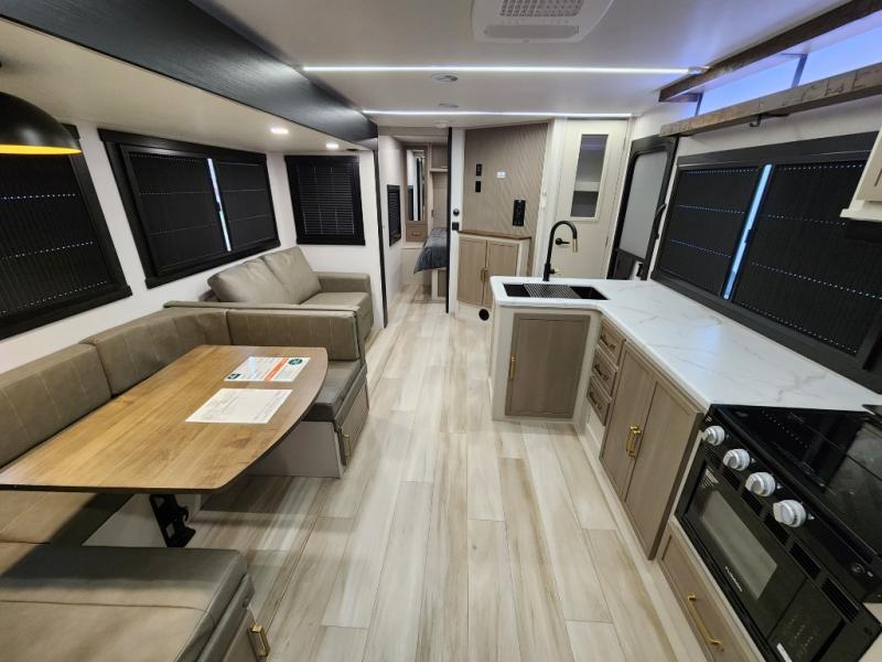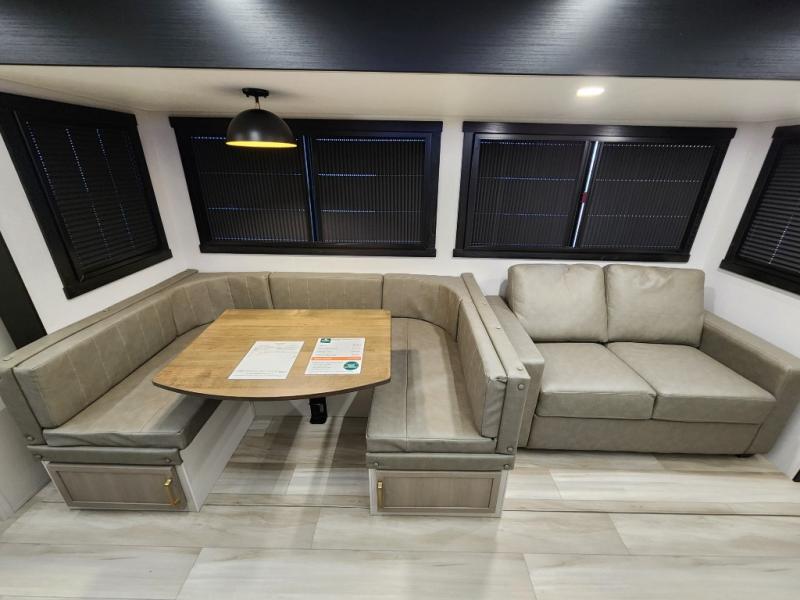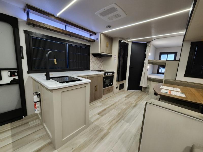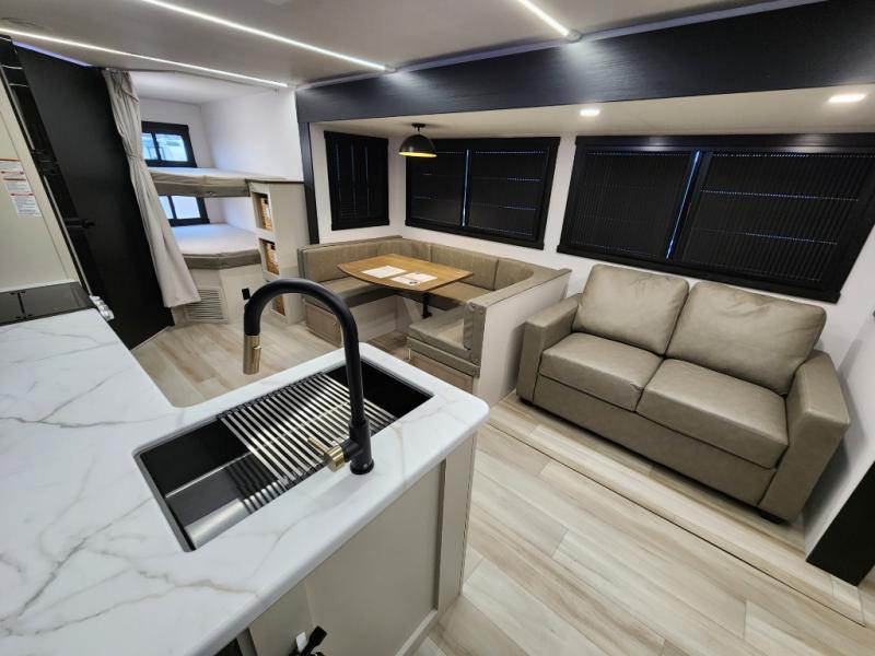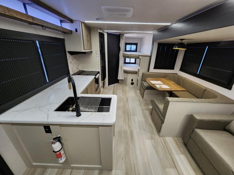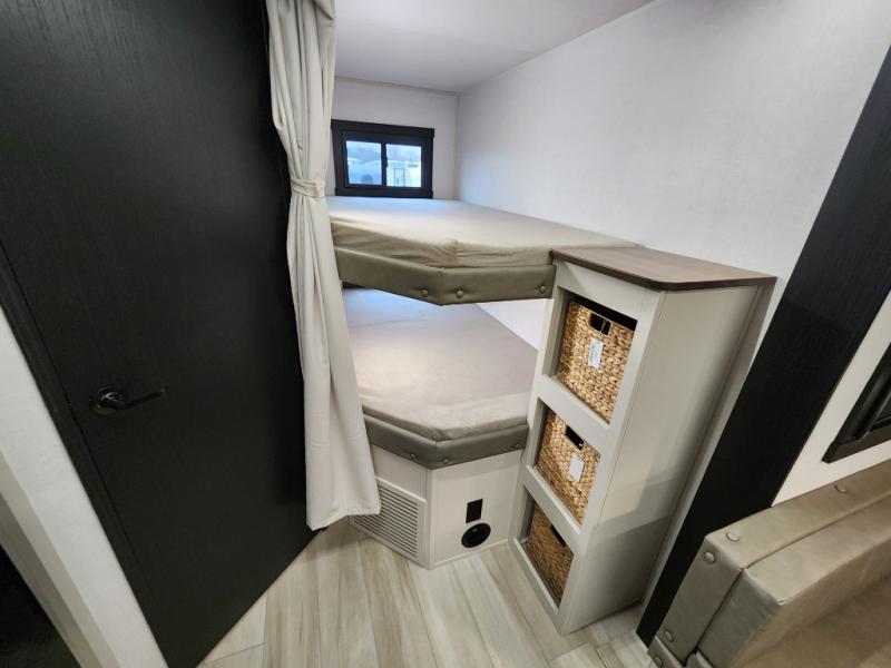 The whole gang will love camping in this bunkhouse model! Since the double-size bunks are right beside the full bath, the little ones can easily use it at night, plus you'll find the second entry door here for added convenience! The combined kitchen and living area includes a U-shaped dinette and tri-fold sofa in great view of the entertainment center with a TV and fireplace. A front private bedroom will provide you with your own space at night, and you're sure to sleep great on the queen bed with Versa Tilt. Head outdoors to enjoy the 20' awning with LED lights and the camp kitchen!
