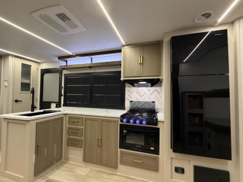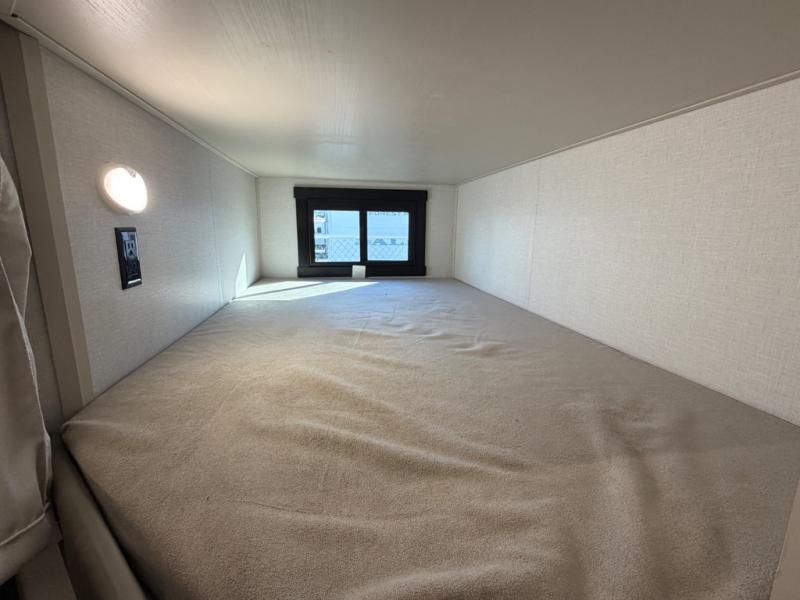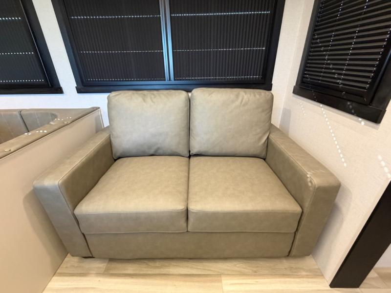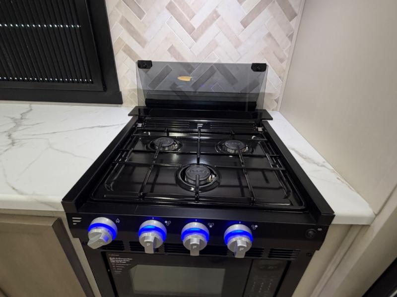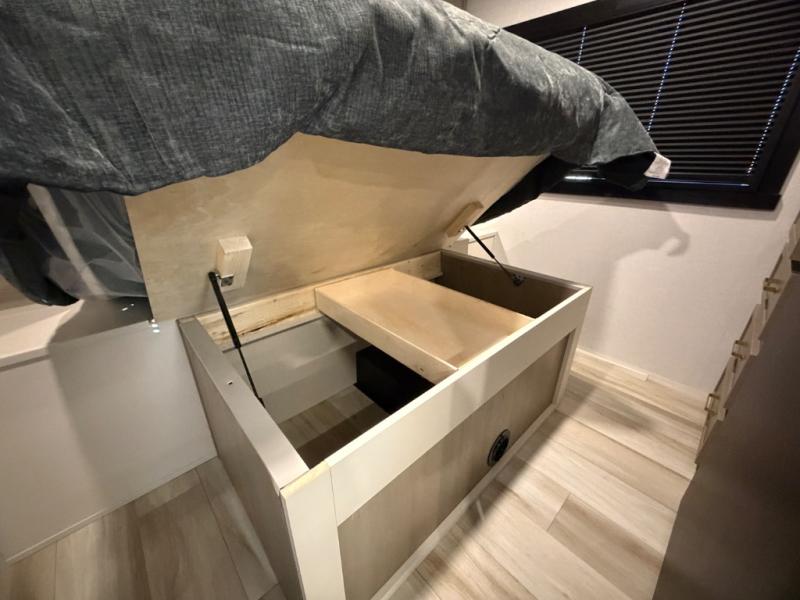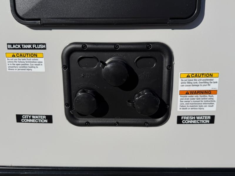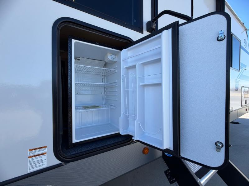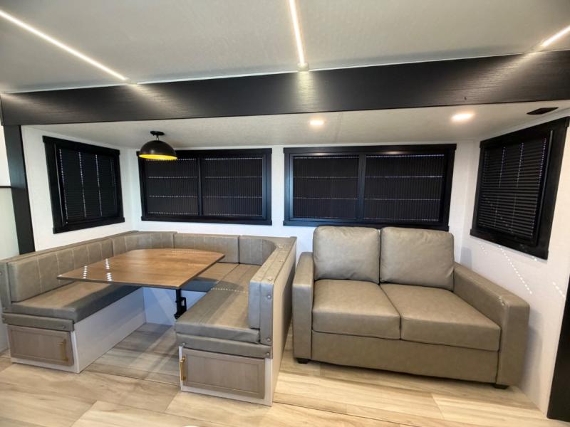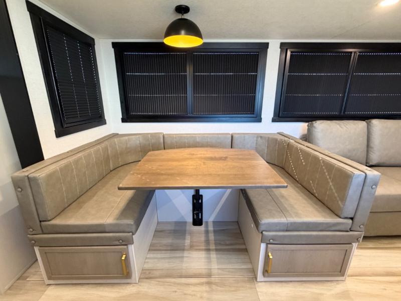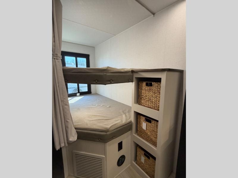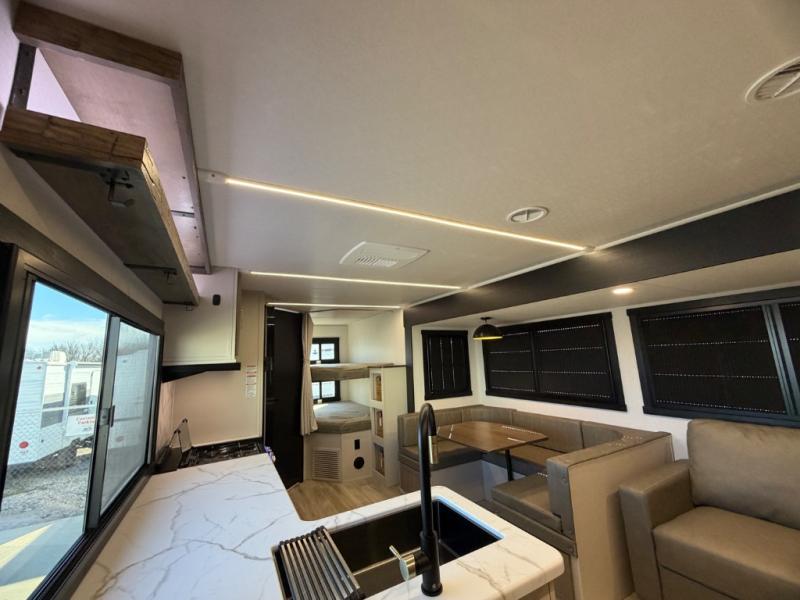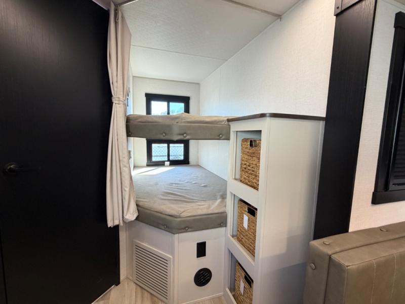 The whole gang will love camping in this bunkhouse model! Since the double-size bunks are right beside the full bath, the little ones can easily use it at night, plus you'll find the second entry door here for added convenience! The combined kitchen and living area include a U-shaped dinette and tri-fold sofa in great view of the entertainment center with storage below. A front private bedroom will provide you with your own space at night, and you're sure to sleep great on the 60" x 80" queen bed. Head outdoors to enjoy the 20' awning with LED lights and the camp kitchen!
