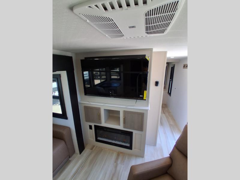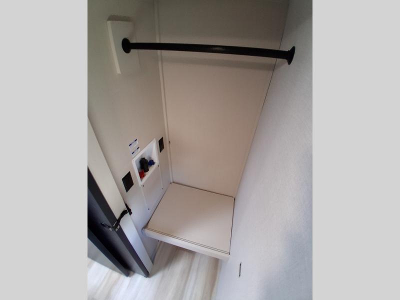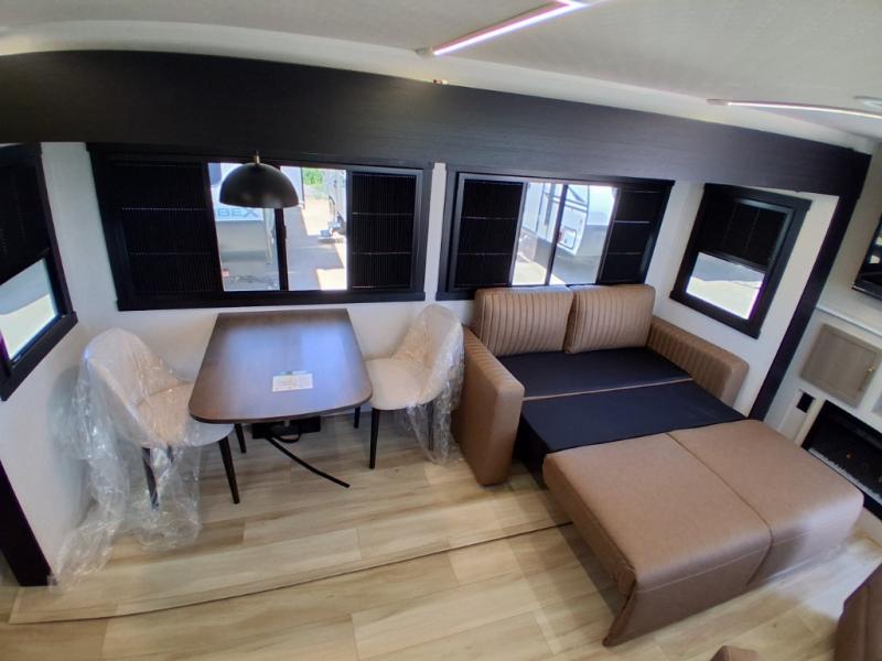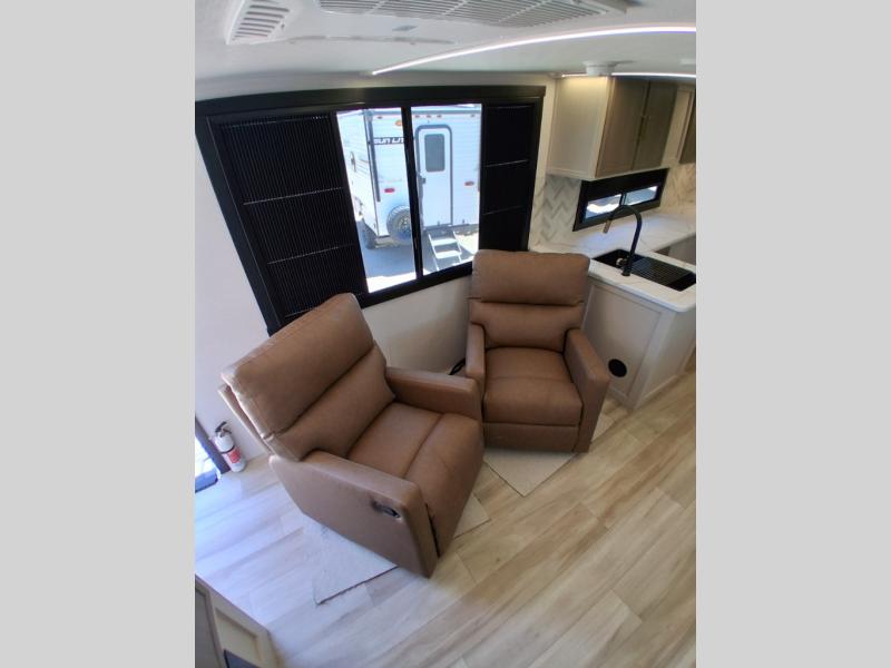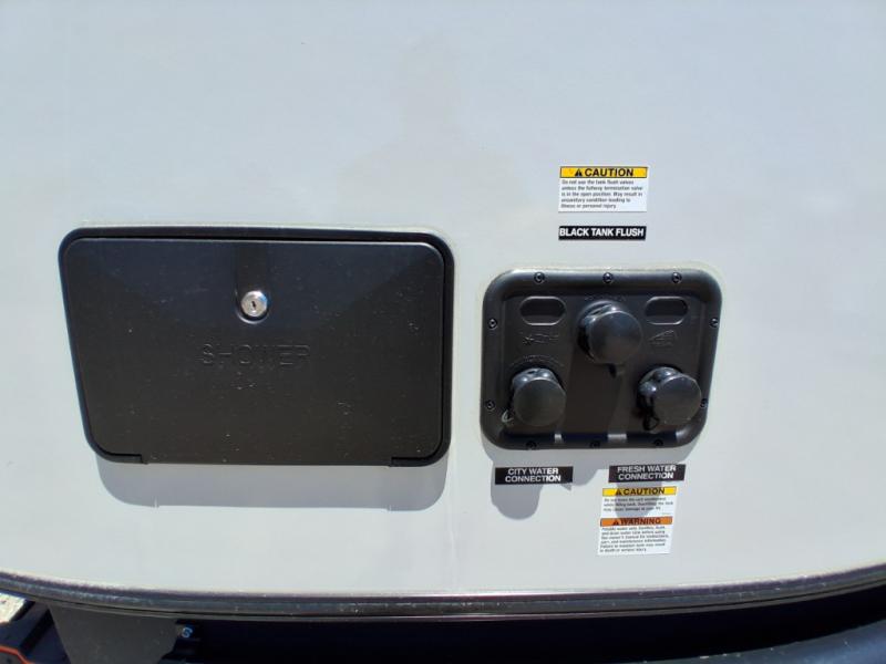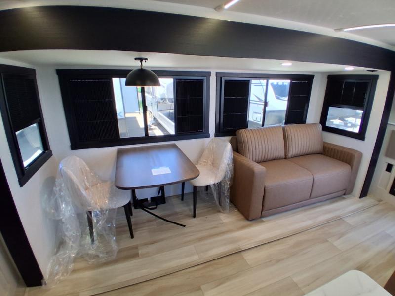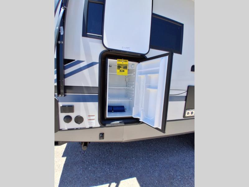 When you need to get away to the great outdoors, you won't be leaving creature comforts at home with this trailer in tow! Once you arrive at your campsite, set up the patio awning with LED lights, then make lunch on the exterior griddle with a refrigerator. After you've went on a hike to stretch your legs, you can get cleaned up in the full bath instead of using the camp's facilities. There is a rear kitchen with ample counter space, a three burner cooktop, plus a pantry and a 12V refrigerator for food. Your crew can get comfortable on the tri-fold sofa, booth dinette, or the two lounge chairs and watch a movie on the 40" LED TV. This model also includes a closet with washer and dryer prep to make full time RV living easier than ever!