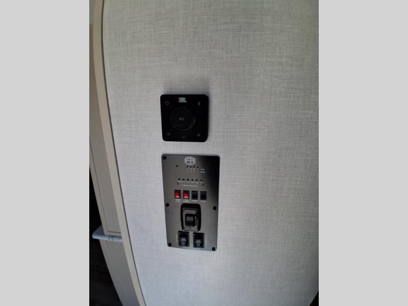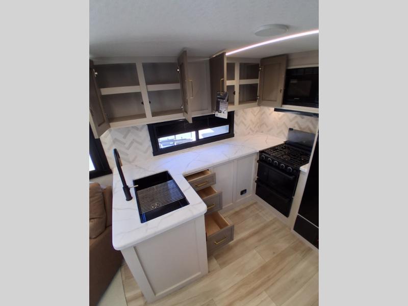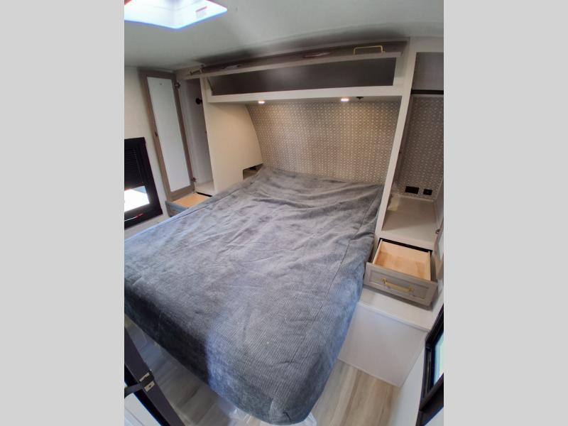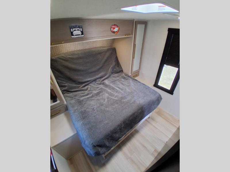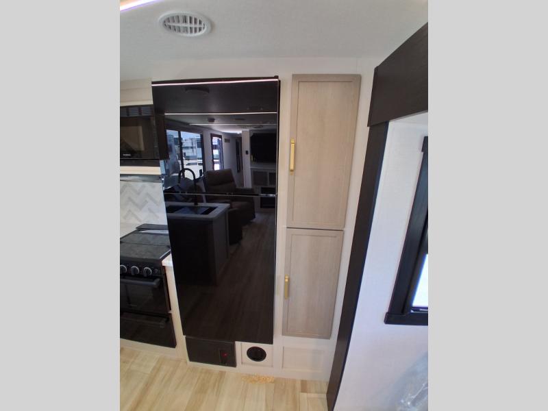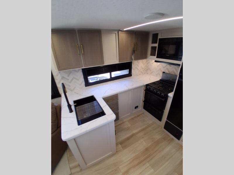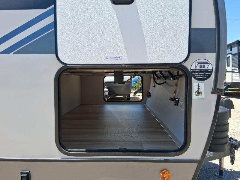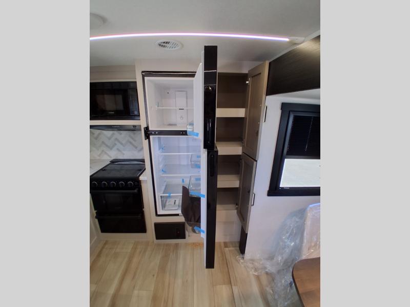 When you need to get away to the great outdoors, you won't be leaving creature comforts at home with this trailer in tow! Once you arrive at your campsite, set up the patio awning with LED lights, then make lunch on the exterior griddle with a refrigerator. After you've went on a hike to stretch your legs, you can get cleaned up in the full bath instead of using the camp's facilities. There is a rear kitchen with ample counter space, a three burner cooktop, plus a pantry and a 12V refrigerator for food. Your crew can get comfortable on the tri-fold sofa, booth dinette, or the two lounge chairs and watch a movie on the 40" LED TV. This model also includes a closet with washer and dryer prep to make full time RV living easier than ever!