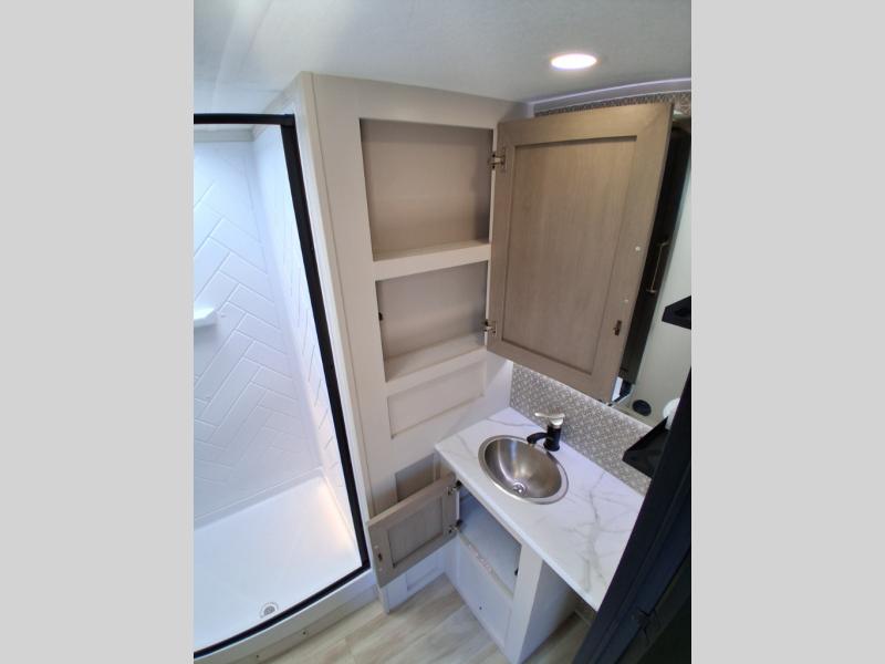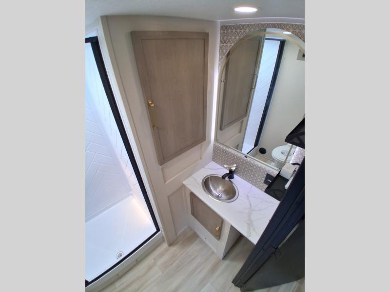 With any Salem Hemisphere Hyper-Lyte travel trailer by Forest River, you will appreciate a wide stance axle and Maxxis radial tires for smooth towing, plus laminated "Aluma Frame" sidewalls and floor for added durability. There are also square windows with built-in shades with reflecting thermal-foil backing to help keep your trailer cool during the summer. The 2" accessory hitch receiver will allow you to bring along more camp gear and the tankless water heater is a feature you won't want to camp without! Inside, you'll find Temple Cherry cabinetry, wood door casings in place of plastic, a residential single bowl undermount sink, and many more comforts. Outside, your furry friend will be happy with the shaded pet tether and security hook, and there is even an outside shower with hot and cold water to fill the dogs water bowl and wash off hiking boots!