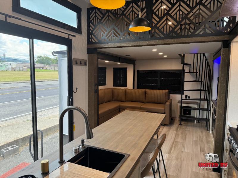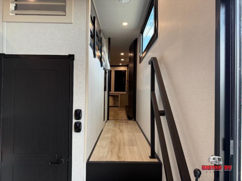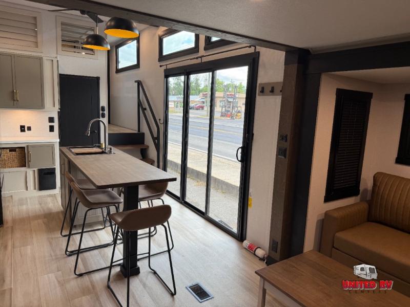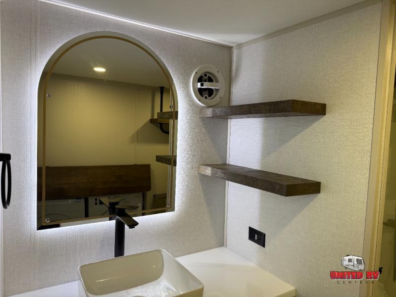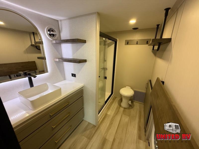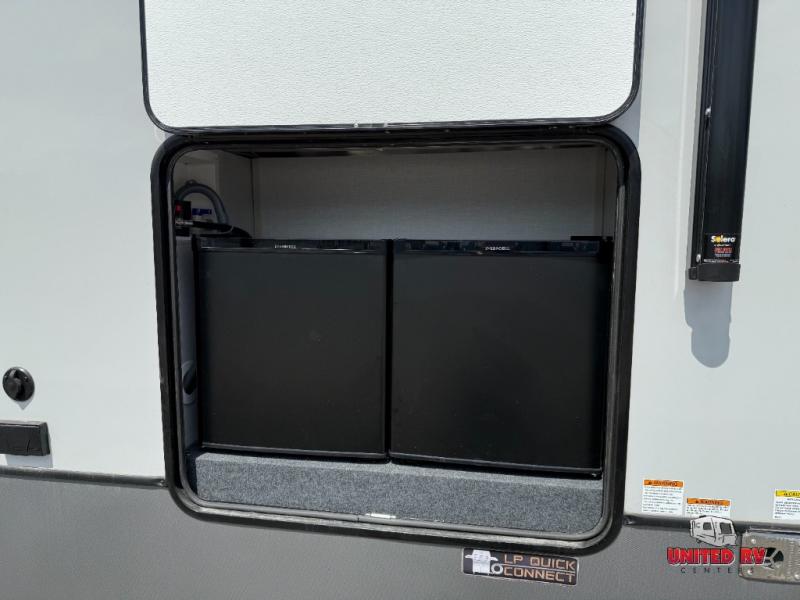 The Salem Hemisphere ROOST fifth wheels resemble a destination trailer that will be giving you residential vibes! The premium Alley Grey high-gloss gel coat fiberglass sidewalls are ultra sleek, and the flat pitched roof sheds water to the off-door side for added comfort. A Race Track A/C duct system provides maximum cooling, and the AccessiBelly underbelly with 12V tank heaters on all holding tanks will help extend your camping season. There are high-end solid surface and maple-stained wood countertops inside, along with residential-inspired wood door casings, and 6' 8" clearance in all rooms, excluding lofts. Additional features include a Gun Metal grey kitchen sink, backlit mirrors in the bathrooms, motion sensor lights by the spiral stair cases, and back up camera prep if you want the option to make parking easier than ever.