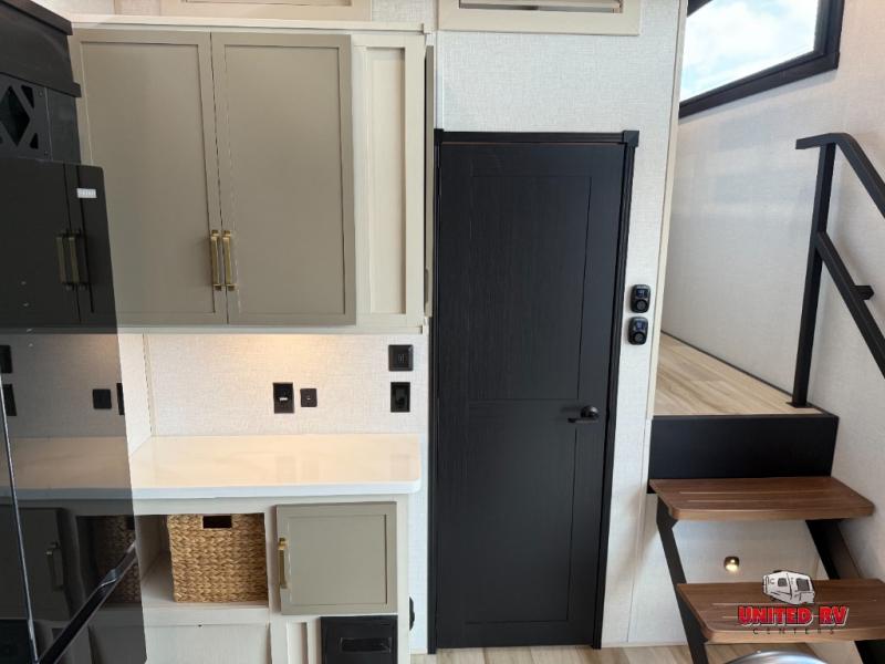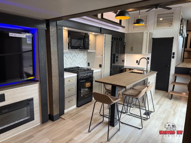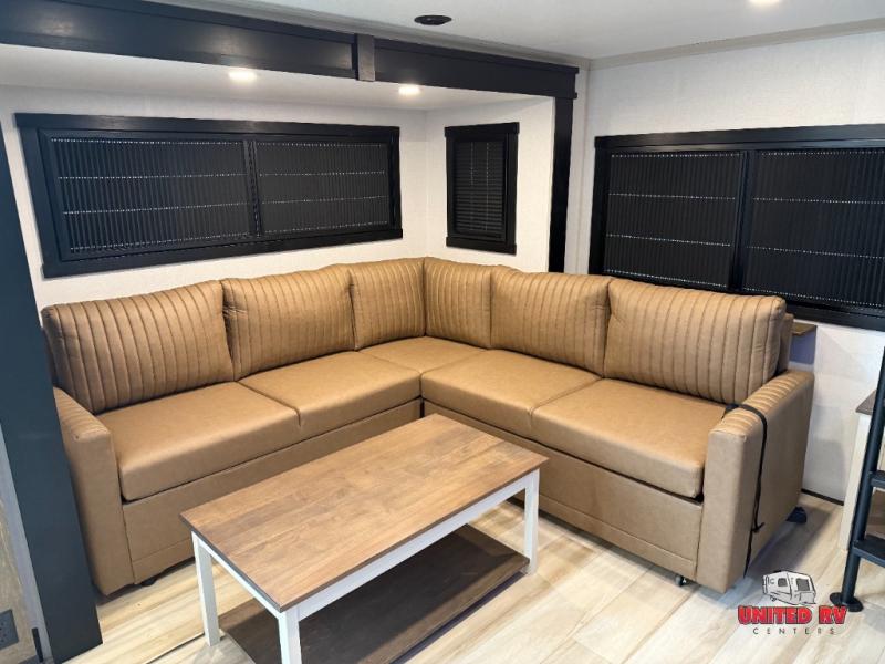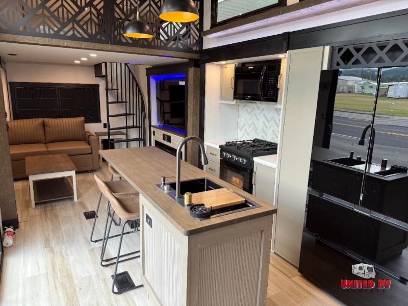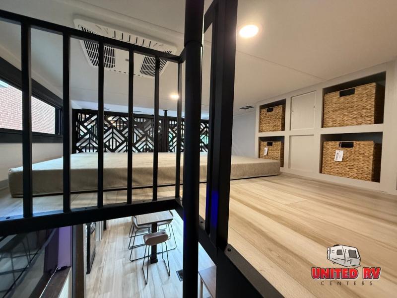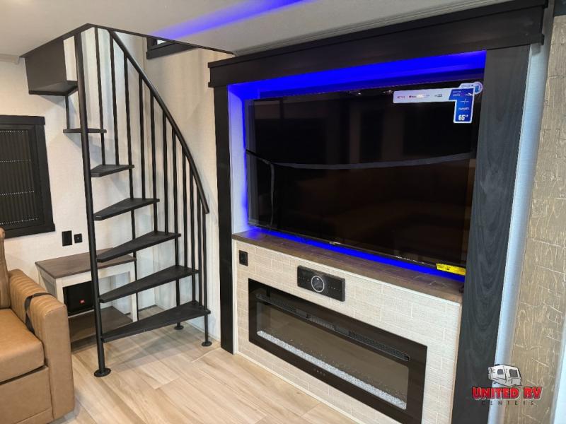 Introducing a new RV of its kind, the ROOST43 is a destination-style fifth wheel you are sure to love! There are two levels, making it feel more like home, and you can sleep six to eight each night. The master bedroom includes a custom king bed slide out, a 32" TV and fireplace, a desk/vanity, plus a half bath for convenience. A custom king-size bed is also found in the front loft, and there are storage cubbies plus a coax/110V outlet here to plug in chargers or a laptop. The second loft in the back includes spiral stairs, two bunk mats, a wardrobe, and cubby cubes here also for your guests' things. Some of the stand-out features you'll find on the first level are the sectional sofa with a coffee table, an entertainment center with a 65" TV, a kitchen island with five chairs, and a fully-equipped kitchen. The 20 cu. ft. 12V refrigerator and pull-out pantry will let you stock up on food, and the kitchen hutch will be perfect for nice dishes. The full bath on this model is one to remember; there is a one-piece fiberglass shower with a teak seat, a flip-up shelf and a washer/dryer, a backlit mirror, and more. And we haven't even touched on the exterior features, such as the pull-out tray, outdoor refrigerators, 20' awning, and more!