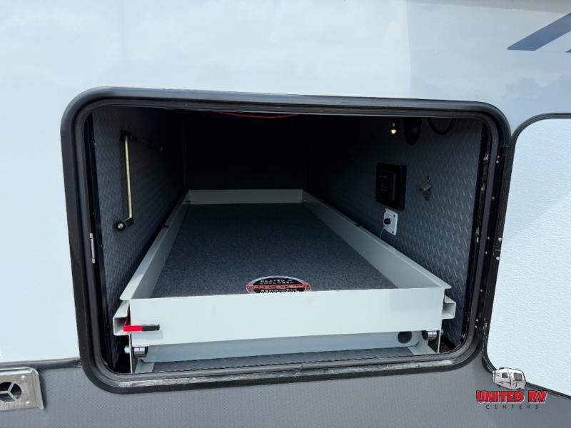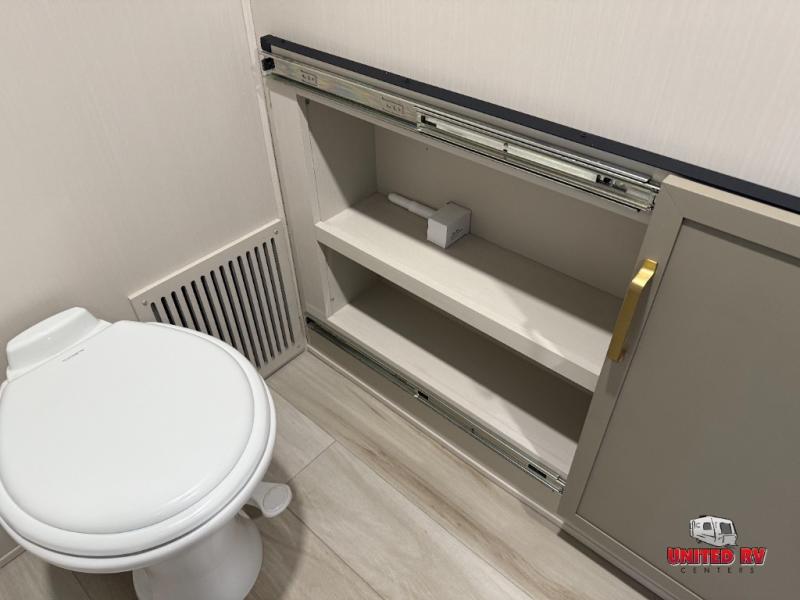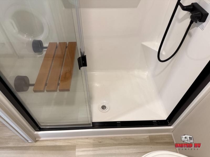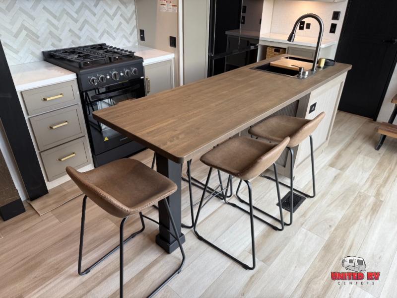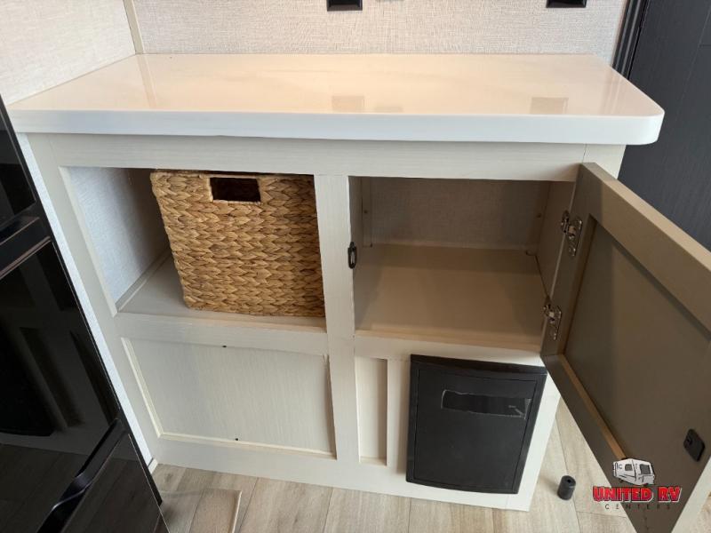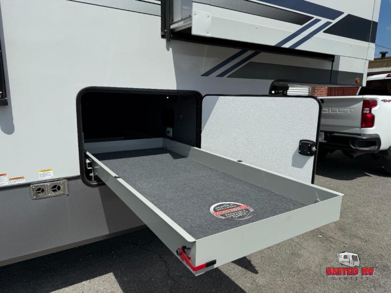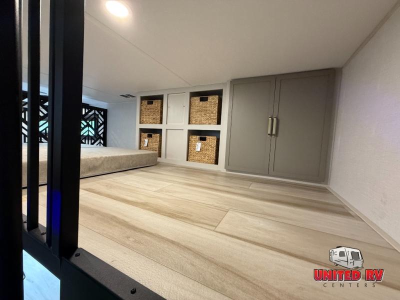 Introducing a new RV of its kind, the ROOST43 is a destination-style fifth wheel you are sure to love! There are two levels, making it feel more like home, and you can sleep six to eight each night. The master bedroom includes a custom king bed slide out, a 32" TV and fireplace, a desk/vanity, plus a half bath for convenience. A custom king-size bed is also found in the front loft, and there are storage cubbies plus a coax/110V outlet here to plug in chargers or a laptop. The second loft in the back includes spiral stairs, two bunk mats, a wardrobe, and cubby cubes here also for your guests' things. Some of the stand-out features you'll find on the first level are the sectional sofa with a coffee table, an entertainment center with a 65" TV, a kitchen island with five chairs, and a fully-equipped kitchen. The 20 cu. ft. 12V refrigerator and pull-out pantry will let you stock up on food, and the kitchen hutch will be perfect for nice dishes. The full bath on this model is one to remember; there is a one-piece fiberglass shower with a teak seat, a flip-up shelf and a washer/dryer, a backlit mirror, and more. And we haven't even touched on the exterior features, such as the pull-out tray, outdoor refrigerators, 20' awning, and more!