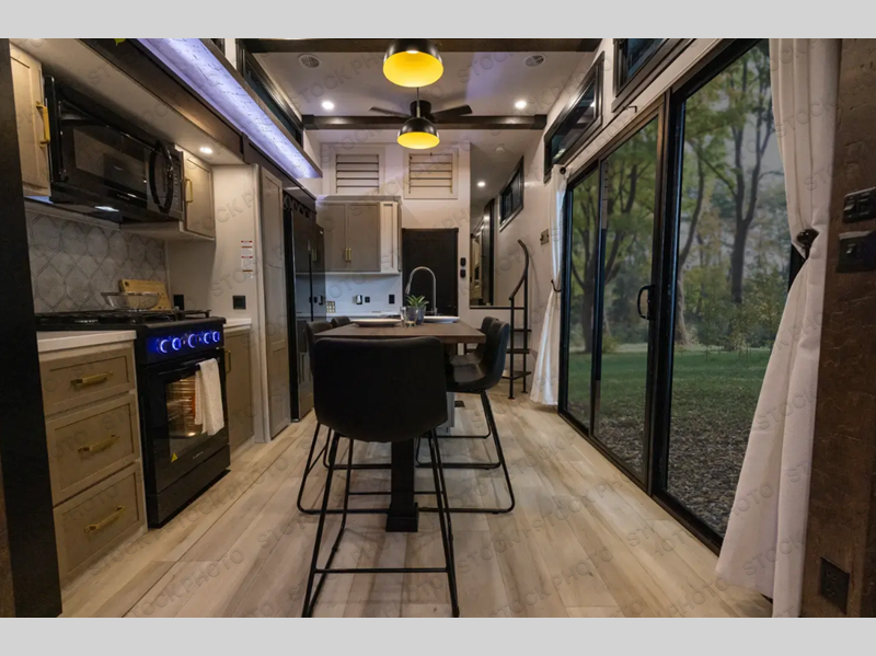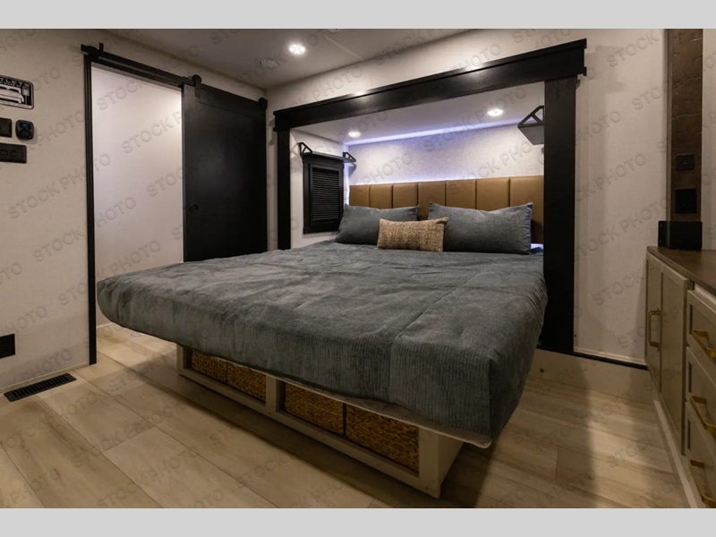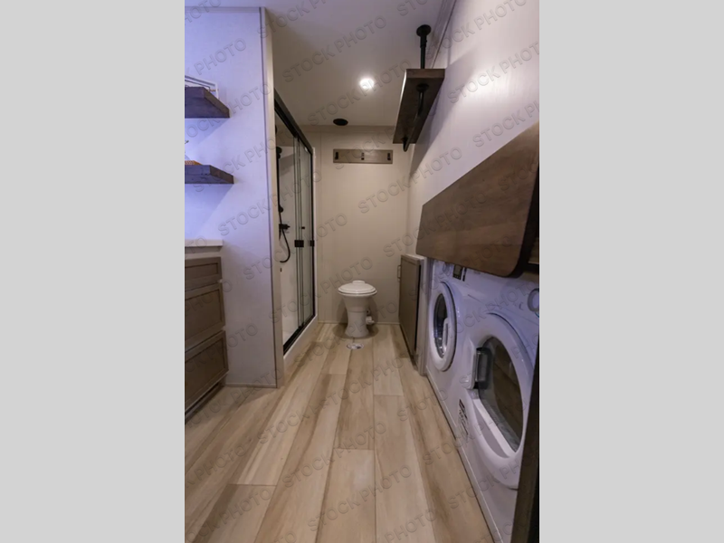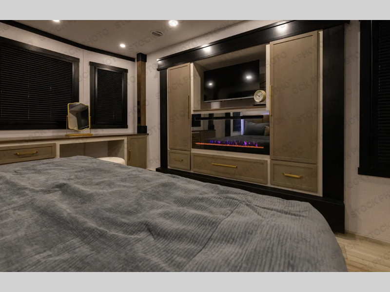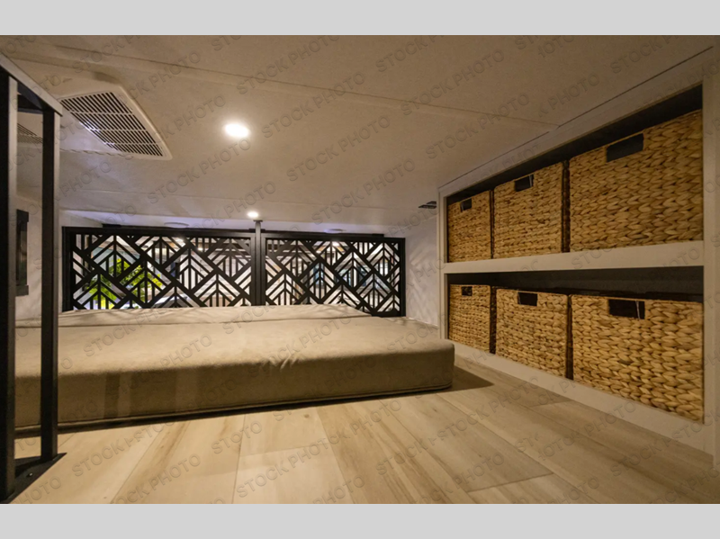 Introducing a new RV of its kind, the ROOST43 is a destination-style fifth wheel you are sure to love! There are two levels, making it feel more like home, and you can sleep six to eight each night. The master bedroom includes a custom king bed slide out, a 32" TV and fireplace, a desk/vanity, plus a half bath for convenience. A custom king-size bed is also found in the front loft, and there are storage cubbies plus a coax/110V outlet here to plug in chargers or a laptop. The second loft in the back includes spiral stairs, two bunk mats, a wardrobe, and cubby cubes here also for your guests' things. Some of the stand-out features you'll find on the first level are the sectional sofa with a coffee table, an entertainment center with a 65" TV, a kitchen island with five chairs, and a fully-equipped kitchen. The 20 cu. ft. 12V refrigerator and pull-out pantry will let you stock up on food, and the kitchen hutch will be perfect for nice dishes. The full bath on this model is one to remember; there is a one-piece fiberglass shower with a teak seat, a flip-up shelf and a washer/dryer, a backlit mirror, and more. And we haven't even touched on the exterior features, such as the pull-out tray, outdoor refrigerators, 20' awning, and more!