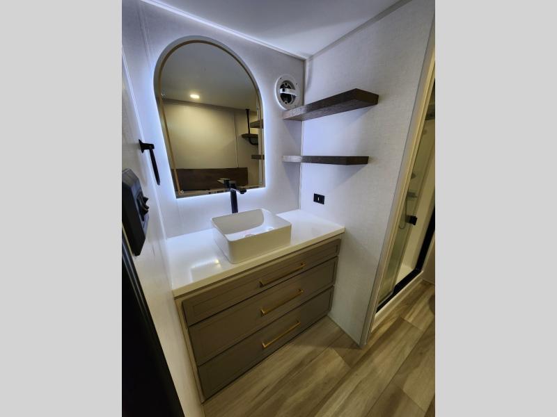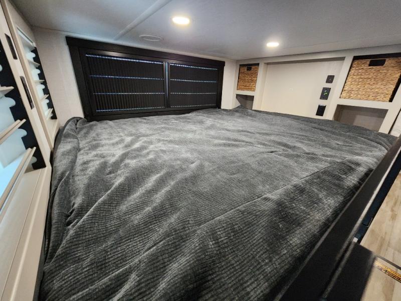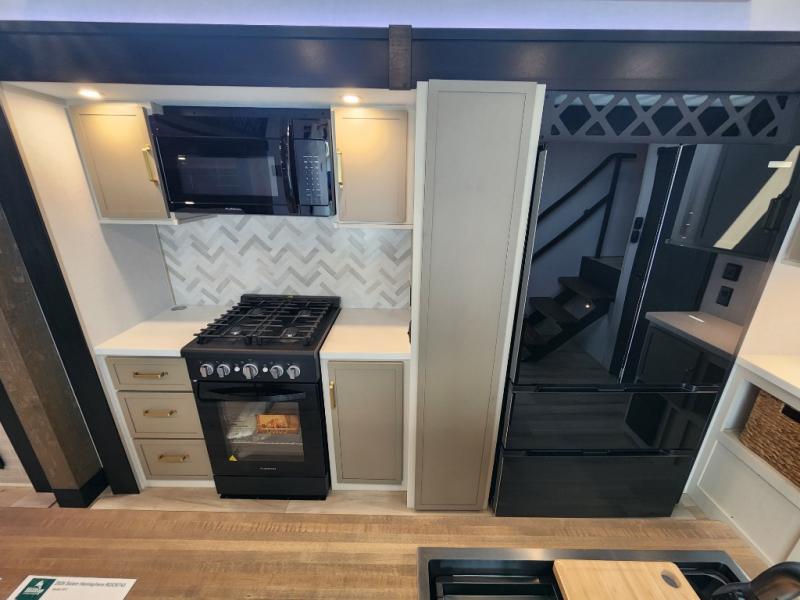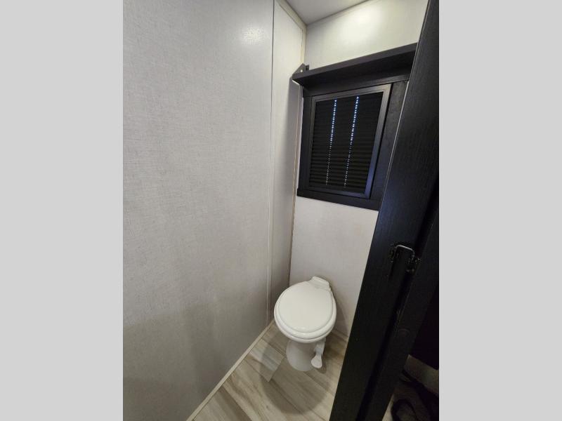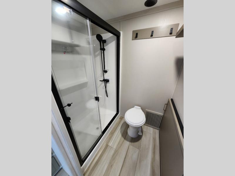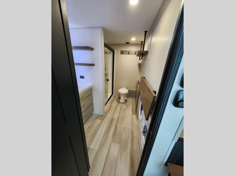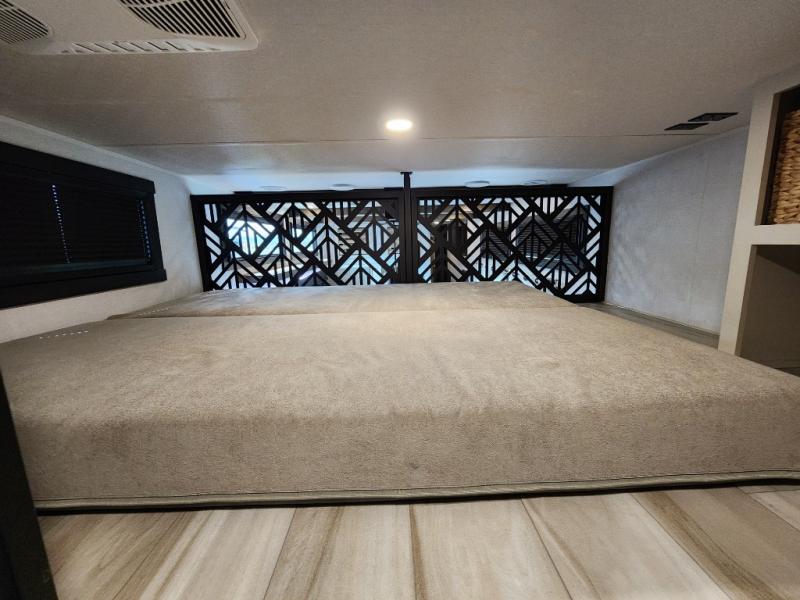 The Salem Hemisphere ROOST fifth wheels resemble a destination trailer that will be giving you residential vibes! The premium Alley Grey high-gloss gel coat fiberglass sidewalls are ultra sleek, and the flat pitched roof sheds water to the off-door side for added comfort. A Race Track A/C duct system provides maximum cooling, and the AccessiBelly underbelly with 12V tank heaters on all holding tanks will help extend your camping season. There are high-end solid surface and maple-stained wood countertops inside, along with residential-inspired wood door casings, and 6' 8" clearance in all rooms, excluding lofts. Additional features include a Gun Metal grey kitchen sink, backlit mirrors in the bathrooms, motion sensor lights by the spiral stair cases, and back up camera prep if you want the option to make parking easier than ever.