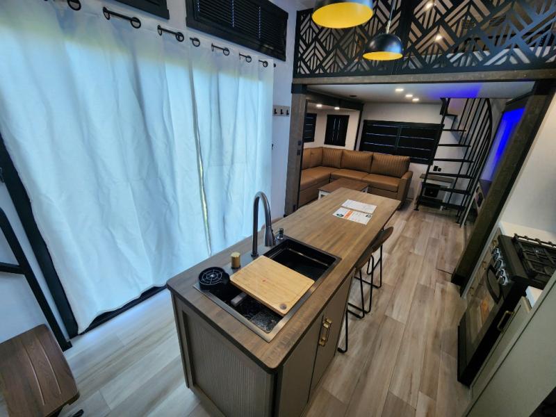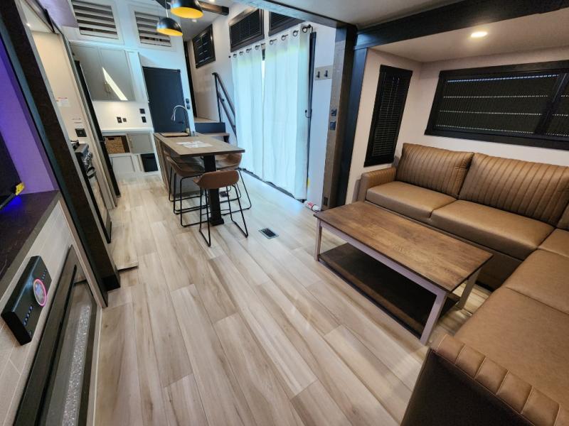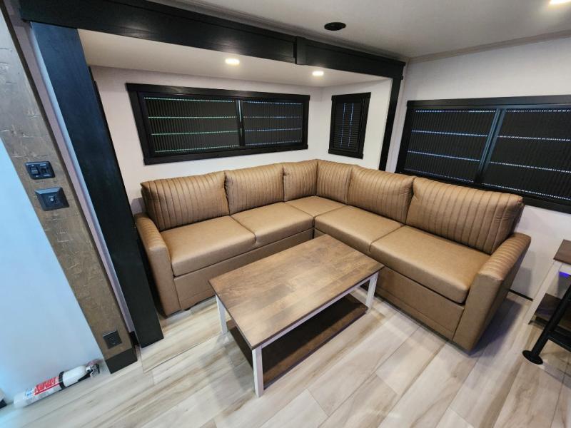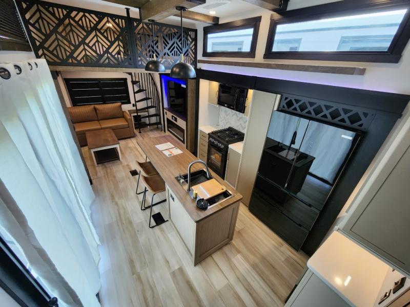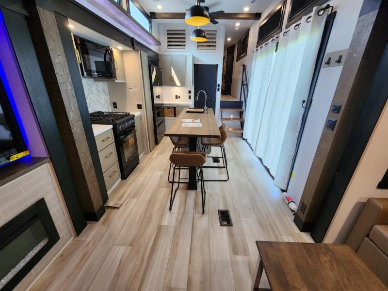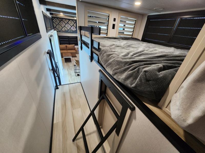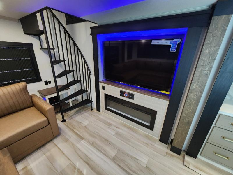 Introducing a new RV of its kind, the ROOST43 is a destination-style fifth wheel you are sure to love! There are two levels, making it feel more like home, and you can sleep six to eight each night. The master bedroom includes a custom king bed slide out, a 32" TV and fireplace, a desk/vanity, plus a half bath for convenience. A custom king-size bed is also found in the front loft, and there are storage cubbies plus a coax/110V outlet here to plug in chargers or a laptop. The second loft in the back includes spiral stairs, two bunk mats, a wardrobe, and cubby cubes here also for your guests' things. Some of the stand-out features you'll find on the first level are the sectional sofa with a coffee table, an entertainment center with a 65" TV, a kitchen island with five chairs, and a fully-equipped kitchen. The 20 cu. ft. 12V refrigerator and pull-out pantry will let you stock up on food, and the kitchen hutch will be perfect for nice dishes. The full bath on this model is one to remember; there is a one-piece fiberglass shower with a teak seat, a flip-up shelf and a washer/dryer, a backlit mirror, and more. And we haven't even touched on the exterior features, such as the pull-out tray, outdoor refrigerators, 20' awning, and more!