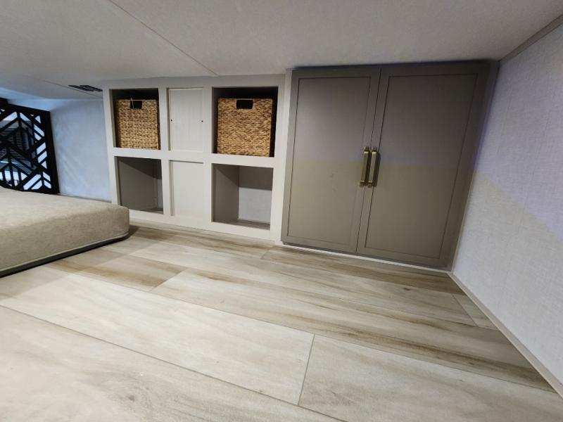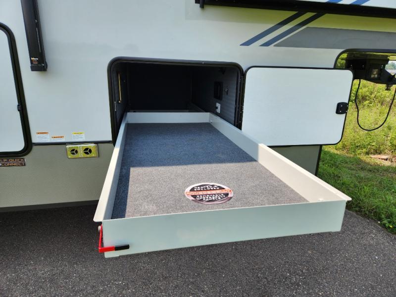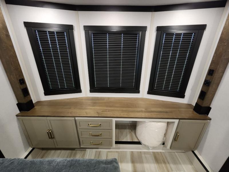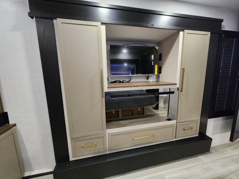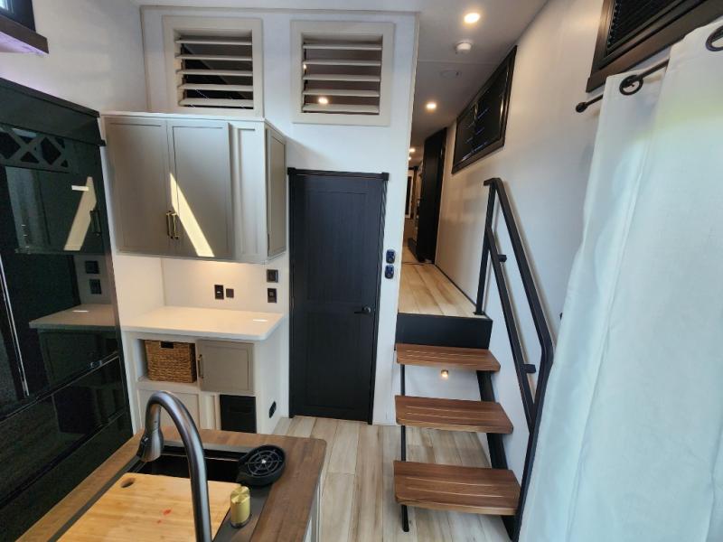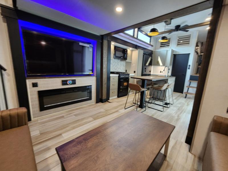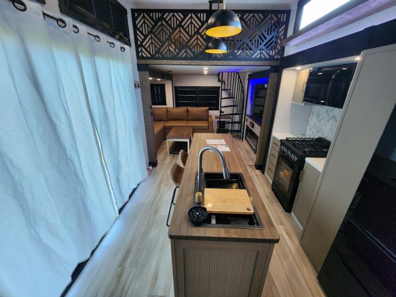 Introducing a new RV of its kind, the ROOST43 is a destination-style fifth wheel you are sure to love! There are two levels, making it feel more like home, and you can sleep six to eight each night. The master bedroom includes a custom king bed slide out, a 32" TV and fireplace, a desk/vanity, plus a half bath for convenience. A custom king-size bed is also found in the front loft, and there are storage cubbies plus a coax/110V outlet here to plug in chargers or a laptop. The second loft in the back includes spiral stairs, two bunk mats, a wardrobe, and cubby cubes here also for your guests' things. Some of the stand-out features you'll find on the first level are the sectional sofa with a coffee table, an entertainment center with a 65" TV, a kitchen island with five chairs, and a fully-equipped kitchen. The 20 cu. ft. 12V refrigerator and pull-out pantry will let you stock up on food, and the kitchen hutch will be perfect for nice dishes. The full bath on this model is one to remember; there is a one-piece fiberglass shower with a teak seat, a flip-up shelf and a washer/dryer, a backlit mirror, and more. And we haven't even touched on the exterior features, such as the pull-out tray, outdoor refrigerators, 20' awning, and more!