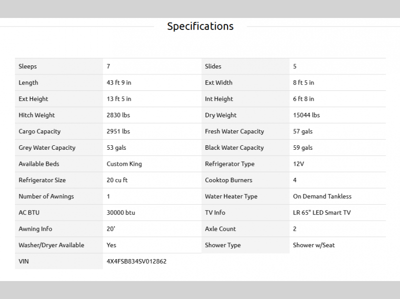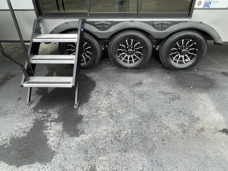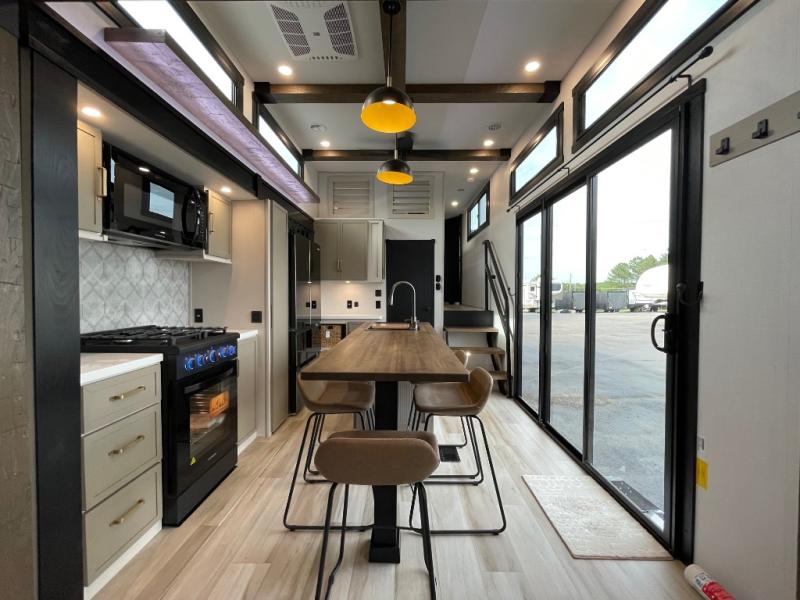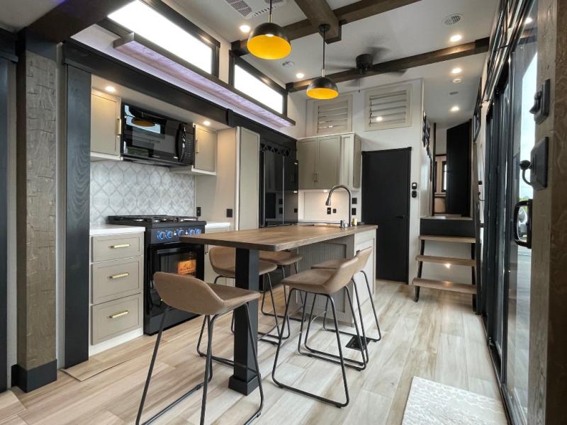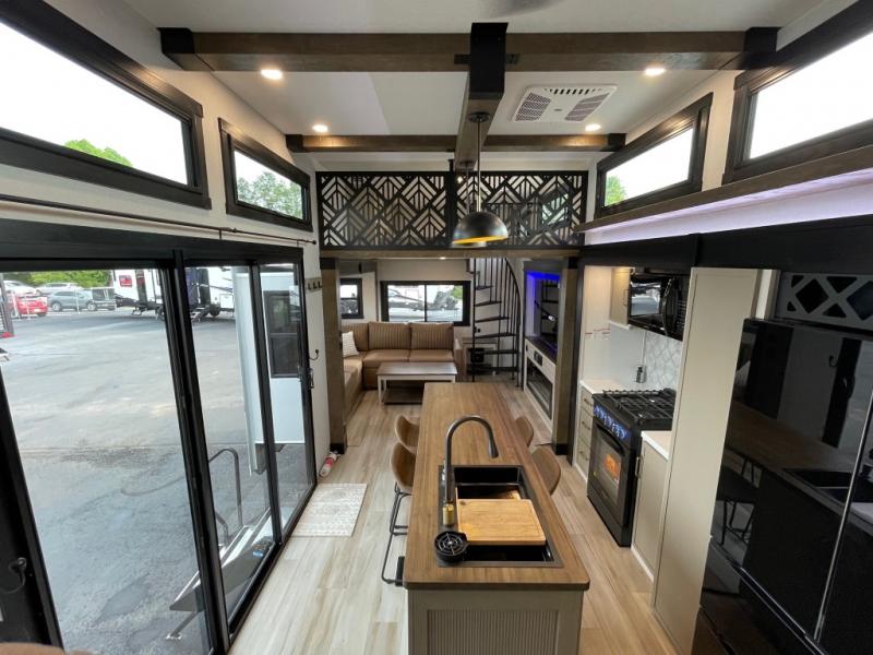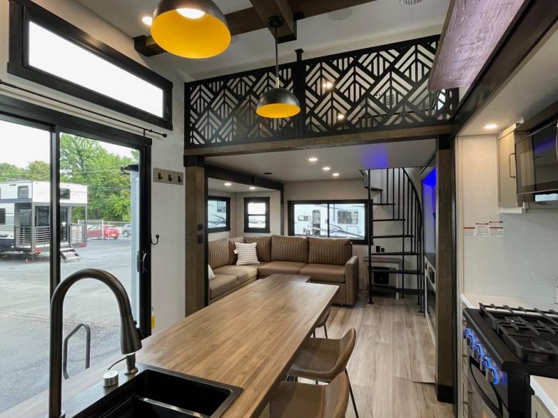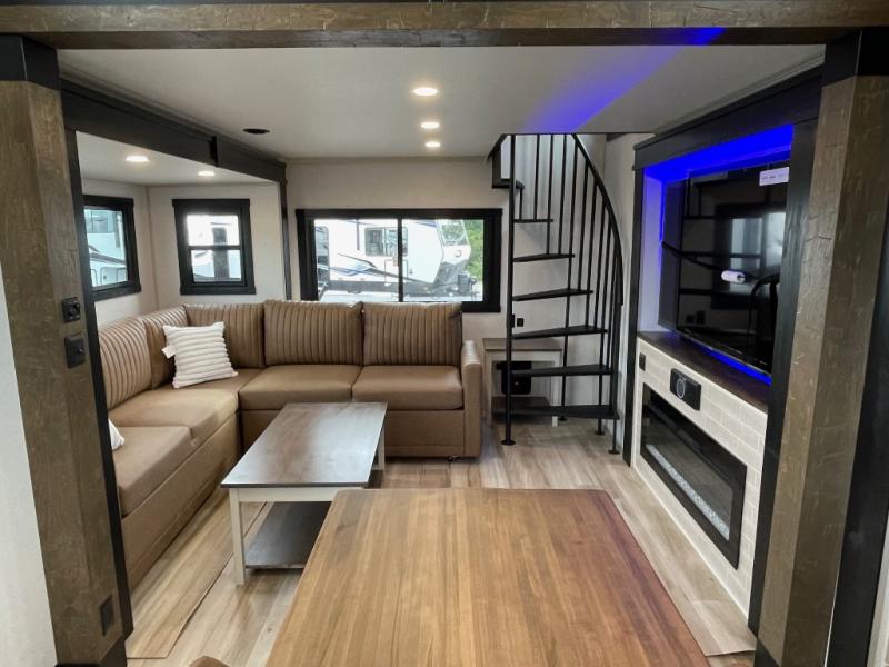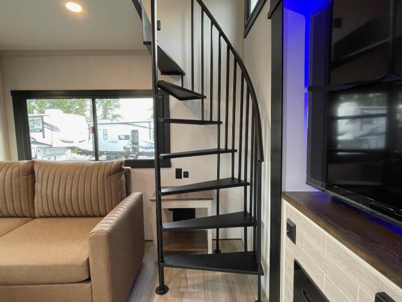 Introducing a new RV of its kind, the ROOST43 is a destination-style fifth wheel you are sure to love! There are two levels, making it feel more like home, and you can sleep six to eight each night. The master bedroom includes a custom king bed slide out, a 32" TV and fireplace, a desk/vanity, plus a half bath for convenience. A custom king-size bed is also found in the front loft, and there are storage cubbies plus a coax/110V outlet here to plug in chargers or a laptop. The second loft in the back includes spiral stairs, two bunk mats, a wardrobe, and cubby cubes here also for your guests' things. Some of the stand-out features you'll find on the first level are the sectional sofa with a coffee table, an entertainment center with a 65" TV, a kitchen island with five chairs, and a fully-equipped kitchen. The 20 cu. ft. 12V refrigerator and pull-out pantry will let you stock up on food, and the kitchen hutch will be perfect for nice dishes. The full bath on this model is one to remember; there is a one-piece fiberglass shower with a teak seat, a flip-up shelf and a washer/dryer, a backlit mirror, and more. And we haven't even touched on the exterior features, such as the pull-out tray, outdoor refrigerators, 20' awning, and more!