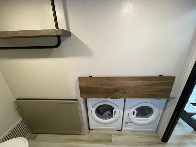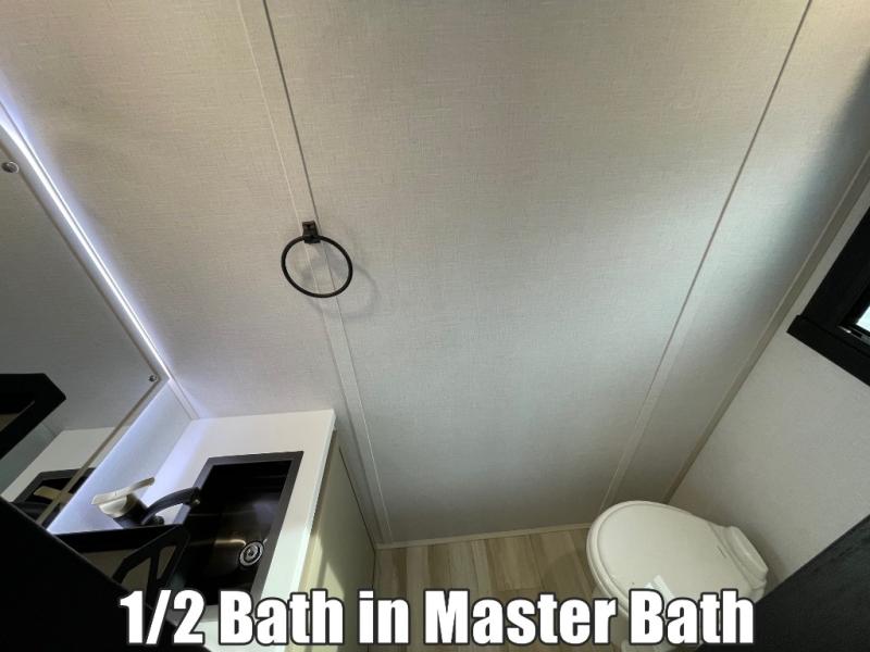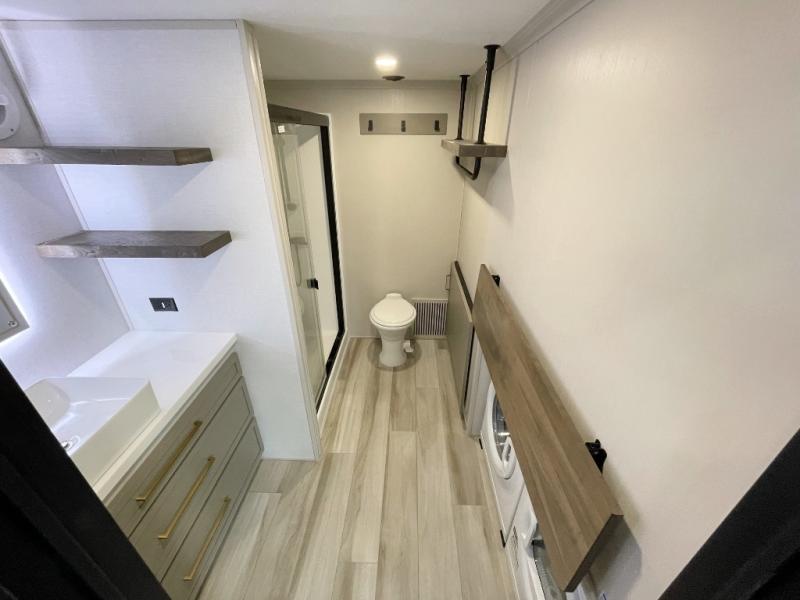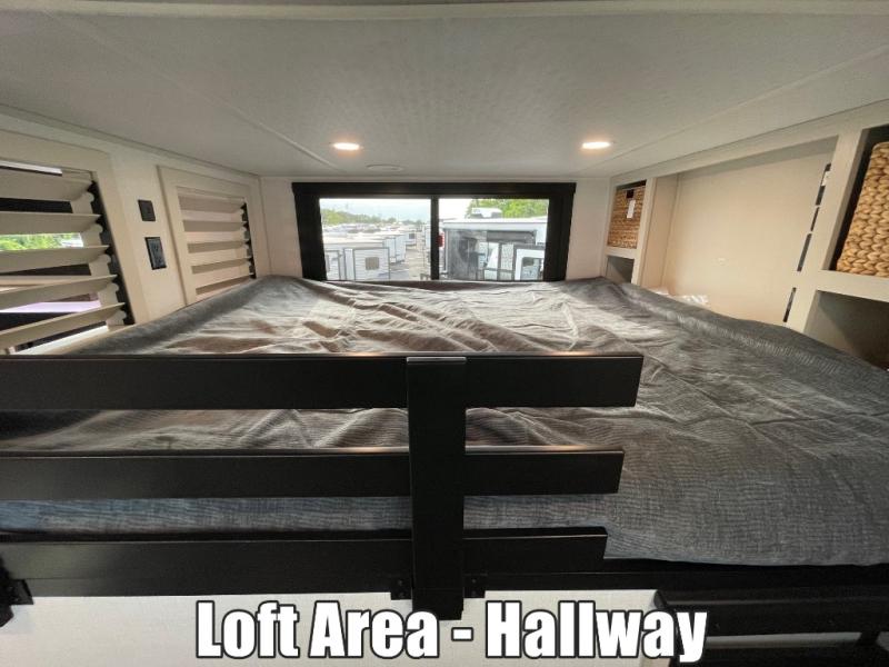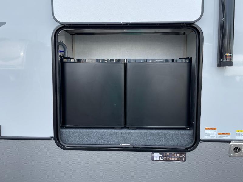 The Salem Hemisphere ROOST fifth wheels resemble a destination trailer that will be giving you residential vibes! The premium Alley Grey high-gloss gel coat fiberglass sidewalls are ultra sleek, and the flat pitched roof sheds water to the off-door side for added comfort. A Race Track A/C duct system provides maximum cooling, and the AccessiBelly underbelly with 12V tank heaters on all holding tanks will help extend your camping season. There are high-end solid surface and maple-stained wood countertops inside, along with residential-inspired wood door casings, and 6' 8" clearance in all rooms, excluding lofts. Additional features include a Gun Metal grey kitchen sink, backlit mirrors in the bathrooms, motion sensor lights by the spiral stair cases, and back up camera prep if you want the option to make parking easier than ever.