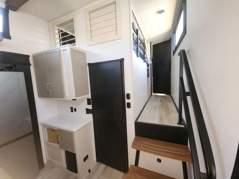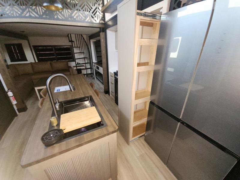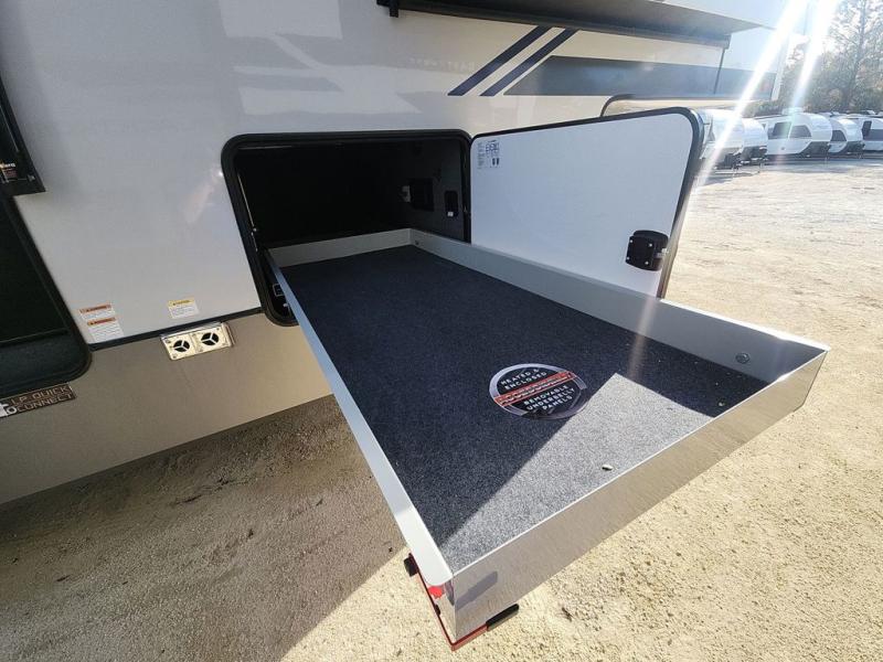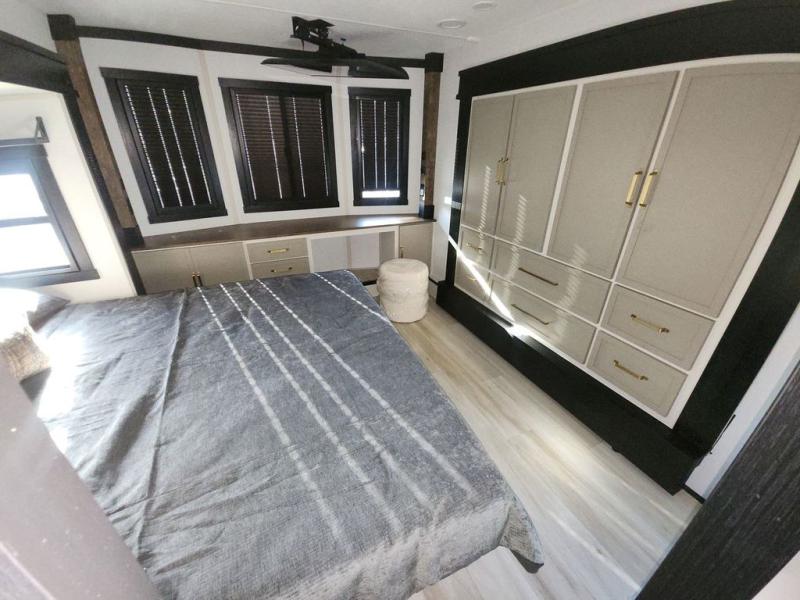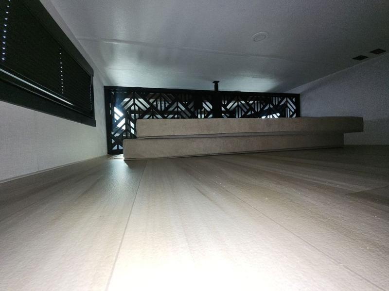 Introducing a new RV of its kind, the ROOST43 is a destination-style fifth wheel you are sure to love! There are two levels, making it feel more like home, and you can sleep six to eight each night. The master bedroom includes a custom king bed slide out, a 32" TV and fireplace, a desk/vanity, plus a half bath for convenience. A custom king-size bed is also found in the front loft, and there are storage cubbies plus a coax/110V outlet here to plug in chargers or a laptop. The second loft in the back includes spiral stairs, two bunk mats, a wardrobe, and cubby cubes here also for your guests' things. Some of the stand-out features you'll find on the first level are the sectional sofa with a coffee table, an entertainment center with a 65" TV, a kitchen island with five chairs, and a fully-equipped kitchen. The 20 cu. ft. 12V refrigerator and pull-out pantry will let you stock up on food, and the kitchen hutch will be perfect for nice dishes. The full bath on this model is one to remember; there is a one-piece fiberglass shower with a teak seat, a flip-up shelf and a washer/dryer, a backlit mirror, and more. And we haven't even touched on the exterior features, such as the pull-out tray, outdoor refrigerators, 20' awning, and more!