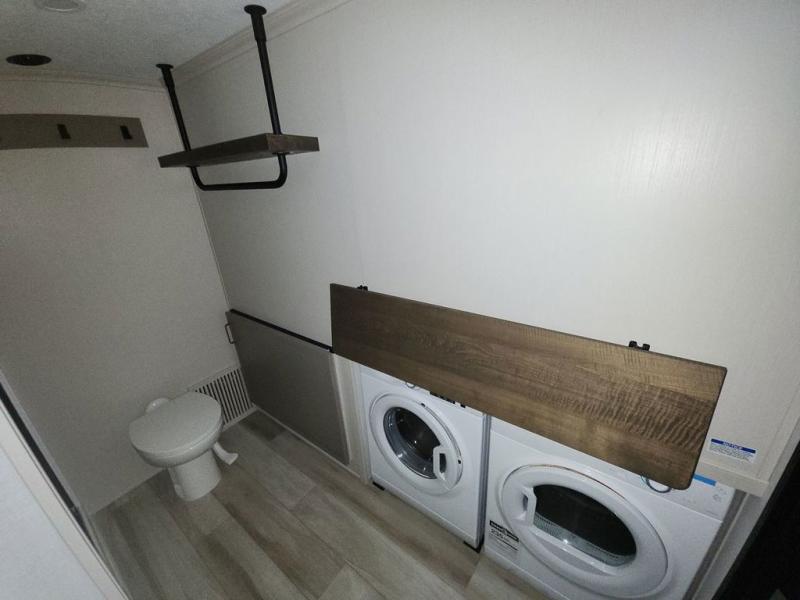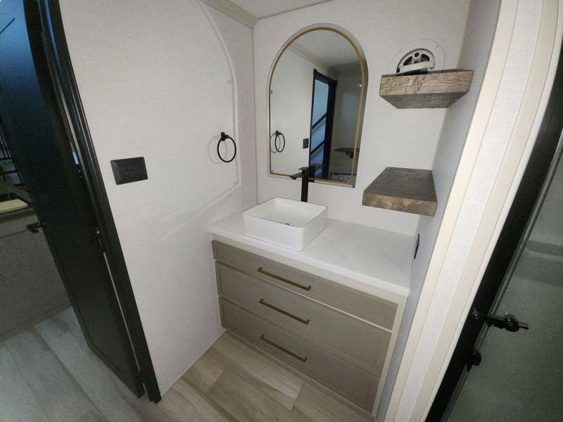 The Salem Hemisphere ROOST fifth wheels resemble a destination trailer that will be giving you residential vibes! The premium Alley Grey high-gloss gel coat fiberglass sidewalls are ultra sleek, and the flat pitched roof sheds water to the off-door side for added comfort. A Race Track A/C duct system provides maximum cooling, and the AccessiBelly underbelly with 12V tank heaters on all holding tanks will help extend your camping season. There are high-end solid surface and maple-stained wood countertops inside, along with residential-inspired wood door casings, and 6' 8" clearance in all rooms, excluding lofts. Additional features include a Gun Metal grey kitchen sink, backlit mirrors in the bathrooms, motion sensor lights by the spiral stair cases, and back up camera prep if you want the option to make parking easier than ever.